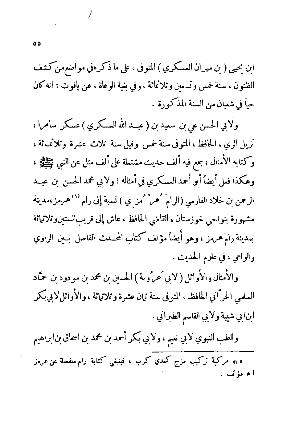 ولأبي الحسن علي بن سعيد بن عبد الله العسكري عسكر سامرا نزيل الري الحافظ المتوفى: سنة خمس وقيل: سنة ثلاث عشرة وثلاثمائة وكتابه الأمثال جمع فيه ألف حديث مشتملة على ألف مثل عن النبي صلى الله عليه وسلم وهكذا فعل أيضا أبو أحمد العسكري في أمثاله ولأبي محمد الحسن بن عبد الرحمن بن خلاد الفارسي الرام هرمزي نسبة إلى رام1 هرمز مدينة مشهورة بنواحي خوزستان القاضي الحافظ عاش إلى قريب الستين وثلاثمائة بمدينة رام هرمز وهو أيضا مؤلف كتاب المحدث الفاصل بين الراوي والواعي في علوم الحديث.