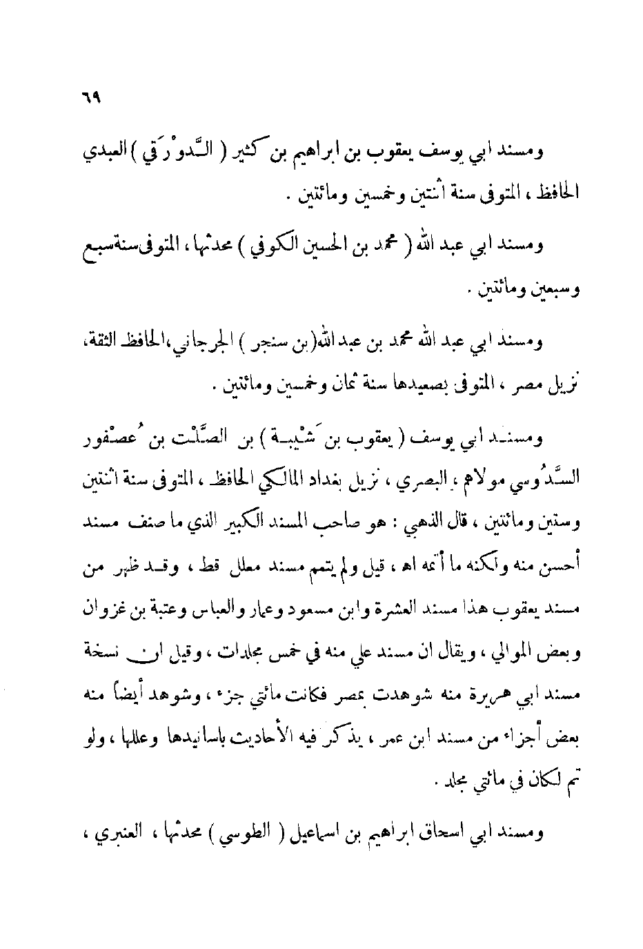 ومسند أبي يوسف يعقوب بن إبراهيم بن كثير الدورقي العبدي الحافظ المتوفى: سنة اثنتين وخمسين ومائتين.