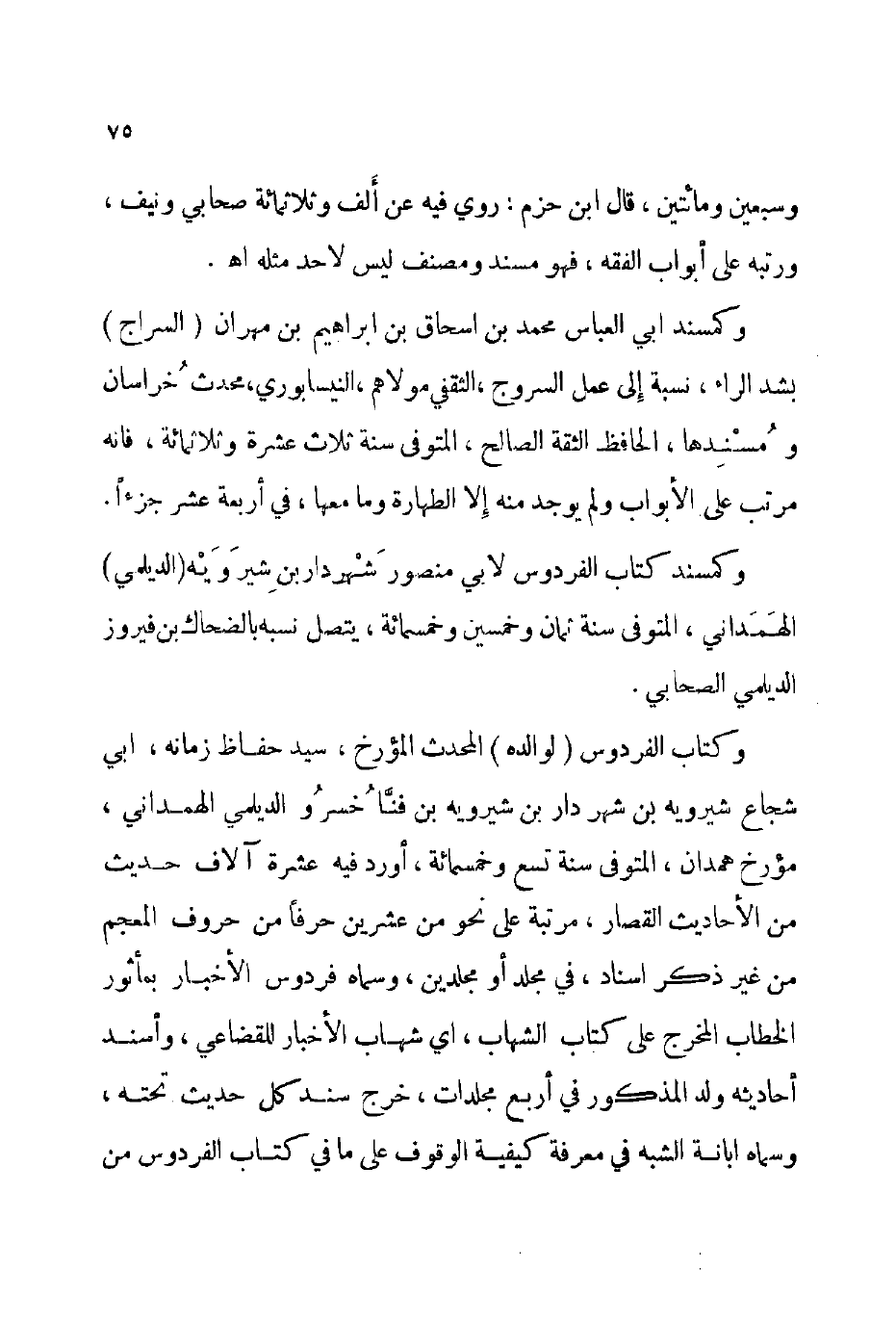 وكمسند كتاب الفردوس لأبي منصور شهردار بن شيرويه الديلمي الهمداني المتوفى: سنة ثمان وخمسين وخمسمائة يتصل نسبه بالضحاك بن فيروز الديلمي الصحابي.