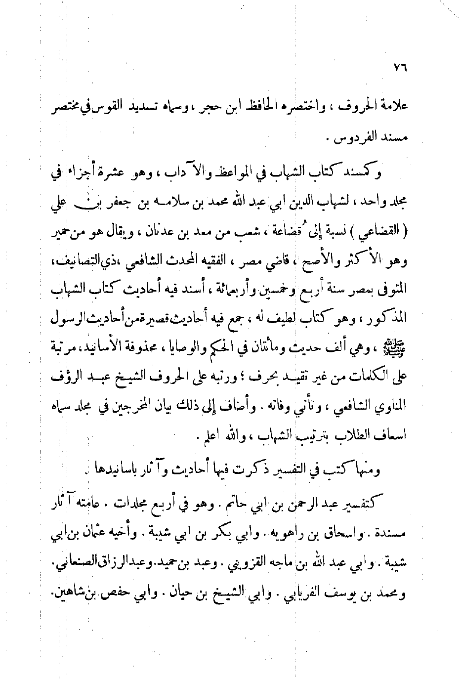 وكمسند كتاب الشهاب في المواعظ والآداب وهو عشرة أجزاء في مجلد واحد لشهاب الدين أبي عبد الله محمد بن سلامه بن جعفر بن علي القضاعي نسبة إلى قضاعة شعب من معد بن عدنان ويقال: هو من حمير وهو الأكثر والأصح قاضي مصر الفقيه المحدث الشافعي ذي التصانيف المتوفى: بمصر سنة أربع وخمسين وأربعمائة أسند فيه أحاديث كتاب الشهاب المذكور وهو كتاب لطيف له جمع فيه أحاديث قصيرة من أحاديث الرسول - صلى عليه وسلم - وهي ألف حديث ومائتان في الحكم والوصايا محذوفة الأسانيد مرتبة على الكلمات من غير تقيد بحرف ورتبه على الحروف الشيخ عبد الرؤوف المناوي الشافعي وتأتي وفاته. وأضاف إلى ذلك بيان المخرجين في مجلد سماه: إسعاف الطلاب بترتيب الشهاب والله أعلم.