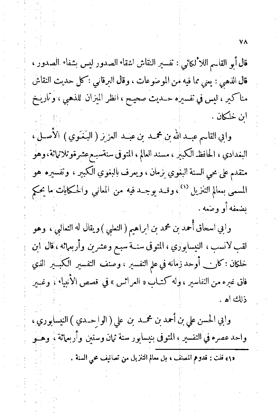 وأبي القاسم عبد الله بن محمد بن عبد العزيز البغوي الأصل البغدادي الحافظ الكبير مسند العالم المتوفى: سنة سبع عشرة وثلاثمائة وهو متقدم على محي السنة البغوي بزمان ويعرف بالبغوي الكبير وتفسيره هو المسمى بمعالم التنزيل1 وقد يوجد فيه من المعاني والحكايات ما يحكم بضعفه أو وضعه.