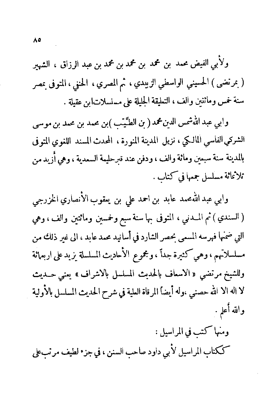 وأبي عبد الله محمد عابد بن أحمد علي بن يعقوب الأنصاري الخزرجي السندي ثم المدني المتوفى بها: سنة سبع وخمسين ومائتين وألف وهي التي ضمنها فهرسه المسمى: بحصر الشارد في أسانيد محمد عابد إلى غير ذلك من مسلسلاتهم وهي كثيرة جدا ومجموع الأحاديث المسلسلة يزيد على أربعمائة وللشيخ مرتضي الإسعاف بالحديث المسلسل بالأشراف يعني: حديث لا إله إلا الله حصني وله أيضا المرقاة العلية في شرح الحديث المسلسل بالأولية والله أعلم.