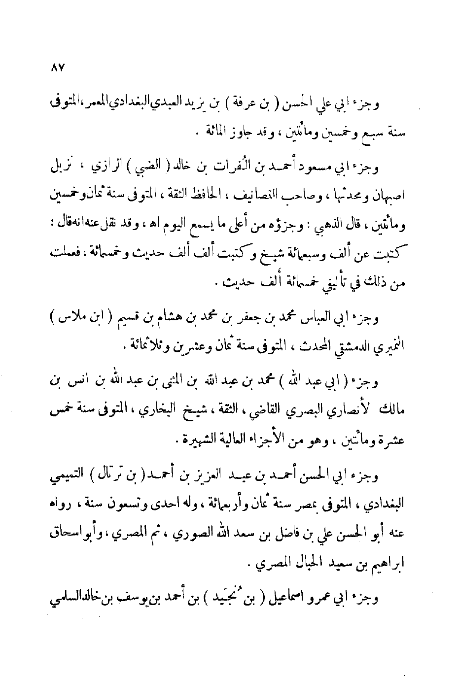وجزء أبي مسعود أحمد بن الفرات بن خالد الضبي الرازي نزيل أصبهان ومحدثها وصاحب التصانيف الحافظ الثقة المتوفى: سنة ثمان وخمسين ومائتين قال الذهبي: وجزؤه من أعلى ما يسمع اليوم اه وقد نقل عنه أنه قال: كتبت عن ألف وسبعمائة شيخ وكتبت ألف ألف حديث وخمسمائة فعملت من ذلك في تأليفي خمسمائة ألف حديث.