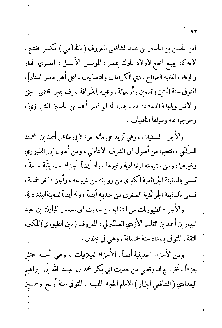 والأجزاء السلفيات وهي تزيد على مائة جزء لأبي طاهر أحمد بن محمد السلفي انتخبها من أصول ابن الشرف الأنماطي ومن أصول ابن الطيوري وغيرهما ومن مشيخته البغدادية وغيرها وله أيضا أجزاء حديثية سبعة تسمى بالسفينة الجرائدية الكبرى من روايته عن شيوخه وأجزاء آخر خمسة تسمى: بالسفينة الجرائدية الصغرى من حديثه أيضا وله أيضا السفينة البغدادية.