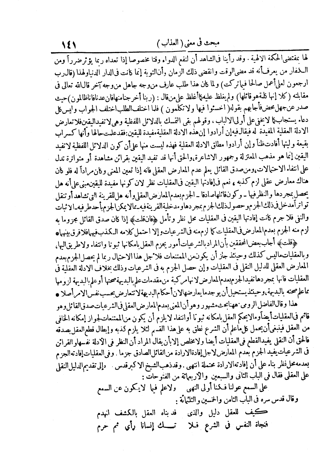 لها بمقتضى الحكمة الإلهية وقد رأينا في الشاهد أن لنفع الدواء وقتا مخصوصا إذا تعداه ربما يؤثر ضررا ومن الكفار من يعرف أنه قد مضى الوقت وانقضى ذلك الزمان وأن التوبة إنما كانت في الدار الدنيا ولهذا قال رب ارجعون لعلي أعمل صالحا فيما تركت ولما كان هذا طلب عارف من وجه جاهل من وجه آخر قال الله تعالى في مقابلته كلا إنها كلمة هو قائلها ولم يغلظ عليه كما أغلظ على من قال ربنا أخرجنا منها فإن عدنا فإنا ظالمون حيث صدر عن جهل محض فأجابهم بقوله اخسئوا فيها ولا تكلمون فلما اختلف الطلب اختلف الجواب وليس كل دعاء يستجاب كما لا يخفى على أولي الألباب وقولهم بقي التمسك بالدلائل اللفظية وهي لا تفيد اليقين فلا تعارض الأدلة العقلية المفيدة له فيقال فيه إن أرادوا إن هذه الأدلة العقلية مفيدة لليقين فقد علمت حالها وأنها كسراب بقيعة وليتها أفادت ظنا وإن أرادوا مطلق الأدلة العقلية فهذه ليست منها على أن كون الدلائل اللفظية لا تفيد اليقين إنما هو مذهب المعتزلة وجمهور الأشاعرة والحق أنها قد تفيد اليقين بقرائن مشاهدة أو متواترة تدل على انتفاء الإحتمالات ومن صدق القائل يعلم عدم المعارض العقلي فإنه إذا تعين المعنى وكان مرادا له فلو كان هناك معارض عقلي لزم كذبه نعم في إفادتها اليقين في العقليات نظر لأن كونها مفيدة لليقين مبني على أنه هل يحصل بمجردها والنظر فيها وكون قائلها صادقا الجزم بعدم المعارض العقلي وأنه هل للقرينة التي تشاهد أو تنقل تواترا مدخل في ذلك الجزم وحصول ذلك الجزم بمجردها ومدخلية القرينة فيه مما لا يمكن الجزم بأحد طرفيه الإثبات والنفي فلا جرم كانت إفادتها اليقين في العقليات محل نظر وتأمل فإن قلت إذا كان صدق القائل مجزوما به لزم منه الجزم قلت بعدم المعارض في العقليات كما لزم منه في الشرعيات وإلا احتمل كلامه الكذب فيهما فلا فرق بينهما