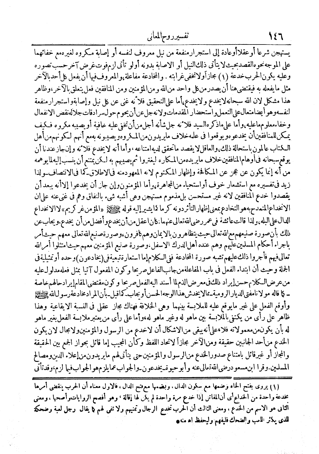 يستهجن شرعا أو عقلا أو عادة إلى استجرار منفعة من نيل معروف لنفسه أو إصابة مكروه لغيره مع خفائهما على الموجه نحوه القصد بحيث لا يتأتى ذلك النيل أو الإصابة بدونه أو لو تأتي لزم فوت غرض آخر حسب تصوره وعليه يكون الحرب خدعة مجازا ولا تخفى غرابته والمخادعة مفاعلة والمعروف فيها أن يفعل كل أحد بالآخر مثل ما يفعله به فيقتضي هنا أن يصدر من كل واحد من الله ومن المؤمنين ومن المنافقين فعل يتعلق بالآخر وظاهر هذا مشكل لأن الله سبحانه لا يخدع ولا يخدع أما على التحقيق فلأنه غني عن كل نيل وإصابة واستجرار منفعة لنفسه وهو أيضا متعال على التعمل واستحضار المقدمات ولأنه جل عن أن يحوم حول سرادقات جلاله نقص الإنفعال وخفاء معلوم ما عليه وأما على ما ذكره السيد فلأنه جل شأنه أجل من أن تخفى عليه خافية أو يصيبه مكروه فكيف يمكن للمنافقين أن يخدعوه ويوقعوا في علمه خلاف ما يريدون من المكروه ويصيبونه به مع أنهم لكونهم من أهل الكتاب عالمون باستحالة ذلك والعاقل لا يقصد ما تحقق لديه امتناعه وأما أنه لا يخدع فلأنه وإن جاز عندنا أن يوقع سبحانه في أوهام المنافقين خلاف ما يريده من المكاره ليغتروا ثم يصيبهم به لكن يمتنع أن ينسب إليه لما يوهمه من أنه إنما يكون عن عجز عن المكافحة وإظهار المكتوم لأنه المعهود منه في الإطلاق كما في الإنتصاف ولذا زيد في تفسيره مع استشعار خوف أو استحياء من المجاهرة وأما المؤمنون وإن جاز أن يخدعوا إلا أنه يبعد أن يقصدوا خدع المنافقين لأنه غير مستحسن بل مذموم مستهجن وهي أشبه شيء بالنفاق وهم في غنى عنه على أن الإنخداع المتمدح به هو التخادع بمعنى إظهار التأثر دونه كرما كما يشير إليه قوله صلى الله عليه و سلم المؤمن غر كريم لا الإنخداع الدال على البله ولذا قالت عائشة في عمر رضي الله تعالى عنهما كان أعقل من أن يخدع وأفضل من أن يخدع ويجاب عن ذلك بأن صورة صنيعهم مع الله تعالى حيث يتظاهرون بالإيمان وهم كافرون وصورة صنيع الله تعالى معهم حيث أمر بإجراء أحكام المسلمين عليهم وهم عنده أهل الدرك الأسفل وصورة صنيع المؤمنين معهم حيث امتثلوا أمر الله تعالى فيهم فأجروا ذلك عليهم تشبه صورة المخادعة ففي الكلام إما استعارة تبعية في يخادعون وحده أو تمثيلية في الجملة وحيث أن ابتداء الفعل في باب المفاعلة من جانب الفاعل صريحا وكون المفعول آتيا بمثل فعله مدلول عليه من عرض الكلام حسن إيراد ذلك في معرض الذم لما أسند إليه الفعل صريحا وكون مقتضى المقام إيراد حالهم خاصة كما قاله مولانا مفتي الديار الرومية مما لا يخدش هذا الوجه الحسن أو يجاب كما قيل بأن المراد مخادعة رسول الله صلى الله عليه وآله سلم وأوقع الفعل على غير ما يوقع عليه للملابسة بينهما وهي الخلافة فهناك مجاز عقلي في النسبة الإيقاعية وهذا ظاهر على رأي من يكتفي بالملابسة بين ما هو له وغير ما هو له وأما على رأي من يعتبر ملابسة الفعل بغير ما هو له بأن يكون من معمولاته فلا على أنه يبقى من الإشكال أن لا خدع من الرسول والمؤمنين ولا مجال لأن يكون الخدع من أحد الجانبين حقيقة ومن الآخر مجازا لاتحاد اللفظ وكأن المجيب إما قائل بجواز الجمع بين الحقيقة والمجاز أو غير قائل بامتناع صدور الخدع من الرسول والمؤمنين حتى يتأتى لهم ما يريدون من إعلاء الدين ومصالح المسلمين وقرأ ابن مسعود رضي الله تعالى عنه وأبو حيوة يخدعون والجواب عما يلزم هو الجواب فيما لزم وقد تأتى