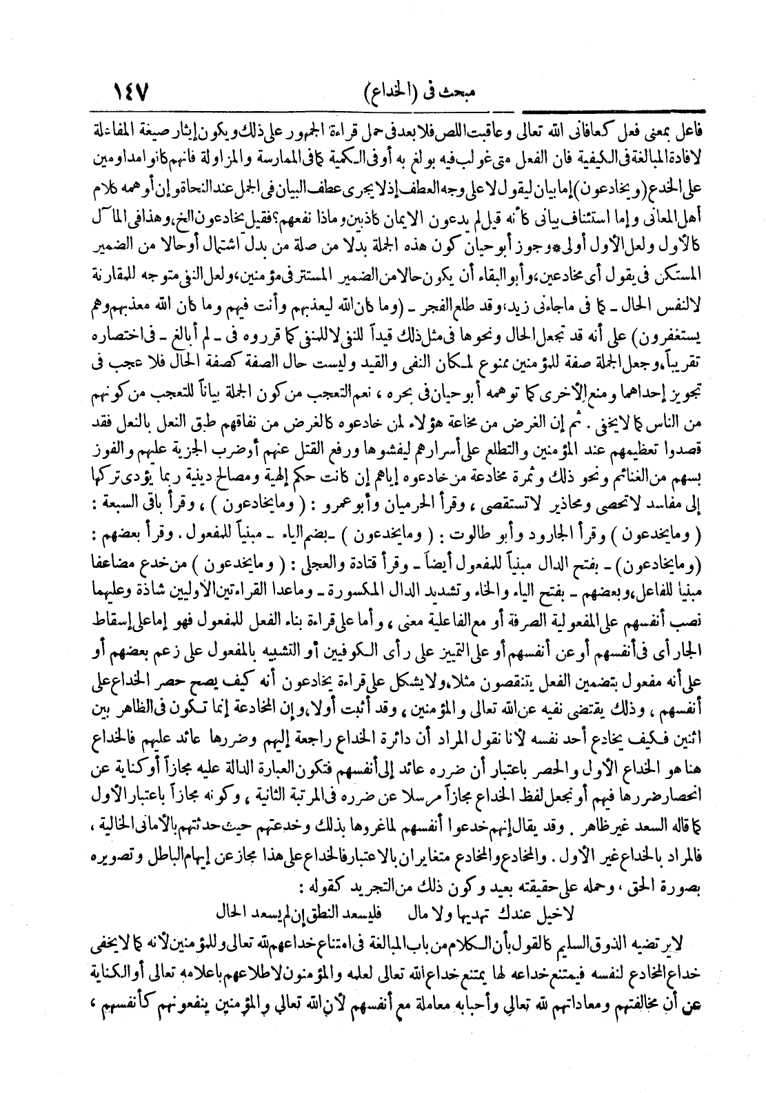 فاعل بمعنى فعل كعافاني الله تعالى وعاقبت اللص فلا بعد في حمل قراءة الجمهور على ذلك ويكون إيثار صيغة المفاعلة لإفادة المبالغة في الكيفية فإن الفعل متى غولب فيه بولغ به أو في الكمية كما في الممارسة والمزاولة فإنهم كانوا مداومين على الخدع ويخادعون إما بيان ليقول لا على وجه العطف إذ لا يجري عطف البيان في الجمل عند النحاة وإن أوهمه كلام أهل المعاني وإما استئناف بياني كأنه قيل لم يدعون الإيمان كاذبين وماذا نفعهم فقيل يخادعون الخ وهذا في المآل كالأول ولعل الأول أولى وجوز أبو حيان كون هذه الجملة بدلا من صلة من بدل اشتمال أو حالا من الضمير المستكن في يقول أي مخادعين وأبو البقاء أن يكون حالا من الضمير المستتر في مؤمنين ولعل النفي متوجه للمقارنة لا لنفس الحال كما في ما جاءني زيد وقد طلع الفجر وما كان الله ليعذبهم وأنت فيهم وما كان الله معذبهم وهم يستغفرون على أنه قد تجعل الحال ونحوها في مثل ذلك قيدا للنفي لا للمنفي كما قرروه في لم أبالغ في اختصاره تقريبا وجعل الجملة صفة للمؤمنين ممنوع لمكان النفي والقيد وليست حال الصفة كصفة الحال فلا عجب في تجويز إحداهما ومنع الأخرى كما توهمه أبو حيان في بحره نعم التعجب من كون الجملة بيانا للتعجب من كونهم من الناس كما لا يخفى ثم إن الغرض من مخادعة هؤلاء لمن خادعوه كالغرض من نفاقهم طبق النعل بالنعل فقد قصدوا تعظيمهم عند المؤمنين والتطلع على أسرارهم ليفشوها ورفع القتل عنهم أو ضرب الجزية عليهم والفوز بسهم من الغنائم ونحو ذلك وثمرة مخادعة من خادعوه إياهم إن كانت حكم إلهية ومصالح دينية ربما يؤدي تركها إلى مفساد لا تحصى ومحاذير لا تستقصى وقرأ الحرميان وأبو عمرو وما يخادعون وقرأ باقي السبعة وما يخدعون وقرأ الجارود وأبو طالوت وما يخدعون بضم الياء مبنيا للمفعول وقرأ بعضهم وما يخادعون بفتح الدال مبنيا للمفعول أيضا وقرأ قتادة والعجلي وما يخدعون من خدع مضاعفا مبنيا للفاعل وبعضهم بفتح الياء والخاء وتشديد الدال المكسورة وما عدا القراءتين الأوليين شاذة وعليهما نصب أنفسهم على المفعولية الصرفة أو مع الفاعلية معنى وأما على قراءة بناء الفعل للمفعول فهو إما على إسقاط الجار أي في أنفسهم أو عن أنفسهم أو على التمييز على رأي الكوفيين أو التشبيه بالمفعول على زعم بعضهم أو على أنه مفعول بتضمين الفعل يتنقصون مثلا ولا يشكل على قراءة يخادعون أنه كيف يصح حصر الخداع على أنفسهم وذلك يقتضي نفيه عن الله تعالى والمؤمنين وقد أثبت أولا وإن المخادعة إنما تكون في الظاهر بين اثنين فكيف يخادع أحد نفسه لأنا نقول المراد أن دائرة الخداع راجعة إليهم وضررها عائد عليهم فالخداع هنا هو الخداع الأول والحصر باعتبار أن ضرره عائد إلى أنفسهم فتكون العبارة الدالة عليه مجازا أو كناية عن انحصار ضررها فيهم أو نجعل لفظ الخداع مجازا مرسلا عن ضرره في المرتبة الثانية وكونه مجازا باعتبار الأول كما قاله السعد غير ظاهر وقد يقال إنهم خدعوا أنفسهم لما غروها بذلك وخدعتهم حيث حدثتهم بالأماني الخالية فالمراد بالخداع غير الأول والمخادع والمخادع متغايران بالإعتبار فالخداع على هذا مجاز عن إيهام الباطل وتصويره بصورة الحق وحمله على حقيقته بعيد وكون ذلك من التجريد كقوله ... لا خيل عندك تهديها ولا مال ... فليسعد النطق إن لم يسعد الحال ...