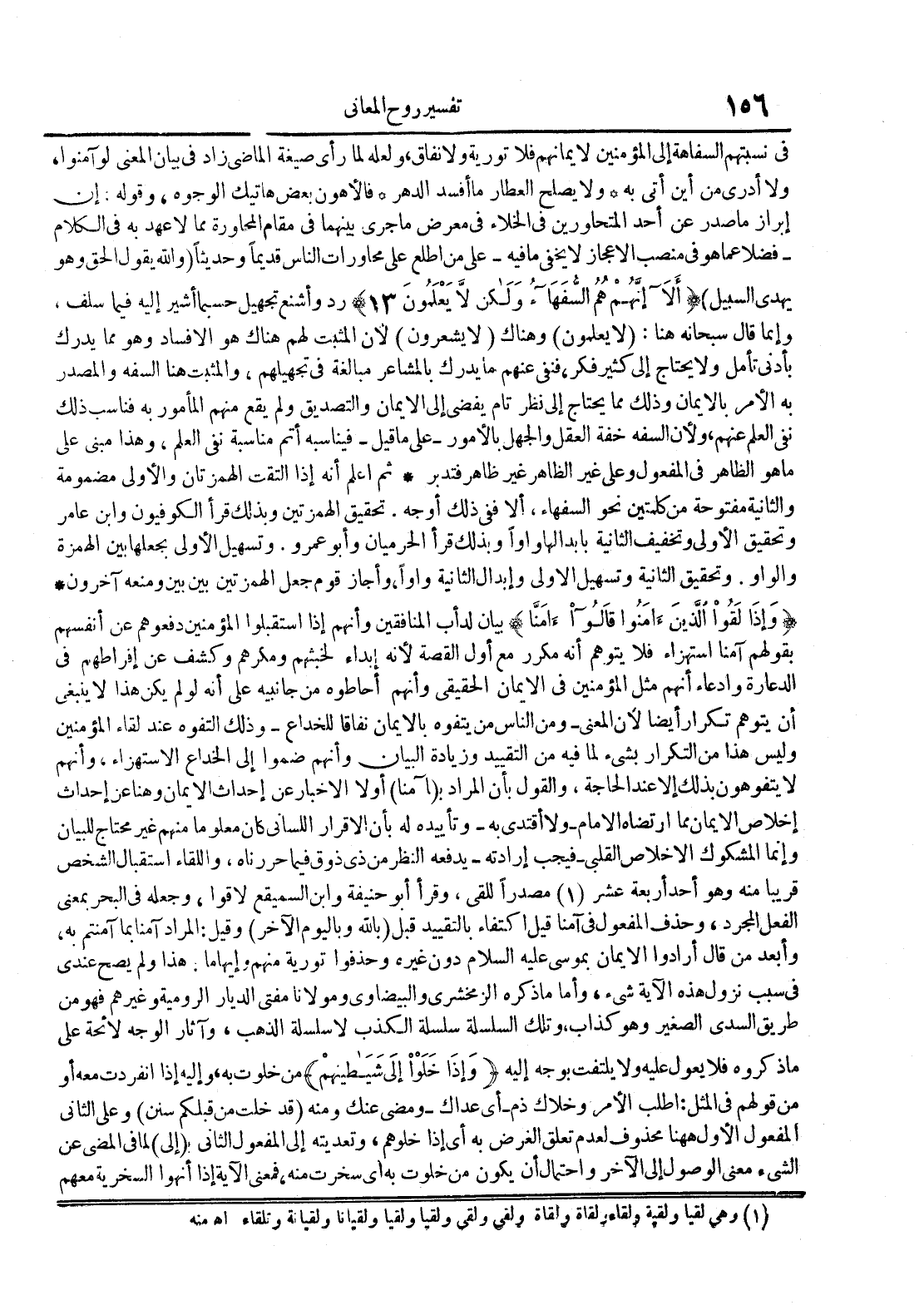 وإذا لقوا الذين آمنوا قالوا آمنا بيان لدأب المنافقين وأنهم إذا أستقبلوا المؤمنين دفعوهم عن أنفسهم بقولهم آمنا إستهزاء فلا يتوهم أنه مكرر مع أول القصة لأنه إبداء لخبثهم ومكرهم وكشف عن إفراطهم في الدعارة وإدعاء أنهم مثل المؤمنين في الإيمان الحقيقي وأنهم أحاطوه من جانبيه على أنه لو لم يكن هذا لا ينبغي أن يتوهم تكرار أيضا لأن المعنى ومن الناس من يتفوه بالإيمان نفاقا للخداع وذلك التفوه عند لقاء المؤمنين وليس هذا من التكرار بشيء لما فيه من التقييد وزيادة البيان وأنهم ضموا إلى الخداع الإستهزاء وأنهم لا يتفوهون بذلك إلا عند الحاجة والقول بأن المراد ب آمنا أولا الأخبار عن إحداث الإيمان وهنا عز إحداث إخلاص الإيمان مما أرتضاه الإمام ولا أقتدي به وتأييده له بأن الإقرار اللساني كان معلوما منهم غير محتاج للبيان وإنما المشكوك الإخلاص القلبيفيجب إرادتهيدفعه النظر من ذي ذوق فيما حررناه واللقاء إستقبال الشخص قريبا منه وهو أحد أربعة عشر مصدرا للقى وقرأ أبو حنيفة وإبن السميقع لاقوا وجعله في البحر بمعنى الفعل المجرد وحذف المفعول في آمنا قيل إكتفاء بالتقييد قبل بالله وباليوم الآخر وقيل : المراد آمنا بما آمنتم به وأبعد من قال أرادوا اليمان بموسى عليه السلام دون غيره وحذفوا تورية منهم وإيهاما : هذا ولم يصح عندي في سبب نزول هذه الآية شيء وأما ما ذكره الزمخشري والبيضاوي وملانا مفتي الديار الرومية وغيرهم فهو من طريق السدي الصغير وهو كذاب وتلك السلسلة سلسلة الكذب لا سلسلة الذهب وآثار الوجه لائحة على ما ذكروه فلا يعول عليه ولا يلتفت بوجه إليه وإذا خلوا إلى شياطينهم من خلوت به وإليه إذا أنفردت معه أو من قولهم في المثل : أطلب الأمر وخلاك ذم أي عداك ومضى عنك ومنه قد خلت من قبلكم سنن وعلى الثاني المفعول الأول ههنا محذوف لعدم تعلق الغرض به اي إذا خلوهم وتعديته إلى المفعول الثاني إلى لما في المضى عن الشيء معنى الوصول إلى الآخر وإحتمال أن يكون من خلوت به اي سخرت منه فمعنى الآية إذا أنهوا السخرية معهم