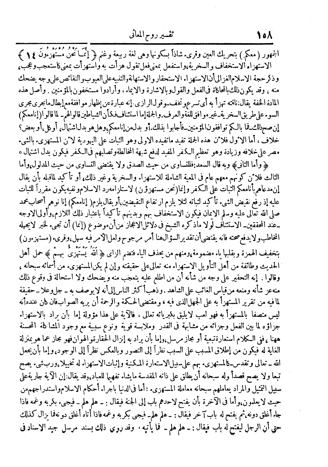 وأما الثاني وبه قال السعد : فللتساوى من حيث الصدق ولا يقتضي التساوي من حيث المدلول وأما الثالث فلأن كونهم معهم عام في المعية الشاملة للإستهزاء والسخرية وغير ذلك أو تأكيد لما قبله بأن يقال إن مدعاهم بأنا معكم الثبات على الكفر وإنما نحن مستهزؤن لإستلزامه رد الإسلام ونفيه يكون مقررا للثبات عليه إذ رفع نقيض الشيء تأكيد لثباته لئلا يلزم إرتفاع النقيضين أو يقال يلزم إنا معكم إنا نوهم أصحاب محمد صلى الله تعالى عليه وسلم الإيمان فيكون الإستخفاف بهم وبدينهم تأكيدا بإعتبار ذلك اللازم وأولى الأوجه عند المحققين الإستئناف لولا ما ذكره الشيخ في دلائل الأعجاز من أن موضوع إنما أن تجيء لخبر لا يجهله المخاطب ولا يدفع صحته فإنه يقتضي أن تقدير السؤال هنا أمر مرجوح ولعل الأمر فيه سهل وقريء مستهزؤن بتخفيف الهمزة وبقلبها ياء مضمونة ومنهم من يحذف الياء فتضم الزاي الله يستهزيء بهم حمل أهل الحديث وطائفة من أهل التأويل الإستهزاء منه تعالى على حقيقته وإن لم يكن المستهزيء من أسمائه سبحانه وقالوا : إنه التحقير على وجه من شأنه أن من أطلع عليه يتعجب منه ويضحك ولا أستحالة في وقوع ذلك منه عز شأنه ومنعه من قياس الغائب على الشاهد وذهب أكثر الناس إلى أنه لا يوصف به جل وعلاحقيقة لما فيه من تقرير المستزأ به على الجهل الذي فيه ومقتضى الحكمة والرحمة أن يريه الصواب فإن كان عنده أنه ليس متصفا بالمستهزأ به فهو لعب لا يليق بكبريائه تعالى فالآية على هذا مؤولة إما بأن يراد بالإستهزاء جزاؤه لما بين الفعل وجزائه من مشابهة في القدر وملابسة قوية ونوع سببية مع وجود المشاكلة المحسنة ههنا ففي الكلام إستعارة تبعية أو مجاز مرسل وإما بأن يراد به إنزال الحقارة والهوان فهو مجاز عما هو بمنزلة الغاية له فيكون من إطلاق المسبب على السبب نظرا إلى التصور وبالعكس نظرا إلى الوجود وإما بأن يجعل الله تعالى وتقدس كالمستهزيء بهم على سبيل الإستعارة المكنية وإثبات الإستهزاء له تخييلا ورب شيء يصح تبعا ولا يصح قصدا وله سبحانه أن يطلق على ذاته المقدسة ما يشاء تفهيما للعباد وقد يقال إن الآية جارية على سبيل التمثيل والمراد يعاملهم سبحانه معاملة المستهزيء : أما في الدنيا بإجراء أحكام الإسلام وإستدراجهم من حيث لا يعلمون وأما في الآخرة بأن يفتح لأحدهم باب إلى الجنة فيقال : هلم هلمفيجيء بكربه وغمه فإذا جاء أغلق دونه ثم يفتح له باب آخر فيقال : هلم هلم فيجيء بكربه وغمه فإذا أتاه أغلق دونه فما يزال كذلك حتى أن الرجل ليفتح له باب فيقال : هلم هلم فما ياتيه وقد روى ذلك بسند مرسل جيد الإسناد في