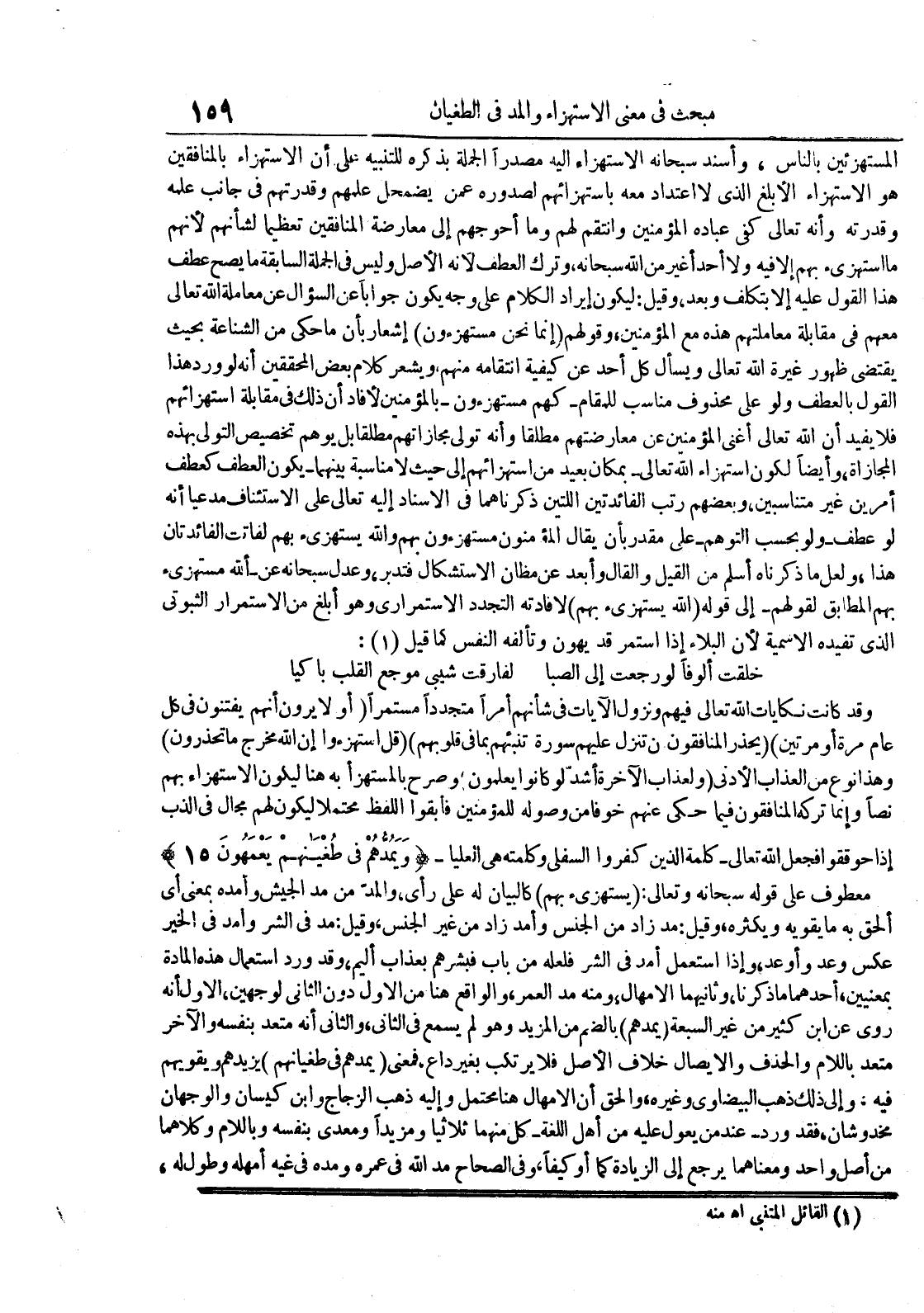 المستهزئين بالناس وأسند سبحانه الإستهزاء إليه مصدرا الجملة بذكره للتنبيه على أن الإستهزاء بالمنافقين هو الإستهزاء الأبلغ الذي لا إعتداد معه بإستهزائهم لصدوره عمن يضمحل علمهم وقدرتهم في جانب علمه وقدرته وأنه تعالى كفى عباده المؤمنين وأنتقم لهم وما أحوجهم إلى معارضة المنافقين تعظيما لشأنهم لأنهم ما أستهزيء بهم إلا فيه ولا أحد أغير من الله سبحانه وترك العطف لأنه الأصل وليس في الجملة السابقة ما يصح عطف هذا القول عليه إلا بتكلف وبعد وقيل : ليكون إيراد الكلام على وجه يكون جوابا عن السؤال عن معاملة الله تعالى معهم في مقابلة معاملتهم هذه مع المؤمنين وقولهم إنما نحن مستهزؤن إشعارا بأن ما حكى من الشناعة بحيث يقتضي ظهور غيرة الله تعالى ويسأل كل واحد عن كيفية إنتقامه منهم ويشعر كلام بعض المحققين أنه لورود هذا القول بالعطف ولو على محذوف مناسب للمقامكهم مستهزؤن بالمؤمنين لأفاد أن ذلك في مقابلة إستهزائهم فلا يفيد أن الله تعالى أغنى المؤمنين عن معارضتهم مطلقا وأنه تولى مجازاتهم مطلقا بل يوهم تخصيص التولي بهذه المجازة وأيضا لكون إستهزاء الله تعالى بمكان بعيد من إستهزائهم إلى حيث لا مناسبة بينهما يكون العطف كعطف أمرين غير متناسبين وبعضهم رتب الفائدتين اللتين ذكرناهما في الإسناد إليه تعالى على الإستئناف مدعيا أنه لو عطف ولو بحسب التوهم على مقدر بأن يقال المؤمنون مستهزؤن بهم والله يستهزيء به لفاتت الفائدتان هذا ولعل ما ذكرناه أسلم من القيل والقال وأبعد عن مظان الإستشكال فتدبر وعدل سبحانه عن الله مستهزيء بهم المطابق لقولهم إلى قوله الله يستهزيء بهم لإفادته التجدد الإستمراري وهو أبلغ من الإستمرار الثبوتي الذي تفيده الأسمية لأن البلاء إذا أستمر قد يهون وتألفه النفس كما قيل : خلقت ألوفا لو رجعت إلى الصبا لفارقت شيبي موجع القلب باكيا وقد كانت نكايات الله تعالى فيهم ونزول الآيات في شأنهم أمرا متجددا مستمرا أو لا يرون أنهم يفتنون في كل عام مرة أو مرتين يحذر المنافقون أن تنزل عليهم سورة تنبئهم بما في قلوبهم قل أستهزؤا إن الله مخرج ما تحذرون وهذا نوع من العذاب الأدنى ولعذاب الآخرة اشد لو كانوا يعلمون وصرح بالمستهزأ به هنا ليكون الإستهزاء بهم نصا وإنما تركه المنافقون فيما حكى عنهم خوفا من وصوله للمؤمنين فأبقوا اللفظ محتملا ليكون لهم مجال في الذب إذا حوققوا فجعل الله تعالى كلمة الذين كفروا السفلى وكلمته هي العليا ويمدهم في طغيانهم يعمهون 51 معطوف على قوله سبحانه وتعالى : يستهزيء بهم كالبيان له على رأي والمد من مد الجيش وأمده بمعنى أي الحق به ما يقويه ويكثره وقيل : مد زاد من الجنس وأمد زاد من غير الجنس وقيل : مد في الشر وأمد في الخير عكس وعد وأوعد وإذا استعمل أمد في الشر فلعله من باب فبشرهم بعذاب أليم وقد ورد إستعمال هذه المادة بمعنيين أحدهما ما ذكرنا وثانيهما الإمهال ومنه مد العمر والواقع هنا من الأول دون الثاني لوجهين الأول أنه روى عن إبن كثير من غير السبعة يمدهم بالضم من المريد وهو لم يسمع في الثاني والثاني أنه متعد بنفسه والآخر متعد باللام والحذف والإيصال خلاف الأصل فلا يرتكب بغير داع فمعنى يمدهم في طغيانهم يريدهم ويقويهم فيه وإلى ذلك ذهب البيضاوي وغيره والحق أن الأمهال هنا محتمل وإليه ذهب الزجاج وإبن كيسان والوجهان مخدوشان فقد وردعند من يعول عليه من أهل اللغةكل منهما ثلاثيا ومزيدا ومعدى بنفسه وباللام وكلاهما من أصل واحد ومعناهما يرجع إلى الزيادة كما أو كيفا وفي الصحاح مد الله في عمره ومده في غيه أمهله وطول له