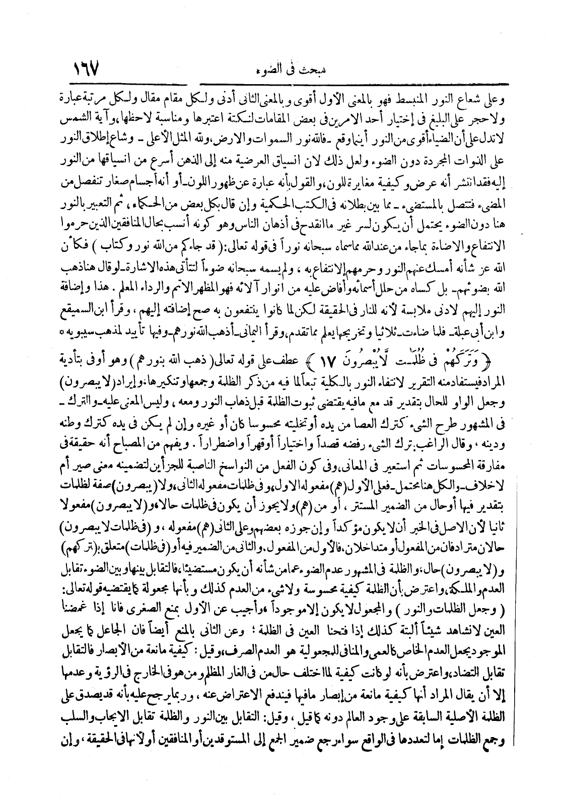وتركهم في ظلمات لا يبصرون 71 عطف على قوله تعالى ذهب الله بنورهم وهو أوفى بتأدية المراد فيستفاد منه التقرير لإنتفاء النور بالكلية تبعا لما فيه من ذكر الظلمة وجمعها وتنكيرها وإيراد لا يبصرون وجعل الواو للحال بتقدير قد مع ما فيه يقتضي ثبوت الظلمة قبل ذهاب النور ومعه وليس المعنى عليه والترك في المشهور طرح الشيء كترك العصا من يده أو تخليته محسوسا كان أو غيره وإن لم يكن في يده كترك وطنه ودينه وقال الراغب ترك الشيء رفضه قصدا وإختيارا أو قهرا وإضطرارا ويفهم من المصباح أنه حقيقة في مفارقة المحسوسات ثم استعير في المعاني وفي كون الفعل من النواسخ الناصبة للجزأين لتضمينه معنى صير أم لا خلاف والكل هنا محتمل فعلى الأول هم مفعوله الأول وفي ظلمات مفعوله الثاني ولا يبصرون صفة لظلمات بتقدير فيها أو حال من الضمير المستتر أو من هم ولا يجوز أن يكون في ظلمات حالا و لا يبصرون مفعولا ثانيا لأن الأصل في الخبر أن لا يكون مؤكدا وإن جوزه بعضهم وعلى الثاني هم مفعوله و في ظلمات لا يبصرون حالان مترادفان من المفعول أو متداخلان فالأول من المفعول والثاني من الضمير فيه و في ظلمات متعلق ب تركهم و لا يبصرون حال والظلمة في المشهور عدم الضوء عما من شأنه أن يكون مستضيئا فالتقابل بينها وبين الضوء تقابل العدم والملكة وأعترض بأن الظلمة كيفية محسوسة ولا شيء من العدم كذلك وبأنها مجعولة كما يقتضيه قوله تعالى : وجعل الظلمات والنور والمجعول لا يكون إلا موجودا وأجيب عن الأول بمنع الصغرى فأنا إذا غمضنا العين لا نشاهد شيئا ألبتة كذلك إذا فتحنا العين في الظلمة وعن الثاني بالمنع أيضا فإن الجاعل كما يجعل الموجود يجعل العدم الخاص كالعمى والمنافي للمجعولية هو العدم الصرف وقيل : كيفية مانعة من الأبصار فالتقابل تقابل التضاد وأعترض بأنه لو كانت كيفية لما أختلف حال من في الغار المظلم ومن هو في الخارج في الرؤية وعدمها إلا أن يقال المراد أنها كيفية مانعة من إبصار ما فيها فيندفع الإعتراض عنه وربما يرجح عليه بأنه قد يصدق على الإظلمة الأصلية السابقة على وجود العالم دونه كما قيل وقيل : التقابل بين النور والظلمة تقابل الإيجاب والسلب وجمع الظلمات إما لتعددها في الواقع سواء رجع ضمير الجمع إلى المستوقدين أو المنافقين أو لأنها في الحقيقة وإن