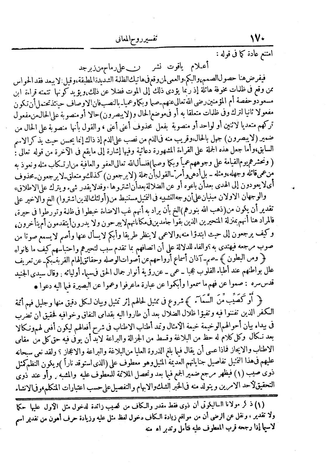 امتنع عادة كما في قوله : أعلام ياقوت نشرن على رماح من زبرجد فيفرض هنا حصول الصمم والبكم والعمى لمن وقع في هاتيك الظلمة الشديدة المطبقة وقيل لا يبعد فقد الحواس ممن وقع في ظلمات مخوفة هائلة إذ ربما يؤدي ذلك إلى الموت فضلا عن ذلك ويؤيد كونها تتمته قراءة إبن مسعود وحفصة أم المؤمنين رضي الله تعالى عنهم صما وبكما وعميا بالنصب فإن الأوصاف حينئذ تحتمل أن تكون مفعولا ثانيا لترك وفي ظلمات متعلقا به أو في موضع الحال و لا يبصرون حالا أو منصوبة على الحال من مفعول تركهم متعديا لأثنين أو لواحد أو منصوبة بفعل محذوف أعني أعني والقول بأنها منصوبة على الحال من ضمير لا يبصرون جهل بالحال وقريب منه في الذم من نصب على الذم إذ ذاك إنما يحسن حيث يذكر الأسم السابق وأما جعل هذه الجملة على القراءة المشهورة دعائية وفيها إشارة إلى ما يقع في الآخرة من قوله تعالى : ونحشرهم يوم القيامة على وجوههم عميا وبكما وصما فنسأل الله تعالى العفو والعافية من إرتكاب مثله ونعوذ به من عمى قائله وجهله ومثله بل أدهى وأمرالقول بأن جملة لا يرجعون كذلك ومتعلق لا يرجعون محذوف أي لا يعودون إلى الهدى بعد أن باعوه أو عن الضلالة بعد أن أشتروها وقد لا يقدر شيء ويترك على الأطلاق