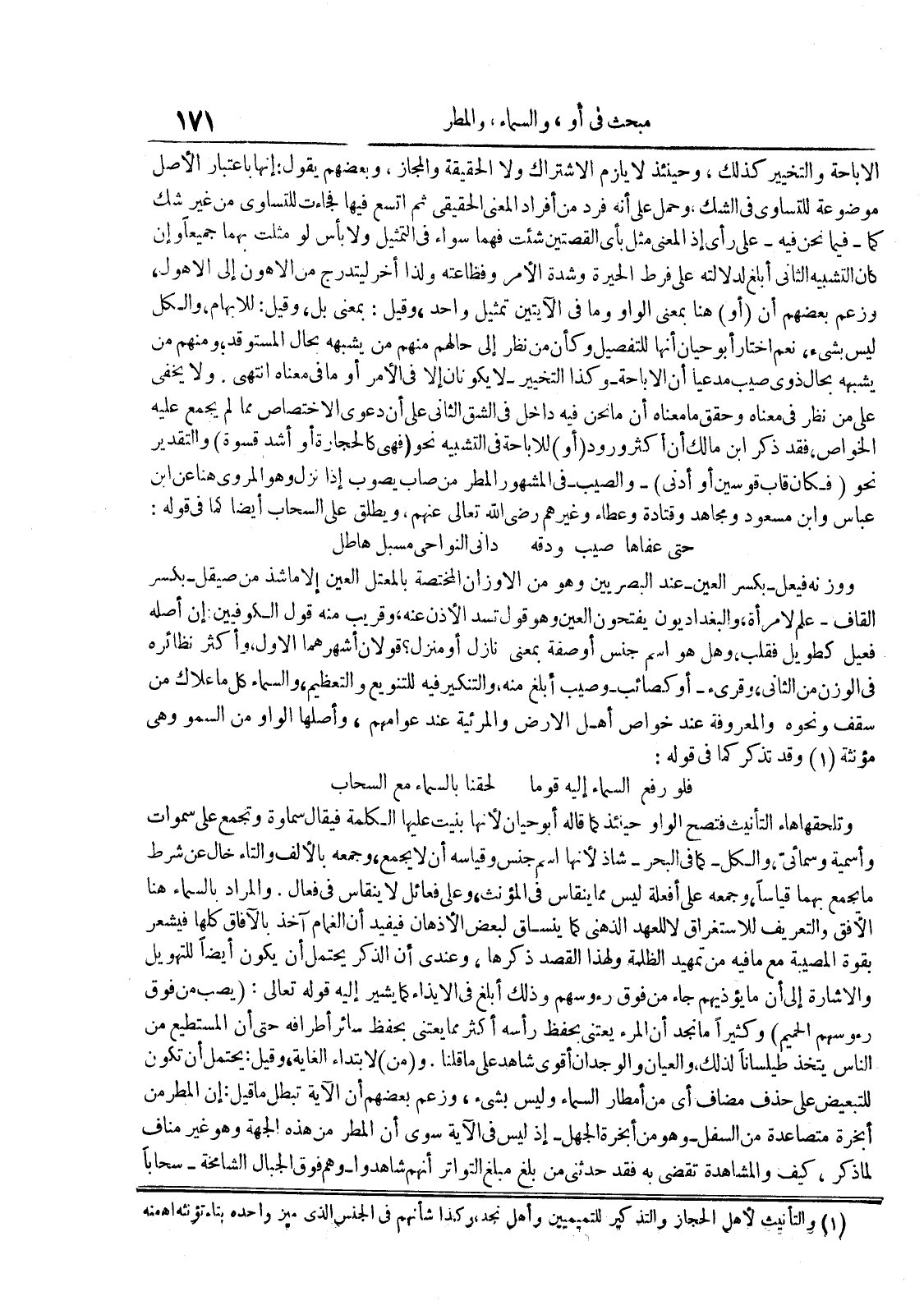 الإباحة والتخيير كذلك وحينئذ لا يلزم الإشتراك ولا الحقيقة والمجاز وبعضهم يقول : إنها بإعتبار الأصل موضوعة للتساوي في الشك وحمل على أنه فرد من أفراد المعنى الحقيقي ثم اتسع فيها فجاءت للتساوي من غير شك كما فيما نحن فيه على رأي إذ المعنى مثل بأي القصتين شئت فهما سواء في التمثيل ولا بأس لو مثلت بهما جميعا وإن كان التشبيه الثاني أبلغ لدلالته على فرط الحيرة وشدة الأمر وفظاعته ولذا أخر ليتدرج من الأهون إلى الأهول وزعم بعضهم أن أو هنا بمعنى الواو وما في الآيتين تمثيل واحد وقيل : بمعنى بل وقيل : للإبهام والكل ليس بشيء نعم أختار أبو حيان أنها للتفصيل وكأن من نظر إلى حالهم منهم من يشبهه بحال المستوقد ومنهم من يشبهه بحال ذوي صيب مدعيا أن الإباحة وكذا التخييرلا يكونان إلا في الأمر أو ما في معناه إنتهى ولا يخفى على من نظر في معناه وحقق ما معناه أن ما نحن فيه داخل في الشق الثاني على أن دعوى الإختصاص مما لم يجمع عليه الخواص فقد ذكر إبن مالك أن أكثر ورود أو للإباحة في التشبيه نحو فهي كالحجارة أو اشد قسوة والتقدير نحو فكان قاب قوسين أو أدنى والصيب في المشهور المطر من صاب يصوب إذا نزل وهو المروي هنا عن إبن عباس وإبن مسعود ومجاهد وقتادة وعطاء وغيرهم رضي الله تعالى عنهم ويطلق على السحاب أيضا كما في قوله : حتى عفاها صيب ودقه داني النواحي مسبل هاطل ووزنه فيعل بكسر العينعند البصريين وهو من الأوزان المختصة بالمعتل العين إلا ما شذ من صيقل بكسر القاف علم لأمرأة والبغداديون يفتحون العين وهو قول تسد الأذن عنه وقريب منه قول الكوفيين : إن أصله فعيل كطويل فقلب وهل هو أسم جنس أو صفة بمعنى نازل أو منزل قولان أشهرهما الأول وأكثر نظائره في الوزن من الثاني وقريء أو كصائب وصيب أبلغ منه والتنكير فيه للتنويع والتعظيم والسماء كل ما علاك من سقف ونحوه والمعروفة عند خواص أهل الأرض والمرئية عند عوامهم وأصلها الواو من السمو وهي مؤنثة وقد تذكر كما في قوله : فلو رفع السماء إليه قوما لحقنا بالسماء مع السحاب وتلحقها هاء التأنيث فتصح الواو حينئذ كما قاله أبو حيان لأنها بنيت عليها الكلمة فيقال سماوة وتجمع على سموات وأسمية وسمائي والكل كما في البحر شاذ لأنها أسم جنس وقياسه أن لا يجمع وجمعه بالألف والتاء خال عن شرط ما يجمع بهما قياسا وجمعه على أفعلة ليس مما ينقاس في المؤنث وعلى فعائل لا ينقاس في فعال والمراد بالسماء هنا الأفق والتعريف للإستغراق لا للعهد الذهني كما ينساق لبعض الأذهان فيفيد أن الغمام آخذ بالآفاق كلها فيشعر بقوة المصيبة مع ما فيه من تمهيد الظلمة ولهذا القصد ذكرها وعندي أن الذكر يحتمل أن يكون أيضا للتهويل والإشارة إلى أن ما يؤذيهم جاء من فوق رؤوسهم وذلك أبلغ في الإيذاء كما يشير إليه قوله تعال : يصب من فوق رؤوسهم الحميم وكثيرا ما نجد أن المرء يعتني بحفظ رأسه أكثر مما يعتني بحفظ سائر أطرافه حتى أن المستطيع من الناس يتخذ طيلسانا لذلك والعيان والوجدان أقوى شاهد على ما قلنا و من لإبتداء الغاية وقيل : يحتمل أن تكون للتبعيض على حذف مضاف أي من أمطار السماء وليس بشيء وزعم بعضهم أن الآية تبطل ما قيل : إن المطر من أبخرة متصاعدة من السفلوهو من أبخرة الجهل إذ ليس في الآية سوى أن المطر من هذه الجهة وهو غير مناف لما ذكر كيف والمشاهدة تقضي به فقد حدثني من بلغ مبلغ التواتر أنهم شاهدوا وهم فوق الجبال الشامخة سحابا