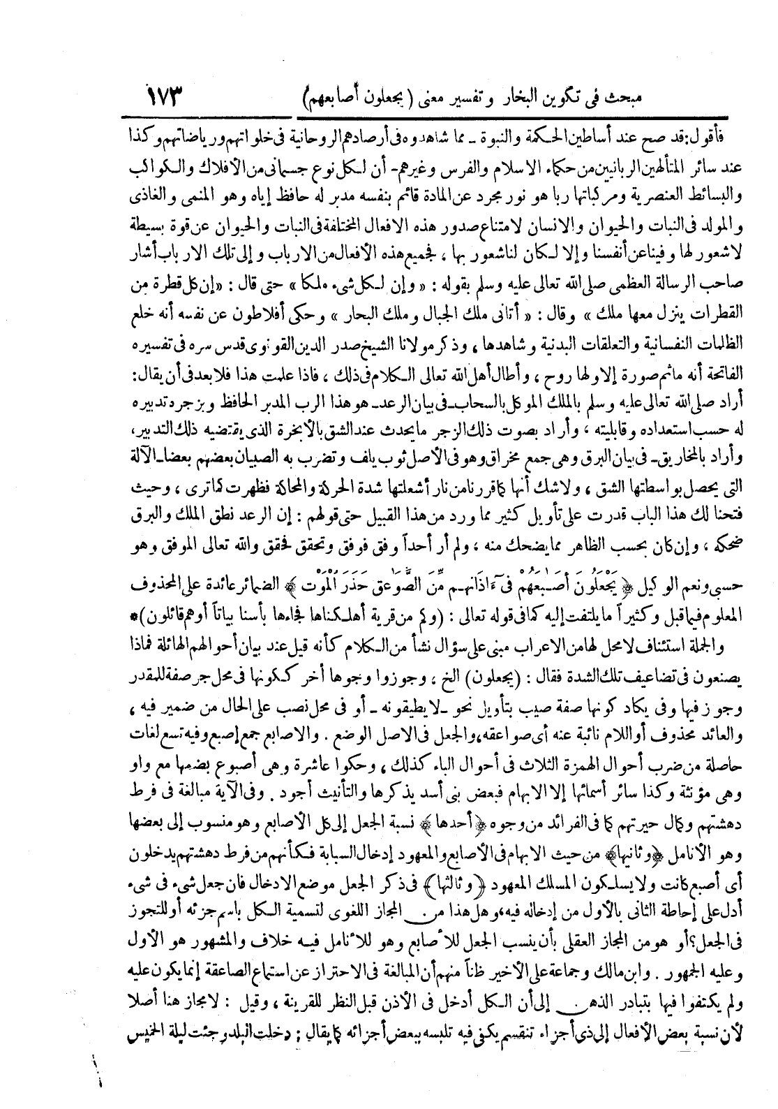 فأقول : قد صح عند أساطين الحكمة والنبوة مما شاهدوه في أرصادهم الروحانية في خلواتهم ورياضاتهم وكذا عند سائر المتاهين الربانيين من حكماء الإسلام والفرس وغيرهم أن لكل نوع جسماني من الأفلاك والكواكب والبسائط العنصرية ومركباتها ربا هو نور مجرد عن المادة قائم بنفسه مدبر له حافظ إياه وهو المنمي والغاذي والمولد في النبات والحيوان والإنسان لإمتناع صدور هذه الأفعال المختلفة في النبات والحيوان عن قوة بسيطة لاشعور لها وفينا عن أنفسنا وإلا لكان لنا شعور بها فجميع هذه الأفعال من الأرباب وإلى تلك الأرباب أشار صاحب الرسالة العظمى صلى الله تعالى عليه وسلم بقوله : وإن لكل شيء ملكا حتى قال : إن كل قطرة من القطرات ينزل معها ملك وقال : أتاني ملك الجبال وملك البحار وحكى أفلاطون عن نفسه أنه خلع الظلمات النفسانية والتعلقات البدنية وشاهدها وذكر مولانا الشيخ صدر الدين القونوي قدس سره في تفسيره الفاتحة أنه ما ثم صورة إلا ولها روح وأطال أهل الله تعالى الكلام في ذلك فإذا علمت هذا فلا بعد في أن يقال : أراد صلى الله تعالى عليه وسلم بالملك الموكل بالسحاب في بيان الرعد هو هذا الرب المدبر الحافظ وبزجره تدبيره له حسب إستعداده وقابليته وأراد بصوت ذلك الزجر ما يحدث عند الشق بالأبخرة الذي يقتضيه ذلك التدبير وأراد بالمخاريق في بيان البرق وهي جمع مخراق وهو في الأصل ثوب يلف وتضرب به الصبيان بعضهم بعضا الآلة التي يحصل بواسطتها الشق ولا شك أنها كما قررنا من نار أشعلتها شدة الحركة والمحاكة فظهرت كما ترى وحيث فتحنا لك هذا الباب قدرت على تأويل كثير مما ورد من هذا القبيل حتى قولهم : إن الرعد نطق الملك والبرق ضحكه وإن كان بحسب الظاهر مما يضحك منه ولم أر أحدا وفق فوفق وتحق فحقق والله تعالى الموفق وهو حسبي ونعم الوكيل يجعلون أصابعهم في إذانهم من الصواعق حذر الموت الضمائر عائدة على المحذوف المعلوم فيما قبل وكثيرا ما يلتفت إليه كما في قوله تعالى : وكم من قرية أهلكناها فجاءها بأسنا بياتا أو هم قائلون