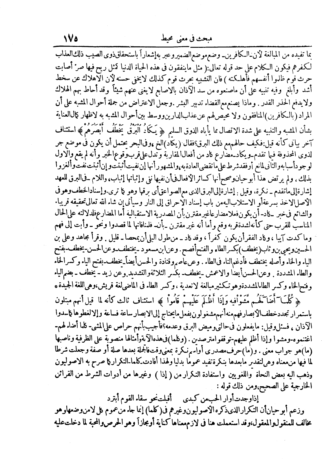 بما تفيده من المبالغة لأن الكافرين وضع موضع الضمير وعبر به إشعارا بإستحقاق ذوي الصيب ذلك العذاب لكفرهم فيكون الكلام على حد قوله تعالى : مثل ما ينفقون في هذه الحياة الدنيا كمثل ريح فيها صر أصابت حرث قوم ظلموا أنفسهم فأهلكته فإن التشبيه بحرث قوم كذلك لا يخفى حسنه لأن الأهلاك عن سخط أشد وأبلغ وفيه تنبيه على أن ما صنعوه من سد الآذان بالأصابع لا يغنى عنهم شيئا وقد أحاط بهم الهلاك ولا يدافع الحذر القدر وماذا يصنع مع القضاء تدبير البشر وجعل الإعتراض من جملة أحوال المشبه على أن المراد بالكافرين المنافقون ولا محيص لهم عن عذاب الدارين ووسط بين أحوال المشبه به لإظهار كمال العناية بشأن المشبه والتنبيه على شدة الإتصال مما يأباه الذوق السليم يكاد البرق يخطف أبصارهم إستئناف آخر بياني كأنه قيل : فيكف حالهم مع ذلك البرق فقال يكاد إلخ وفي البحر يحتمل أن يكون في موضع جر لذوي المحذوفة فيما تقدم ويكاد مضارع كاد من أفعال المقاربة وتدل على قرب وقوع الخبر وأنه لم يقع والأول لوجود أسبابه والثاني لمانع أو فقد شرط على ما تقضي العادة به والمشهور أنها إن نفيت أثبتت وإن أثبتت نفت وألغزوا بذلك ولم يرتض هذا أبو حيان وصحح أنها كسائر الأفعال في أن نفيها نفي وإثباتها إثبات واللام في البرق للعهد إشارة إلى ما تقدم نكرة وقيل : إشارة إلى البرق الذي مع الصواعق أي برقها وهو كما ترى وإسناد الخطف وهو في الأصل الأخذ بسرعة أو الإستلاب إليه من باب إسناد الأحراق إلى النار وسيأتي إن شاء الله تعالى تحقيقه قريبا والشائع في خبر كاد أن يكون فعلا مضارعا غير مقترن بأن المصدرية الإستقبالية أما المضارع فلدلالته على الحال المناسب للقرب حتى كأنه لشدة قربه وقع وأما أنه غير مقترن بأن فلمنافاتها لما قصدوا ونحو وأبت إلى فهم وما كدت آبيا وكاد الفقر أن يكون كفرا وقد كادمن طول البلى أن يمحصا قليل وقرأ مجاهد وعلي بن الحسين ويحيى بن وثاب يخطف بكسر الطاء والفتح أفصح وعن إبن مسعود يختطف وعن الحسن يخطف بفتح الياء والخاء وأصله يختطف فأدغم التاء في الطاء وعن عاصم وقتادة والحسن أيضا يخطف بفتح الياء وكسر الخاء والطاء المشددة وعن الحسن ايضا والأعمش يخطف بكسر الثلاثة والتشديد وعن زيد يخطف بضم الياء وفتح الخاء وكسر الطاء المشددة وهو تكثير مبالغة لا تعدية وكسر الطاء في الماضي لغة قريش وهي اللغة الجيدة