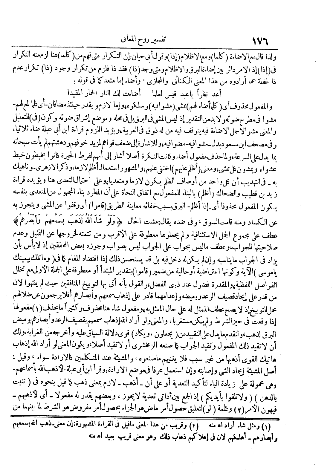 ولذا قال مع الإضاءة كلما ومع الأظلام إذا وقول أبي حيان : إن التكرار متى فهم من كلما هنا لزم منه التكرار في إذا إذ الأمر دائر بين إضاءة البرق والأظلام ومتى وجد ذا فقد ذا فلزم من تكرار وجود ذا تكرار عدم ذا غفلة عما أرادوه من هذا المعنى الكنائي والمجازي وأضاء إما متعد كما في قوله : أعد نظرا يا عبد قيس لعلما أضاءت لك النار الحمار المقيدا والمفعول محذوف أي كلما أضاء لهم ممشى مشوا فيه وسلكوه وإما لازم ويقدر حينئذ مضافا نأي كلما لمع لهم مشوا في مطرح ضوئه ولا بد من التقدير إذ ليس المشي في البرق بل في محله وموضع إشراق ضوئه وكون في للتعليل والمعنى مشوا لأجل الإضاءة فيه يتوقف فيه من له ذوق في العربية ويؤيد اللزوم قراءة إبن أبي عبلة ضاء ثلاثيا وفي مصحف إبن مسعود بدل مشوا فيه مضوا فيه وللإشارة إلى ضعف قواهم لمزيد خوفهم ودهشتهم لم يأت سبحانه بما يدل على السرعة ولما حذف مفعول أضاء وكانت النكرة أصلا أشار إلى أنهم لفرط الحيرة كانوا يخبطون خبط عشواء ويمشون كل ممشى ومعنى أظلم عليهم أختفى عنهم والمشهور إستعمال أظلم لازما وذكر الأزهري وناهيك به في التهذيب أن كل واحد من أوصاف الظلم يكون لازما ومتعديا وعلى إحتمال التعدي هنا ويؤيده قراءة زيد بن قطيب والضحاك أظلم بالبناء للمفعول مع إتفاق النحاة على أن المطرد بناء المجهول من المتعدي بنفسه يكون المفعول محذوفا أي إذا أظلم البرق بسبب خفائه معاينة الطريق قاموا أي وقفوا عن المشي ويتجوز به عن الكساد ومنه قامت السوق وفي ضده يقال : مشت الحال ولو شاء الله لذهب بسمعهم وأبصارهم عطف على مجموع الجمل الإستئنافية ولم يجعلوها معطوفة على الأقرب ومن تتمته لخروجها عن التمثيل وعدم صلاحيتها للجواب وعطف ما ليس بجواب على الجواب ليس بصواب وجوزه بعض المحققين إذ لا بأس بأن يزاد في الجواب ما يناسبه وإن لم يكن له دخل فيه بل قد يستحسن ذلك إذا أقتضاه المقام كما في وما تلك بيمينك ياموسى الآية وكونها إعتراضية أو حالية من ضمير قاموا بتقدير المبتدأ أو معطوفة على الجملة الأولى مع تخلل الفواصل اللفظية والمقدرة فضول عند ذوي الفضل والقول بأنه أتى بها لتوبيخ المنافقين حيث لم ينتهوا لأن من قدر على إيجاد قصيف الرعد وميضه وإعدامهما قادر على إذهاب سمعهم وأبصارهم أفلا يرجعون عن ضلالهم محل للتوبيخ إذ لا يصح عطف الممثل به ومفعول شاء هنا محذوف وكثيرا ما يحذف مفعولها إذا وقعت في حيز الشرط ولم يكن مستغربا والمعنى ولو أراد الله إذهاب سمعهم بقصيف الرعد وأبصارهم بوميض البرق لذهب ولتقدم ما يدل على التقييد من يجعلون ويكاد قوى دلالة السياق عليه وأخرجه من الغرابة ولك أن لا تقيد ذلك المفعول وتقيد الجواب كما صنعه الزمخشري أو لا تقيد أصلا ويكون المعنى لو أراد الله إذهاب هاتيك القوى أذهبها من غير سبب فلا يغنيهم ما صنعوه والمشيئة عند المتكلمين كالإرادة سواء وقيل : أصل المشيئة إيجاد الشيء وإصابته وإن أستعمل عرفا في موضع الإرادة وقرأ إبن أبي عبلة لأذهب الله بأسمائهم وهي محمولة على زيادة الباء لتأكيد التعدية أو على أن أذهب لازم بمعنى ذهب كما قيل بنحوه في تنبت بالدهن ولا تلقوا بأيديكم إذ الجمع بين أداتي تعدية لا يجوز وبعضهم يقدر له مفعولا أي لأذهبهم فيهون الأمر وكلمة لو لتعليق حصول أمر ماض هو الجزاء بحصول أمر مفروض هو الشرط لما بينهما من