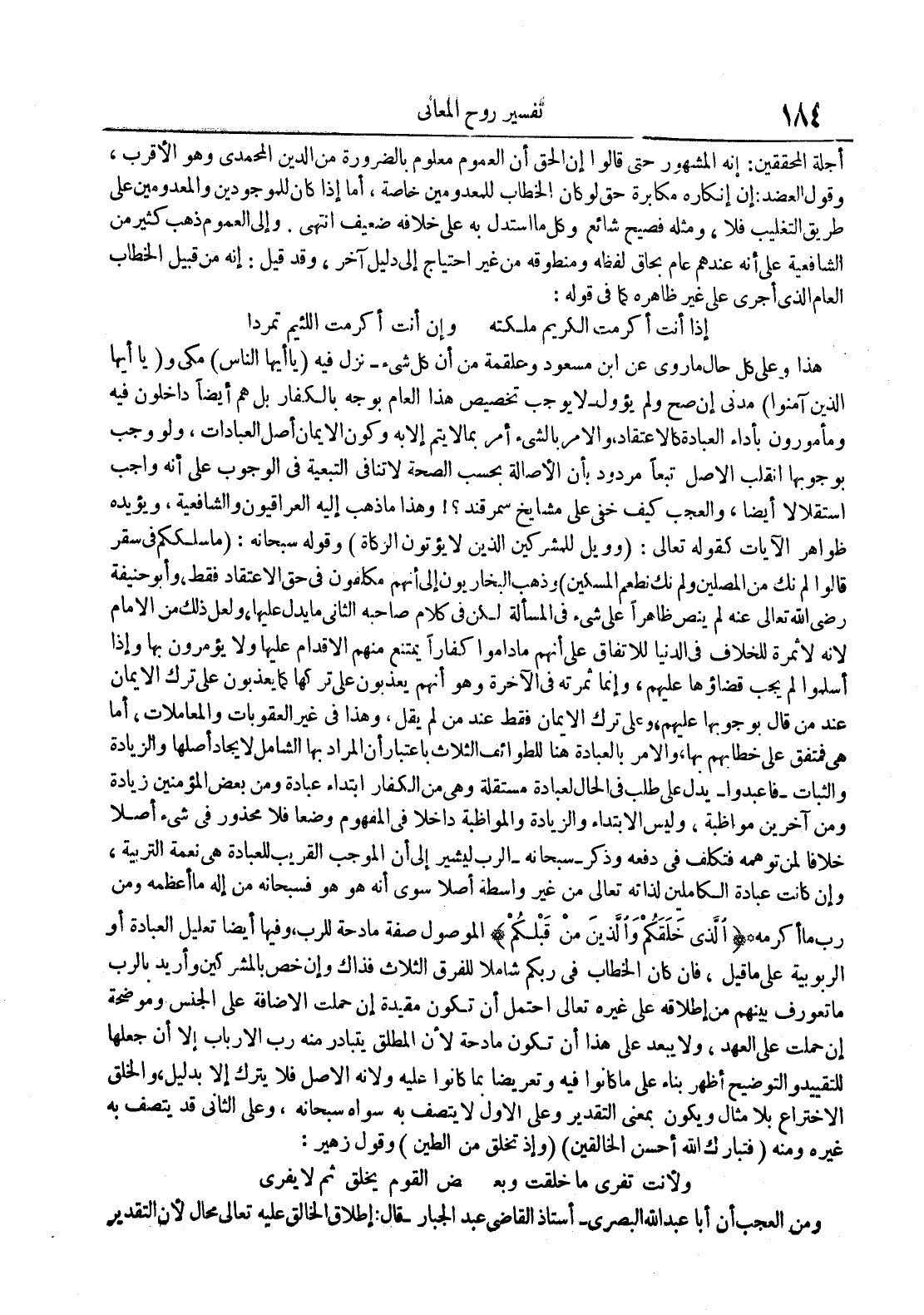 أجلة المحققين : إنه المشهور حتى قالوا إن الحق أن العموم معلوم بالضرورة من الدين المحمدي وهو الأقرب وقول العضد : إن إنكاره مكابرة حق لو كان الخطاب للمعدومين خاصة أما إذا كان للموجودين والمعدومين على طريق التغليب فلا ومثله فصيح شائع وكل ما أستدل به على خلافه ضعيف إنتهى وإلى العموم ذهب كثير من الشافعية على أنه عندهم عام بحاق لفظه ومنطوقه من غير إحتياج إلى دليل آخر وقد قيل : إنه من قبيل الخطاب العام الذي أجرى على غير ظاهره كما في قوله : إذا أنت أكرمت الكريم ملكته وإن أنت أكرمت اللئيم تمردا هذا وعلى كل حال ما روى عن إبن مسعود وعلقمة من أن كل شيء نزل فيه يا أيها الناس مكي و ياأيها الذين آمنوا مدني إن صح ولم يؤول لا يوجب تخصيص هذا العام بوجه بالكفار بل هم أيضا داخلون فيه ومأمورون بإداء العبادة كالإعتقاد والأمر بالشيء أمر بما لا يتم إلا به وكون الإيمان أصل العبادات ولو وجب بوجوبها إنقلب الأصل تبعا مردود بأن الإصالة بحسب الصحة لا تنافي التبعية في الوجوب على أنه واجب إستقلالا أيضا والعجب كيف خفى على مشايخ سمرقند ! وهذا ماذهب إليه العراقيون والشافعية ويؤيده ظواهر الآيات كقوله تعالى : وويل للمشركين الذين لا يؤتون الزكاة وقوله سبحانه : ما سلككم في سقر قالوا لم نك من المصلين ولم نك نطعم المسكين وذهب البخاريون إلى أنهم مكلفون في حق الإعتقاد فقط وأبو حنيفة رضي الله تعالى عنه لم ينص ظاهرا على شيء في المسألة لكن في كلام صاحبه الثاني ما يدل عليها ولعل ذلك من الإمام لأنه لا ثمرة للخلاف في الدنيا للإتفاق على أنهم ما داموا كفارا يمتنع منهم الأقدام عليها ولا يؤمرون بها وإذا أسلموا لم يجب قضاؤها عليهم وإنما ثمرته في الآخرة وهو أنهم يعذبون على تركها كما يعذبون على ترك الإيمان عند من قال بوجوبها عليهم وعلى ترك الإيمان فقط عند من لم يقل وهذا في غير العقوبات والمعاملات أما هي فمتفق على خطابهم بها والأمر بالعبادة هنا للطوائف الثلاث بإعتبار أن المراد بها الشامل لإيجاد أصلها والزيادة والثبات فأعبدوا يدل على طلب في الحال لعبادة مستقلة وهي من الكفار إبتداء عبادة ومن بعض المؤمنين زيادة ومن آخرين مواظبة وليس الإبتداء والزيادة والمواظبة داخلا في المفهوم وضعا فلا محذور في شيء أصلا خلافا لمن توهمه فتكلف في دفعه وذكر سبحانه الرب ليشير إلى أن الموجب القريب للعبادة هي نعمة التربية وإن كانت عبادة الكاملين لذاته تعالى من غير واسطة أصلا سوى أنه هو هو فسبحانه من إله ما أعظمه ومن رب ما أكرمه