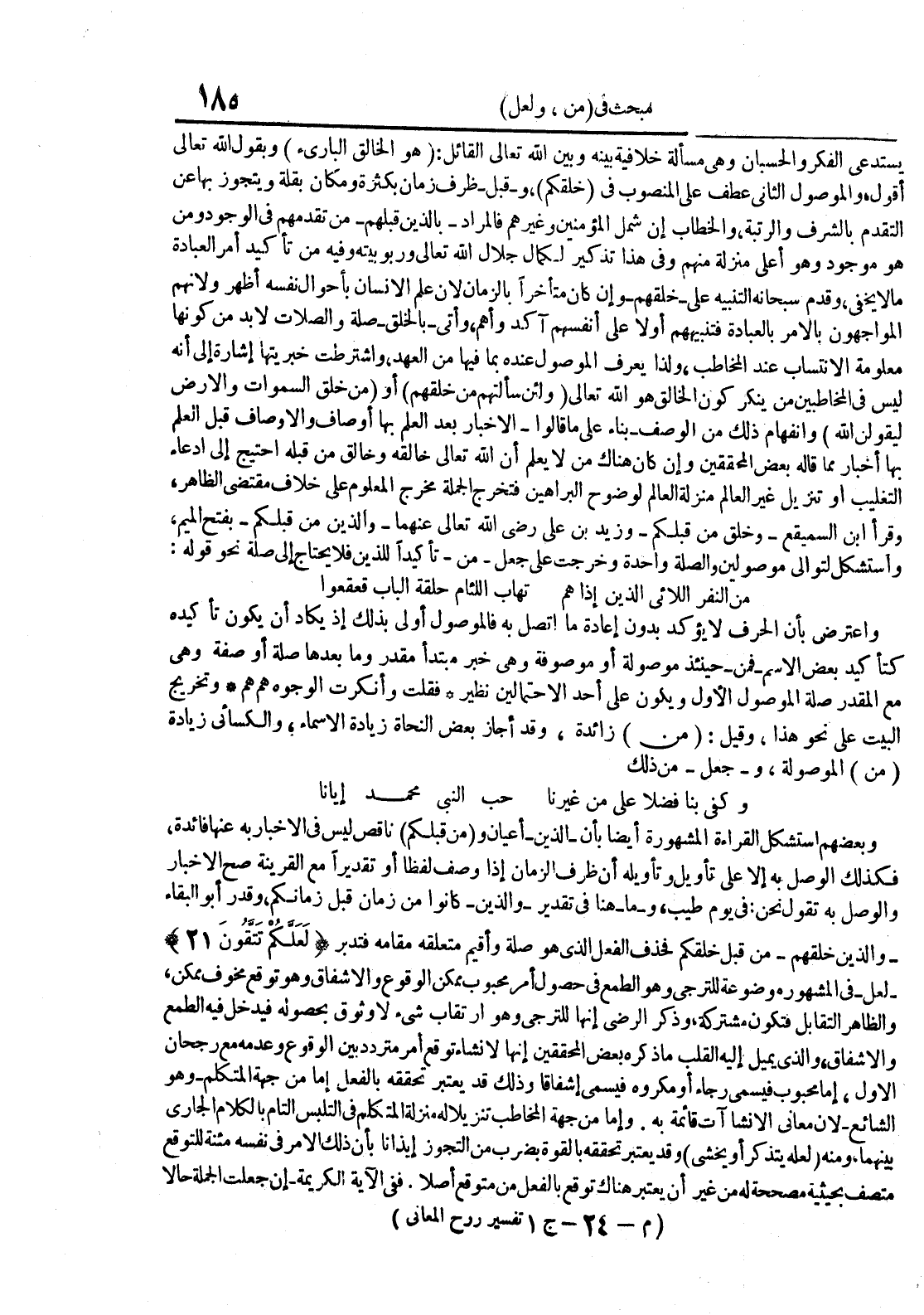 وتخريج البيت على نحو هذا وقيل : من زائدة وقد أجاز بعض النحاة زيادة الأسماء والكسائي زيادة من الموصولة وجعلمن ذلك وكفى بنا فضلا على من غيرنا حب النبي محمد إيانا وبعضهم أستشكل القراءة المشهورة أيضا بأن الذين أعيان و من قبلكم ناقص ليس في الأخبار به عنها فائدة فكذلك الوصل به إلا على تأويل وتأويله أن ظرف الزمان إذا وصف لفظا أو تقديرا مع القرينة صح الأخبار والوصل به تقول نحن : في يوم طيب وماهنا في تقدير والذين كانوا من زمان قبل زمانكم وقدر أبو البقاء والذين خلقهم من قبل خلقكم فحذف الفعل الذي هو صلة وأقيم متعلقه مقامه فتدبر لعلكم تتقون 12 لعلفي المشهور موضوعة للترجي وهو الطمع في حصول أمر محبوب ممكن الوقوع والإشفاق وهو توقع مخوف ممكن والظاهر التقابل فتكون مشتركة وذكر الرضى إنها للترجي وهو إرتقاب شيء لا وثوق بحصوله فيدخل فيه الطمع والإشفاق والذي يميل إليه القلب ما ذكره بعض المحققين إنها لا نشاء توقع أمر متردد بين الوقوع وعدمه مع رجحان الأول إما محبوب فيسمى رجاء أو مكروه فيسمى إشفاقا وذلك قد يعتبر تحققه بالفعل إما من جهة المتكلم وهو الشائع لأن معاني الإنشاآت قائمة به وإما من جهة المخاطب تنزيلا له منزلة المتكلم في التلبس التام بالكلام الجاري بينهما ومنه لعله يتذكر أو يخشى وقد يعتبر تحققه بالقوة بضرب من التجوز إيذانا بأن ذلك الأمر في نفسه مئنة للتوقع متصف بحيثية مصححة له من غير أن يعتبر هناك توقع بالفعل من متوقع أصلا ففي الآية الكريمة إن جعلت الجملة حالا
