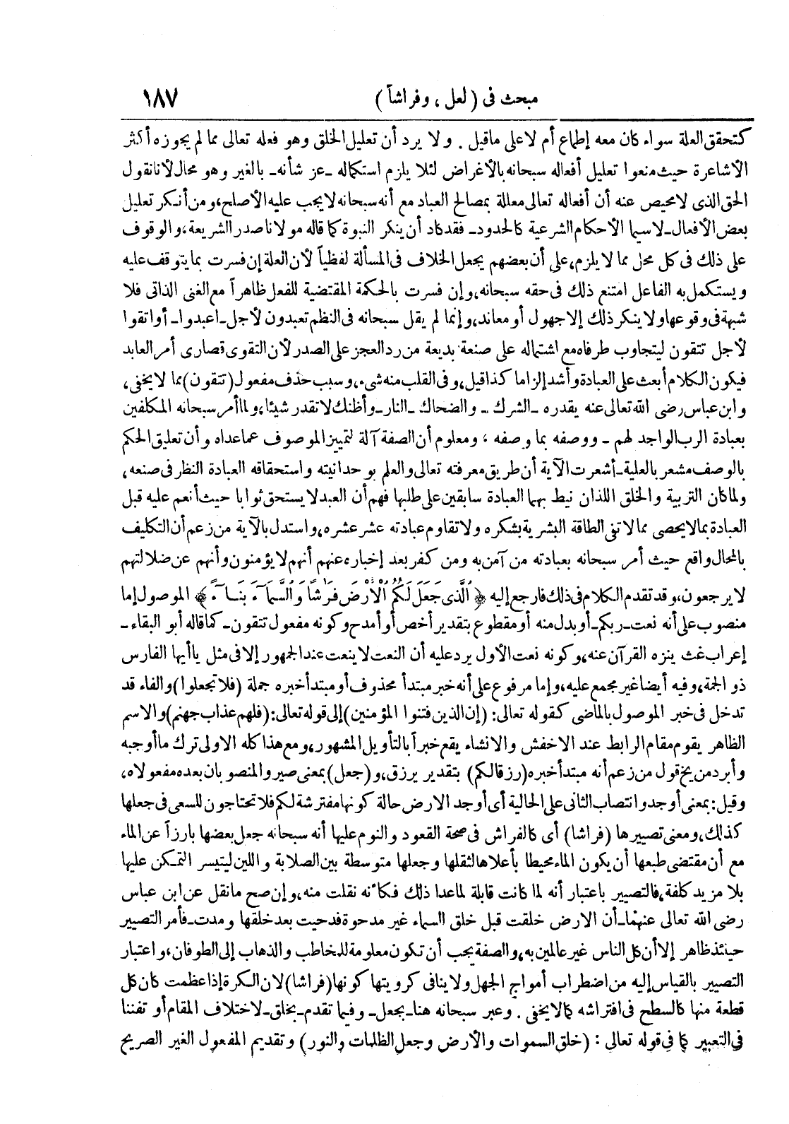 كتحقق العلة سواء كان معه أطماع أم لا على ما قيل ولا يرد أن تعليل الخلق وهو فعله تعالى مما لم يجوزه أكثر الأشاعرة حيث منعوا تعليل أفعاله سبحانه بالأغراض لئلا يلزم إستكماله عز شأنه بالغير وهو محال لأنا نقول الحق الذي لا محيص عنه أن أفعاله تعالى معللة بمصالح العباد مع أنه سبحانه لا يجب عليه الأصلح ومن أنكر تعليل بعض الأفعال لا سيما الأحكام الشرعية كالحدود فقد كاد أن ينكر النبوة كما قاله مولانا صدر الشريعة والوقوف على ذلك في كل محل مما لا يلزم على أن بعضهم يجعل الخلاف في المسألة لفظيا لأن العلة إن فسرت بما يتوقف عليه ويستكمل به الفاعل أمتنع ذلك في حقه سبحانه وإن فسرت بالحكمة المقتضية للفعل ظاهرا مع الغني الذاتي فلا شبهة في وقوعها ولا ينكر ذلك إلا جهول أو معاند وإنما لم يقل سبحانه في النظم تعبدون لأجل أعبدوا أو أتقوا لأجل تتقون ليتجاوب طرفاه مع إشتماله على صنعة بديعة من رد العجز على الصدر لأن التقوى قصارى أمر العابد فيكون الكلام أبعث على العبادة وأشد إلزاما كذا قيل وفي القلب منه شيء وسبب حذف مفعول تتقون مما لا يخفى وإبن عباس رضي الله تعالى عنه يقدره الشرك والضحاك النار لا تقدر شيئا ولما أمر سبحانه المكلفين بعبادة الرب الواجد لهم ووصفه بما وصفه ومعلوم أن الصفة آلة لتمييز الموصوف عما عداه وأن تعليق الحكم بالوصف مشعر بالعلية أشعرت الآية أن طريق معرفته تعالى والعلم بوحدانيته وإستحقاقه العبادة النظر في صنعه ولما كان التربية والخلق اللذان نيط بهما العبادة سابقين على طلبها فهم أن العبد لا يستحق ثوابا حيث أنعم عليه قبل العبادة بما لا يحصى مما لا تفي الطاقة البشرية بشكره ولا تقاوم عبادته عشر عشره وأستدل بالآية من زعم أن التكليف بالمحال واقع حيث أمر سبحانه بعبادته من آمن به ومن كفر بعد إخباره عنهم أنهم لا يؤمنون وأنهم عن ضلالتهم لايرجعون وقد تقدم الكلام في ذلك فأرجع إليه الذي جعل لكم الأرض فراشا والسماء بناء الموصول إما منصوب على أنه نعت ربكم أو بدل منه أو مقطوع بتقدير أخص أو أمدح وكونه مفعول تتقون كما قاله أبو البقاء إعراب غث ينزه القرآن عنه وكونه نعت الأول يرد عليه أن النعت لا ينعت عند الجمهور إلا في مثل يا أيها الفارس ذو الجمة وفيه أيضا غير مجمع عليه وإما مرفوع على أنه خبر مبتدأ محذوف أو مبتدأ أخبره جملة فلا تجعلوا والفاء قد تدخل في خبر الموصول بالماضي كقوله تعالى : إن الذين فتنوا المؤمنين إلى قوله تعالى : فلهم عذاب جهنم والأسم الظاهر يقوم مقام الرابط عند الأخفش والإنشاء يقع خبرا بالتأويل المشهور ومع هذا كله الأولى ترك ما أوجبه وأبرد من يخ قول من زعم أنه مبتدأ أخبره رزقا لكم بتقدير يرزق و جعل بمعنى صير والمنصوبان بعده مفعولاه وقيل : بمعنى أوجدو إنتصاب الثاني على الحالية أي أوجد الأرض حالة كونها مفترشة لكم فلا تحتاجون للسعي في جعلها كذلك ومعنى تصييرها فراشا أي كالفراش في صحة القعود والنوم عليها أنه سبحانه جعل بعضها بارزا عن الماء مع أن مقتضى طبعها أن يكون الماء بأعلاها لثقلها وجعلها متوسطة بين الصلابة واللين ليتيسر التمكن عليها بلا مزيد كلفة فالتصير بإعتبار أنه لما كانت قابلة لما عدا ذلك فكأنه نقلت منه وإن صح ما نقل عن إبن عباس رضي الله تعالى عنهما أن الأرض خلقت قبل خلق السماء غير مدحوة فدحيت بعد خلقها ومدت فأمر التصيير حينئذ ظاهر إلا أن كل الناس غير عالمين به والصفة يجب أن تكون معلومة للمخاطب والذهاب إلى الطوفان وإعتبار التصيير بالقياس إليه من إضطراب أمواج الجهل ولا ينافي كرويتها كونها فراشا لأن الكرة إذا عظمت كان كل قطعة منها كالسطح في إفتراشه كما لا يخفى وعبر سبحانه هنا بجعل وفيما تقدم بخلق لإختلاف المقام أو تفننا في التعبير كما في قوله تعالى : خلق السموات والأرض وجعل الظلمات والنور وتقديم المفعول الغير الصريح