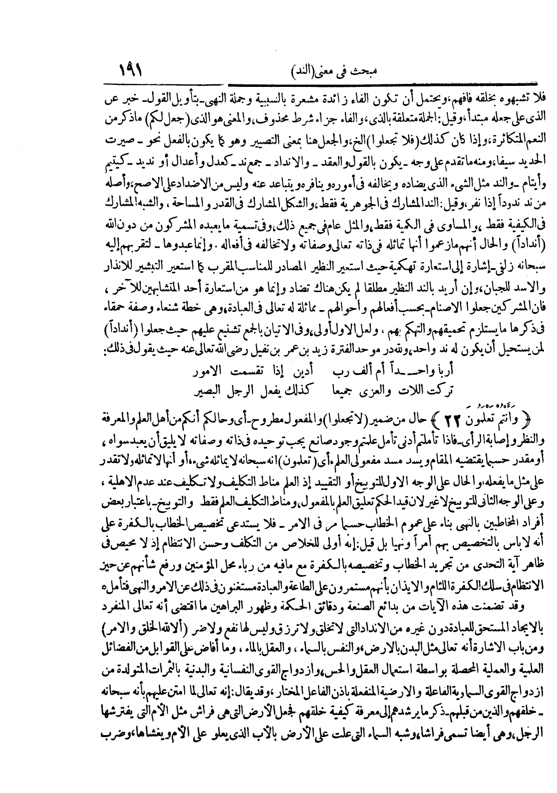 فلا تشبهوه بخلقه فأفهم ويحتمل أن تكون الفاء زائدة مشعرة بالسببية وجملة النهيب تأويل القول خبر عن الذي على جعله مبتدأ وقيل : الجملة متعلقة بالذي والفاء جزاء شرط محذوف والمعنى هو الذي جعل لكم ما ذكر من النعم المتكاثرة وإذا كان كذلك فلا تجعلوا إلخ والجعل هنا بمعنى التصيير وهو كما يكون بالفعل نحو صيرت الحديد سيفا ومنه ما تقدم على وجه يكون بالقول والعقد والأنداد ندك عدل وأعدال أو نديدك يتيم وأيتام والند مثل الشيء الذي يضاده ويخالفه في أموره وينافره ويتباعد عنه وليس من الأضداد على الأصح وأصله من ند ندودا إذا نفر وقيل : الند المشارك في الجوهرية فقط والشكل المشارك في القدر والمساحة والشبه المشارك في الكيفية فقط والمساوي في الكمية فقط والمثل عام في جميع ذلك وفي تسمية ما يعبده المشركون من دون الله أندادا والحال أنهم ما زعموا أنها تماثله في ذاته تعالى وصفاته ولا تخالفه في أفعاله وإنما عبدوها لتقربهم إليه سبحانه زلفى إشارة إلى إستعارة تهكمية حيث أستعير النظير المصادر للمناسب المقرب كما أستعير التبشير للإنذار والأسد للجبان وإن أريد بالند النظير مطلقا لم يكن هناك تضاد وإنما هو من إستعارة أحد المتشابهين للآخر فإن المشركين جعلوا الأصنام بحسب أفعالهم وأحوالهممماثلة له تعالى في العبادة وهي خطة شنعاء وصفة حمقاء في ذكرها ما يستلزم تحميقهم والتهكم بهم ولعل الأول أولى وفي الأتيان بالجمع تشنيع عليهم حيث جعلوا أندادا لمن يستحيل أن يكون له ند واحد ولله در موحد الفترة زيد بن عمر بن نفيل رضي الله تعالى عنه حيث يقول في ذلك : أربا واحدا أم ألف رب أدين إذا تقسمت الأمور تركت اللات والعزى جميعا كذلك يفعل الرجل البصير وأنتم تعلمون 22 حال من ضمير لا تجعلوا والمفعول مطروحأي وحالكم أنكم من أهل العلم والمعرفة والنظر وإصابة الرأي فإذا تأملتم أدنى تأمل علمتم وجود صانع يجب توحيده في ذاته وصفاته لا يليق أن يعبد سواه أو مقدر حسبما يقتضيه المقام ويسد مسد مفعولي العلم أي تعلمون أنه سبحانه لا يماثله شيء أو أنها لا تماثله ولا تقدر على مثل ما يفعله والحال على الوجه الأول للتوبيخ أو التقييد إذ العلم مناط التكليف ولا تكليف عند عدم الأهلية وعلى الوجه الثاني للتوبيخ لا غير لأن قيد الحكم تعليق العلم بالمفعول ومناط التكليف العلم فقط والتوبيخ بإعتبار بعض أفراد المخاطبين بالنهي بناء على عموم الخطاب حسبما مر في الأمر فلا يستدعي تخصيص الخطاب بالكفرة على أنه لا بأس بالتخصيص بهم أمرا ونهيا بل قيل : إنه أولى للخلاص من التكلف وحسن الإنتظام إذ لا محيص في ظاهر آية التحدي من تجريد الخطاب وتخصيصه بالكفرة مع ما فيه من رباء محل المؤمنين ورفع شأنهم عن حين الإنتظام في سلك الكفرة اللئام والإيذان بأنهم مستمرون على الطاعة والعبادة مستغنون في ذلك عن الأمر والنهي فتأمل