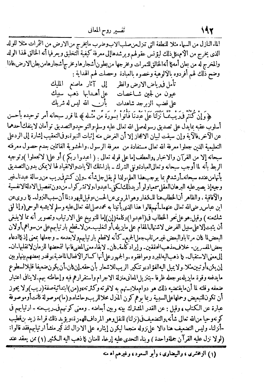 الماء النازل من السماء مثلا للنطفة التي تنزل من صلب الأب وضرب ما يخرج من الأرض من الثمرات مثلا للولد الذي يخرج من الأم كل ذلك ليؤنس عقولهم ويرشدها إلى معرفة كيفية التخليق ويعرفها أنه الخالق لهذا الولد والمخرج له من بطن أمه كما أنه الخالق للثمرات ومخرجها من بطون أشجارها ومخرج أشجارها من بطن الأرض فإذا وضح ذلك لهم أفردوه بالألوهية وخصوه بالعبادة وحصلت لهم الهداية : تأمل في رياض الأرض وأنظر إلى آثار ما صنع المليك عيون من لجين شاخصات على أهدابها ذهب سبيك على قضب الزبرجد شاهدات بأن الله ليس له شريك وإن كنتم في ريب مما نزلنا على عبدنا فأتوا بسورة من مثله لما قرر سبحانه أمر توحيده بأحسن أسلوب عقبه بما يدل على تصديق رسوله صلى الله تعالى عليه وسلم والتوحيد والتصديق توأمان لا ينفك أحدهما عن الآخر فالآية وإن سيقت لبيان الأعجاز إلا أن الغرض منه إثبات النبوة وفي التعقيب إشارة إلى الرد على التعليمية الذين جعلوا معرفة الله تعالى مستفادة من معرفة الرسول والحشوية القائلين بعدم حصول معرفته سبحانه إلا من القرآن والأخبار والعطف إما على قوله تعالى : أعبدوا ربكم أو على لا تجعلوا وتوجيه الربط بأنه لما أوجب سبحانه وتعالى العبادة ونفي الشرك بإزاء تلك الآيات والإنقياد لها لا يمكن بدون التصديق بأنها من عنده سبحانه أرشدهم بما يوجب هذا العلم ولذا لم يقل جل شأنه وإن كنتم في ريب من رسالة عبدنا غير وجيه إذ يصير عليه البرهان العقلي سمعيا ولو أريد ذلك لك فى أعبدوا ولا تشركوا من دون تفصيل الأدلة الأنفسية والآفاقية والظاهر أن الخطاب هنا للكفار وهو المروي عن الحسن وقيل لليهود : لما أن سبب النزول كما روى عن إبن عباس رضي الله تعالى عنهما أنهم قالوا هذا الذي يأتينا به محمد صلى الله تعالى عليه وسلم لا يشبه الوحي وإنا لفي شك منه وقيل : هو على نحو الخطاب في أعبدوا وكلمة إن إما للتوبيخ على الأرتياب وتصوير أنه مما لا ينبغي أن يثبت إلا على سبيل الفرض لإشتمال المقام على ما يزيله أو لتغليب من لا قطع بإرتيابهم على من سواهم أولان البعض لما كان مرتابا والبعض غير مرتاب جعل الجميع كأنه لا قطع بإرتيابهم ولا بعدمه وجعلها بمعنى إذ كما أدعاه بعض المفسرين خلاف مذهب المحققين وإيراد كلمة كان لإبقاء معنى المضي فإنها لتمحضها للزمان لا تقلبها أن إلى معنى الإستقبال كما ذهب إليه المبرد وموافق وهوالجمهور على أنها كسائر الأفعال الماضية وقدر بعضهم بينها وبين إن يكن أو تبين مثلا ولا يميل إليه الفؤاد وتنكير الريب للإشعار بأن حقه إن كان أن يكون ضعيفا قليلا لسطوع ما يدفعه وقوة ما يزيله وجعله ظرفا بتنزيل المعاني منزلة الأجرام وأستقرارهم فيه وإحاطته بهم لا ينافي إعتبار ضعفه وقلته لما أن ما يقتضيه ذلك هو دوام ملابستهم به لا قوته وكثرته و من إبتدائية صفة ريب ولا يجوز أن تكون للتبعيض وحملها على السببية ربما يوهم كون المنزل محلا للريب وحاشاه و ما موصولة كانت أو موصوفة عبارة عن الكتاب وقيل : عن القدر المشترك بينه وبين ابعاضه ومعنى كونهم فيريب منه إرتيابهم في كونه وحيا من الله تعالى شأنه والتضعيف في نزلنا للنقل وهو المرداف للهمزة ويؤيد ذلك قراءة زيد بن قطيب أنزلنا وليس التضعيف هنا دالا على نزوله منجما ليكون إيثاره على الإنزال لتذكير منشأ إرتيابهم فقد قالوا : لولا نزل عليه القرآن جملة واحدة وبناء التحدي عليه إرخاء للعنان كما ذهب إليه الكثير ممن يعقد عند
