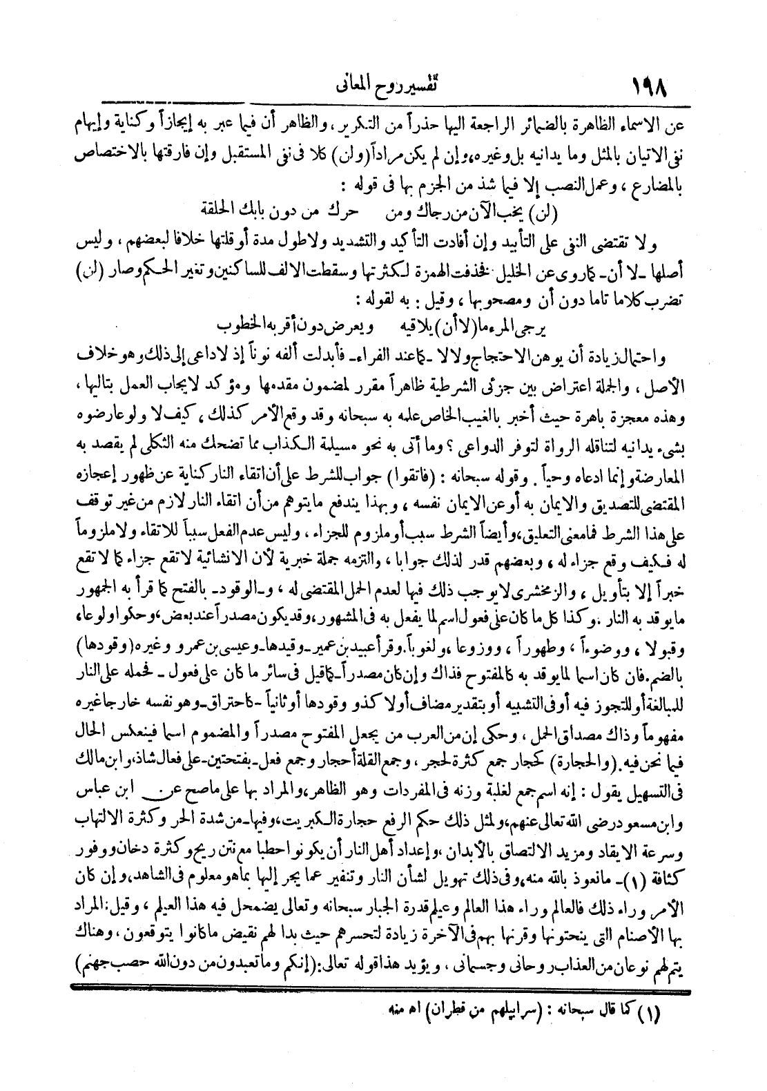 عن الأسماء الظاهرة بالضمائر الراجعة إليها حذرا من التكرير والظاهر أن فيما عبر عنه إيجازا وكناية وإيهام نفي الإتيان بالمثل وما يدانيه بل وغيره وإن لم يكن مرادا ولن كلا في نفي المستقبل وإن فارقتها بالأختصاص بالمضارع وعمل النصب إلا فيما شذ من الجزم بها في قوله : لن يخب الآن من رجاك ومن حرك من دون بابك الحلقة ولا تقتضي النفي على التأييد وإن أفادت التأكيد والتشديد ولا طول مدة أو قلتها خلافا لبعضهم وليس أصله الا أنكما روى عن الخليل : فحذفت الهمزة لكثرتها وسقطت الألف للساكنين وتغير الحكم وصار لن تضرب كلاما تاما دون أن ومصحوبها وقيل : به لقوله : يرجى المرء ما لا أن يلاقيه ويعرض دون أقربه الخطوب وإحتمال زيادة أن يوهن الإحتجاج ولا لاكما عند الفراء فأبدلت ألفه نونا إذ لا داعي إلى ذلك وهو خلاف الأصل والجملة إعتراض بين جزئي الشرطية ظاهرا مقرر لمضمون مقدمها ومؤكد لإيجاب العمل بتاليها وهذه معجزة باهرة حيث أخبر بالغيب الخاص علمه به سبحانه وقد وقع الأمر كذلك كيف لا ولو عارضوه بشيء يدانيه لتناقله الرواة لتوفر الدواعي وما أتي به نحو مسيلمة الكذاب مما تضحك منه الثكلى لم يقصد به المعارضة وإنما أدعاه وحيا وقوله سبحانه : فأتقوا جواب للشرط على أن إلتقاء النار كناية عن ظهور إعجازه المقتضي للتصديق والإيمان به أو عن الإيمان نفسه وبهذا يندفع ما يتوهم من أن إتقاء النار لازم من غير توقف على هذا الشرط فما معنى التعليق وأيضا الشرط سبب أو ملزوم للجزاء وليس عدم الفعل سببا للإتقاء ولا ملزوما له فكيف وقع جزاء له وبعضهم قدر لذلك جوابا وإلتزامه جملة خبرية لأن الإنشائية لا تقع جزاء كما لا تقع خبرا إلا بتأويل والزمخشري لا يوجب ذلك فيها لعدم الحمل المقتضى له والوقود بالفتح كما قرأ به الجمهور ما يوقد به النار وكذا كل ما كان على فعول أسم لما يفعل به في المشهور وقد يكون مصدرا عند بعض وحكوا ولوعا وقبولا ووضوءا وطهورا ووزوعا ولغوبا وقرأ عبيد بن عمير وقيدها وعيسى بن عمرو وغيره وقودها بالضم فإن كان أسما لما يوقد به كالمفتوح فذاك وإن كان مصدراكما قيل في سائر ما كان على فعول فحمله على النار للمبالغة وللتجوز فيه أو في التشبيه أو بتقدير مضاف أولا كذو وقودها أو ثانيا كإحتراق وهو نفسه خارجا غيره مفهوما وذاك مصداق الحمل وحكى إن من العرب من يجعل المفتوح مصدرا والمضموم إسما فينعكس الحال فيما نحن فيه والحجارة كحجار جمع كثرة لحجر وجمع القلة أحجار وجمع فعل بفتحتين على فعال شاذ وإبن مالك في التسهيل يقول : إنه اسم جمع لغلبة وزنه في المفردات وهو الظاهر والمراد بها على ما صح عن إبن عباس وإبن مسعود رضي الله تعالى عنهم ولمثل ذلك حكم الرفع حجارة الكبريت وفيها من شدة الحر وكثرة الإلتهاب وسرعة الإيقاد ومزيد الإلتصاق بالأبدان وإعداد أهل النار أن يكونوا حطبا مع نتن ريح وكثرة دخان ووفور كثافة ما نعوذ بالله منه وفي ذلك تهويل لشأن النار وتنفير عما يجر إليها بما هو معلوم في الشاهد وإن كان الأمر وراء ذلك فالعالم وراء هذا العالم وعيلم قدرة الجبار سبحانه وتعالى يضمحل فيه هذا العيلم وقيل : المراد بها الأصنام التي ينحتونها وقرنها بهم في الآخرة زيادة لتحسرهم حيث بدا لهم نقيض ما كانوا يتوقعون وهناك يتم لهم نوعان من العذاب روحاني وجسماني ويؤيد هذا قوله تعالى : إنكم وما تعبدون من دون الله حصب جهنم