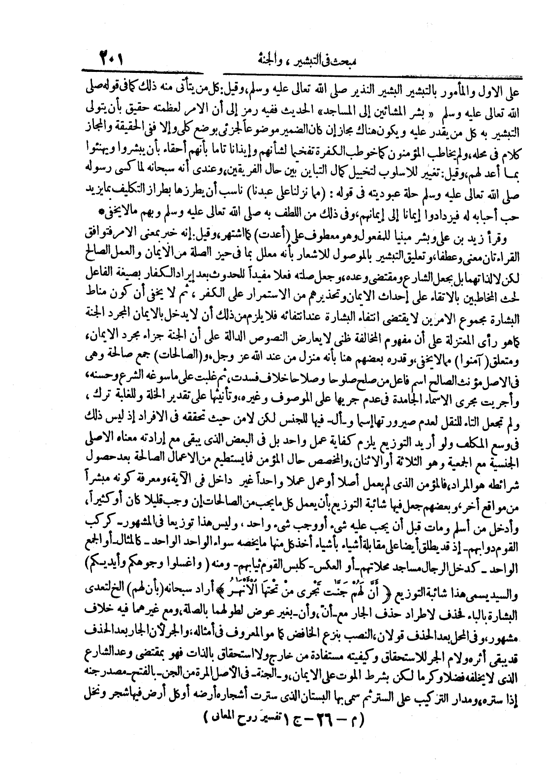 وقرأ زيد بن علي وبشر مبنيا للمفعول وهو معطوف على أعدت كما أشتهر وقيل : إنه خبر بمعنى الأمر فتوافق القراءتان معنى وعطفا وتعليق التبشير بالموصول للأشعار بأنه معلل بما في حيز الصلة من الإيمان والعمل الصالح لكن لا لذاتهما بل بجعل الشارع ومقتضى وعده وجعل صلته فعلا مفيدا للحدوث بعد إيراد الكفار بصيغة الفاعل لحث المخاطبين بالأتقاء على إحداث الإيمان وتحذيرهم من الإستمرار على الكفر ثم لا يخفى أن كون مناط البشارة مجموع الأمرين لا يقتضي إنتفاء البشارة عند إنتفائه فلا يلزم من ذلك أن لا يدخل بالإيمان المجرد الجنة كما هو رأي المعتزلة على أن مفهوم المخالفة ظني لا يعارض النصوص الدالة على أن الجنة جزاء مجرد الإيمان ومتعلق آمنوا مما لا يخفى وقدره بعضهم هنا بأنه منزل من عند الله عزوجل و الصالحات جمع صالحة وهي في الأصل مؤنث الصالح أسم فاعل من صلح صلوحا وصلاحا خلاف فسدت ثم غلبت على ما سوغه الشرع وحسنه وأجريت مجرى الأسماء الجامدة في عدم جريها على الموصوف وغيره وتأنيثها على تقدير الخلة وللغلبة ترك ولم تجعل التاء للنقل لعدم صيرورتها إسماوألفيها للجنس لكن لا من حيث تحققه في الأفراد إذ ليس ذلك في وسع المكلف ولو اريد التوزيع يلزم كفاية عمل واحد بل في البعض الذي يبقى مع إرادته معناه الأصلي الجنسية مع الجمعية وهو الثلاثة أو الإثنان والمخصص حال المؤمن فما يستطيع من الأعمال الصالحة بعد حصول شرائطه هو المراد فالمؤمن الذي لم يعمل أصلا أو عمل واحدا غير داخل في الآية ومعرفة كونه مبشرا من مواقع أخر وبعضهم جعل فيها شائبة التوزيع بأن يعمل كل ما يجب من الصالحات إن وجب قليلا كان أو كثيرا وأدخل من أسلم ومات قبل أن يجب عليه شيء أو وجب شيء واحد وليس هذا توزيعا في المشهور كركب القوم دوابهم إذ قد يطلق ايضا على مقابلة أشياء باشياء أخذ كل منها ما يخصه سواء الواحد الواحد كالمثال أو الجمع الواحد كدخل الرجال مساجد محلاتهم أو العكس كلبس القوم ثيابهم ومنه وأغسلوا وجوهكم وأيديكم والسيد يسمى هذا شائبة التوريع أن لهم جنات تجري من تحتها الأنهار أراد سبحانه بأن لهم إلخ لتعدي البشارة بالباء فحذف لإطراد حذف الجار مع أن وأن بغير عوض لطولهما بالصلة ومع غيرهما فيه خلاف مشهور وفي المحل بعد الحذف قولان النصب بنزع الخافض كما هو المعروف في أمثاله والجر لأن الجار بعد الحذف قد يبقى أثره ولام الجر للإستحقاق وكيفيته مستفداة من خارج ولا إستحقاق بالذات فهو بمقتضى وعد الشارع الذي لا يخلفه فضلا وكرما لكن بشرط الموت على الإيمان والجنة في الأصل المرة من الجنب الفتح مصدر جنه إذا ستره ومدار التركيب على الستر ثم سمى بها البستان الذي سترت أشجاره أرضه أو كل أرض فيها شجر ونخل