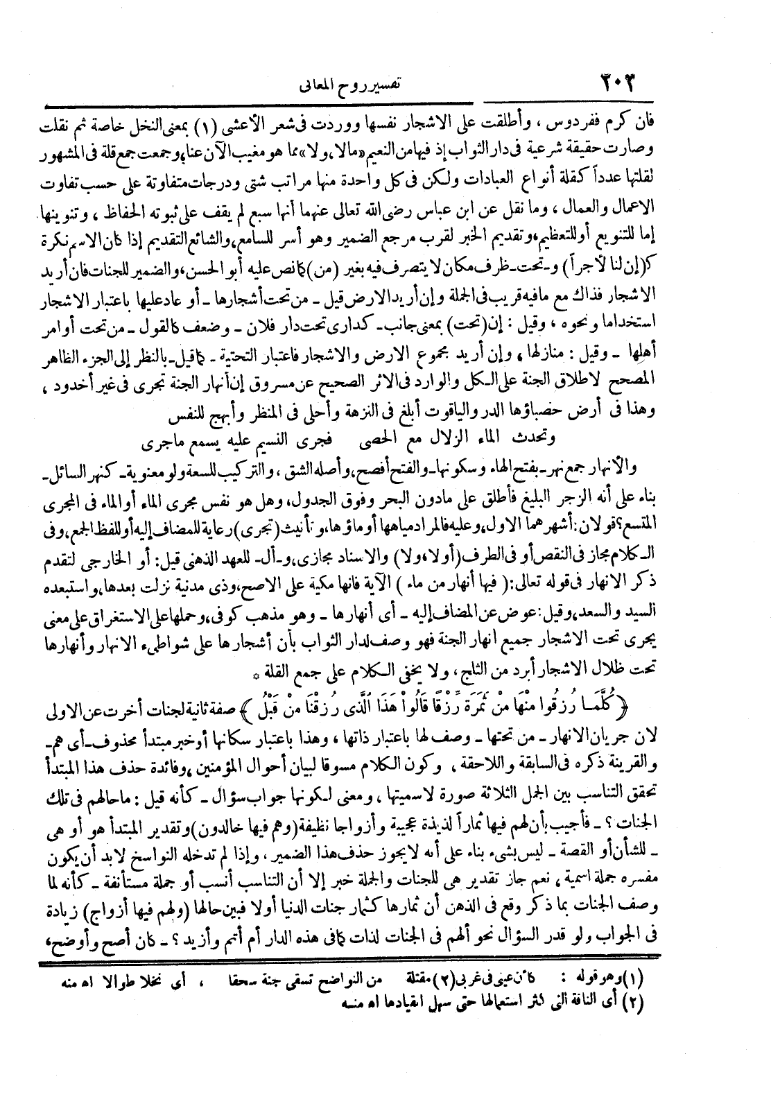 فإن كرم ففردوس وأطلقت على الأشجار نفسها ووردت في شعر الأعشى بمعنى النخل خاصة ثم نقلت وصارت حقيقة شرعية في دار الثواب إذ فيها من النعيم مالا ولا مما هو مغيب الآن عنا وجمعت جمع قلة في المشهور لقلتها عددا كقلة أنواع العبادات ولكن في كل واحدة منها مراتب شتى ودرجات متفاوتة على حسب تفاوت الأعمال والعمال وما نقل عن إبن عباس رضي الله تعالى عنهما أنها سبع لم يقف على ثبوته الحفاظ وتنوينها إما للتنويع أو للتعظيم وتقديم الخبر لقرب مرجع الضمير وهو اسر للسامع والشائع التقديم إذا كان الأسم نكرة ك إن لنا لأجرا وتحتظرف مكان لا يتصرف فيه بغير من كما نص عليه أبو الحسن والضمير للجنات فإن أريد الأشجار فذاك مع ما فيه قريب في الجملة وإن أريد الأرض قيلمن تحت أشجارها أو عاد عليها بإعتبار الأشجار إستخداما ونحوه وقيل : إن تحت بمعنى جانب كداري تحت دار فلان وضعف كالقول من تحت أوامر أهلها وقيل : مناز وإن أريد مجموع الأرض والأشجار فإعتبار التحتية كما قيل بالنظر إلى الجزء الظاهر المصحح لإظلاق الجنة على الكل والوارد في الأثر الصحيح عن مسروق إن أنهار الجنة تجري في غير أخدود وذا في أرض حصباؤها الدر والياقوت أبلغ في النزهة وأحلى في المنظر وأبهج للنفس وتحدث الماء الزلال مع الحصى فجرى النسيم عليه يسمع ما جرى والأنهار جمع نهر بفتح الهاء وسكونها والفتح أفصح وأصله الشق والتركيب للسعة ولو معنوية كنهر السائل بناء على أنه الزجر البليغ فأطلق على ما دون البحر وفوق الجدول وهل هو نفس مجرى الماء أو الماء في المجرى المتسع قولان : أشهرهما الأول وعليه فالمراد مياهها أو ماؤها وتأنيث تجري رعاية للمضاف إليه أو للفظ الجمع وفي الكلام مجاز في النقص أو في الظرف أولا ولا والإسناد مجازي وأل للعهد الذهني قيل : أو الخارجي لتقدم ذكر الأنهار في قوله تعالى : فيها أنهار من ماء الآية فإنها مكية على الأصح وذي مدنية نزلت بعدها وأستبعده السيد والسعد وقيل : عوض عن المضاف إليه أي أنهارها وهو مذهب كوفي وحملها على الإستغراق على معنى يجري تحت الأشجار جميع أنهار الجنة فهو وصف لدار الثواب بأن أشجارها على شواطيء الأنهار وأنهارها تحت ظلال الأشجار أبرد من الثلج ولا يخفى الكلام على جمع القلة