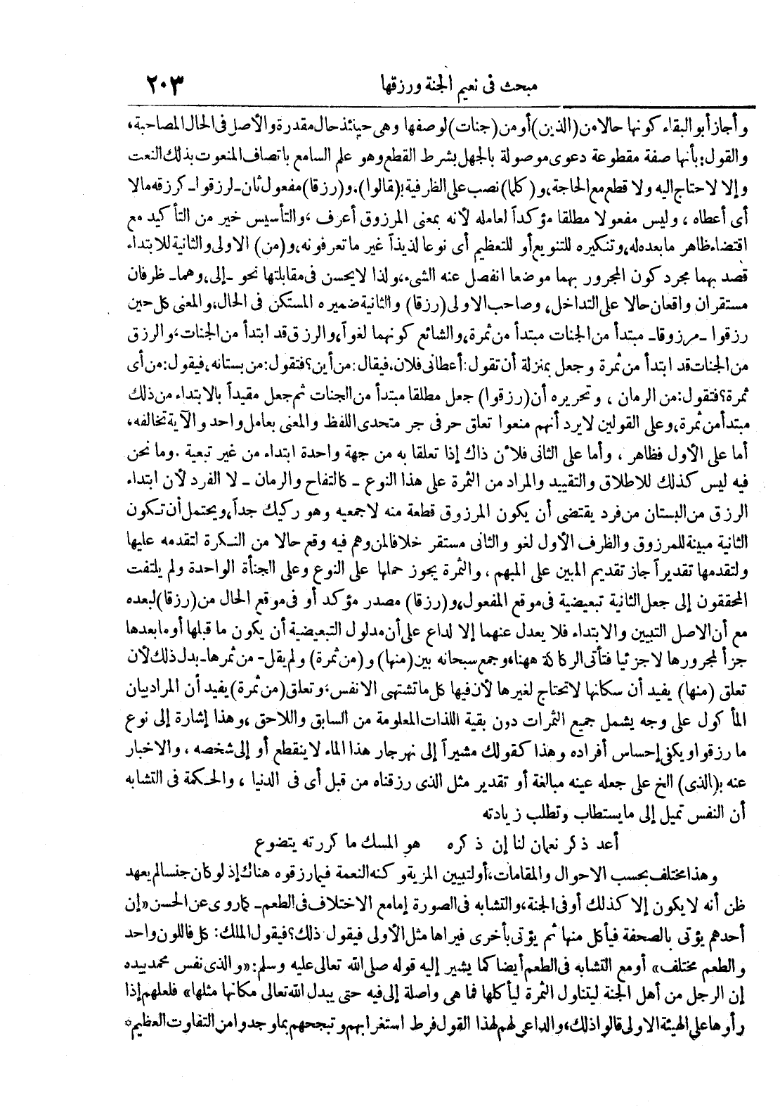 وأجاز أبو البقاء كونها حالا من الذين أو من جنات لوصفها وهي حينئذ حال مقدرة والاصل فيها المصاحبة والقول : بأنها صفة مقطوعة دعوى موصولة بالجهل بشرط القطع وهو علم السامع بإتصاف المنعوت بذلك النعت وإلا لأحتاج إليه ولا قطع مع الحاجة و كلما نصب على الظرفية ب قالوا و رزقا مفعول ثان لرزقوا كرزقه مالا أي أعطاه وليس مفعولا مطلقا مؤكدا لعامله لأنه بمعنى المرزوق أعرف والتأسيس خير من التأكيد مع إقتضاء ظاهر ما بعده له وتنكيره للتنويع أو للتعظيم أي نوعا لذيذا غير ما تعرفونه و من الأولى والثانية للإبتداء قصد بهما مجرد كون المجرور بهما موضعا أنفصل عنه الشيء ولذا لا يحسن في مقابلتها نحو إلى وهما ظرفان مستقران واقعان حالا على التداخل وصاحب الأولى رزقا والثانية ضميره المستكن في الحال والمعنى كل حين رزقوا مرزوقا مبتدأ من الجنات مبتدأ من ثمرة والشائع كونهما لغوا والرزق قد إبتدأ من الجنات والرزق من الجنات قد إبتدأ من ثمرة وجعل بمنزلة أن تقول أعطاني فلان فيقال من أين فتقول : من بستانه فيقول : من اي ثمرة فتقول : من الرمان وتحريره أن رزقوا جعل مطلقا مبتدأ من الجنات ثم جعل مقيدا بالإبتداء من ذلك مبتدأ ثمرة وعلى القولين لا يرد أنهم منعوا تعلق حرفي جر متحدي اللفظ والمعنى بعامل واحد والآية تخالفه أما على الأول فظاهر وأما على الثاني فلأن ذاك إذا تعلقا به من جهة واحدة إبتداء من غير تبعية ومن نحن فيه ليس كذلك للإطلاق والتقييد والمراد من الثمرة على هذا النوع كالتفاح والرمان لا الفرد لأن إبتداء الرزق من البستان من فرد يقتضي أن يكون المرزوق قطعة منه أجمعيه وهو ركيك جدا ويحتمل أن تكون الثانية مبينة للمرزوق والظرف الأول لغو والثاني مستقر خلافا لمن وهم فيه وقع حالا من النكرة لتقدمه عليها ولتقدمها تقديرا جاز تقديم المبين على المبهم والثمرة يجوز حملها على النوع وعلى الجنأة الواحدة ولم يلتفت المحققون إلى جعل الثانية تبعيضية في موقع المفعول و رزقا مصدر مؤكد أو في موقع الحال من رزقا لبعده مع أن الأصل التبيين والإبتداء فلا يعدل عنهما إلا لداع على أن مدلول التبعيضية أن يكون ما قبلها أو ما بعدها جزا لمجرورها لا جزئيا فتأتي الركاكة ههنا وجمع سبحانه بين منها و من ثمرة ولم يقلمن ثمرها بدل ذلك لأن تعلق منها يفيد أن سكانها لا تحتاج لغيرها لأن فيها كل ما تشتهي الأنفس وتعلق من ثمرة يفيد أن المراد بيان المأكول على وجه يشمل جميع الثمرات دون بقية اللذات المعلومة من السابق واللاحق وهذا إشارة إلى نوع ما رزقوا ويكفي إحساس أفراده وهذا كقولك مشيرا إلى نهر جار هذا الماء لا ينقطع أو إلى شخصه والأخبار عنه ب الذي إلخ على جعله عينه مبالغة أو تقدير مثل الذي رزقناه من قبل أي في الدنيا والحكمة في التشابه أن النفس تميل إلى ما يستطاب وتطلب زيادته أعد ذكر نعمان لنا إن ذكره هو المسك ما كررته يتضوع وهذا مختلف بحسب الأحوال والمقامات أو لتبيين المرية وكنه النعمة فيما رزقوه هناك إذ لو كان جنسا لم يعهد ظن أنه لا يكون إلا كذلك أو في الجنة والتشابه في الصورة إما مع الإختلاف في الطعم كما روى عن الحسن إن أحدهم يؤتى بالصحفة فيأكل منها ثم يؤتى بأخرى فيراها مثل الأولى فيقول ذلك فيقول الملك : كل فاللون واحد والطعم مختلف أو مع التشابه في الطعم أيضا كما يشير إليه قوله صلى الله تعالى عليه وسلم : والذي نفس محمد بيده إن الرجل من أهل الجنة ليتناول الثمرة ليأكلها فما هي واصلة إلى فيه حتى يبدل الله تعالى مكانها مثلها فلعلهم إذا رأوها على الهيئة الأولى قالوا ذلك والداعي لهم لهذا القول فرط إستغرابهم وتبجحهم بما وجدوا من التفاوت العظيم