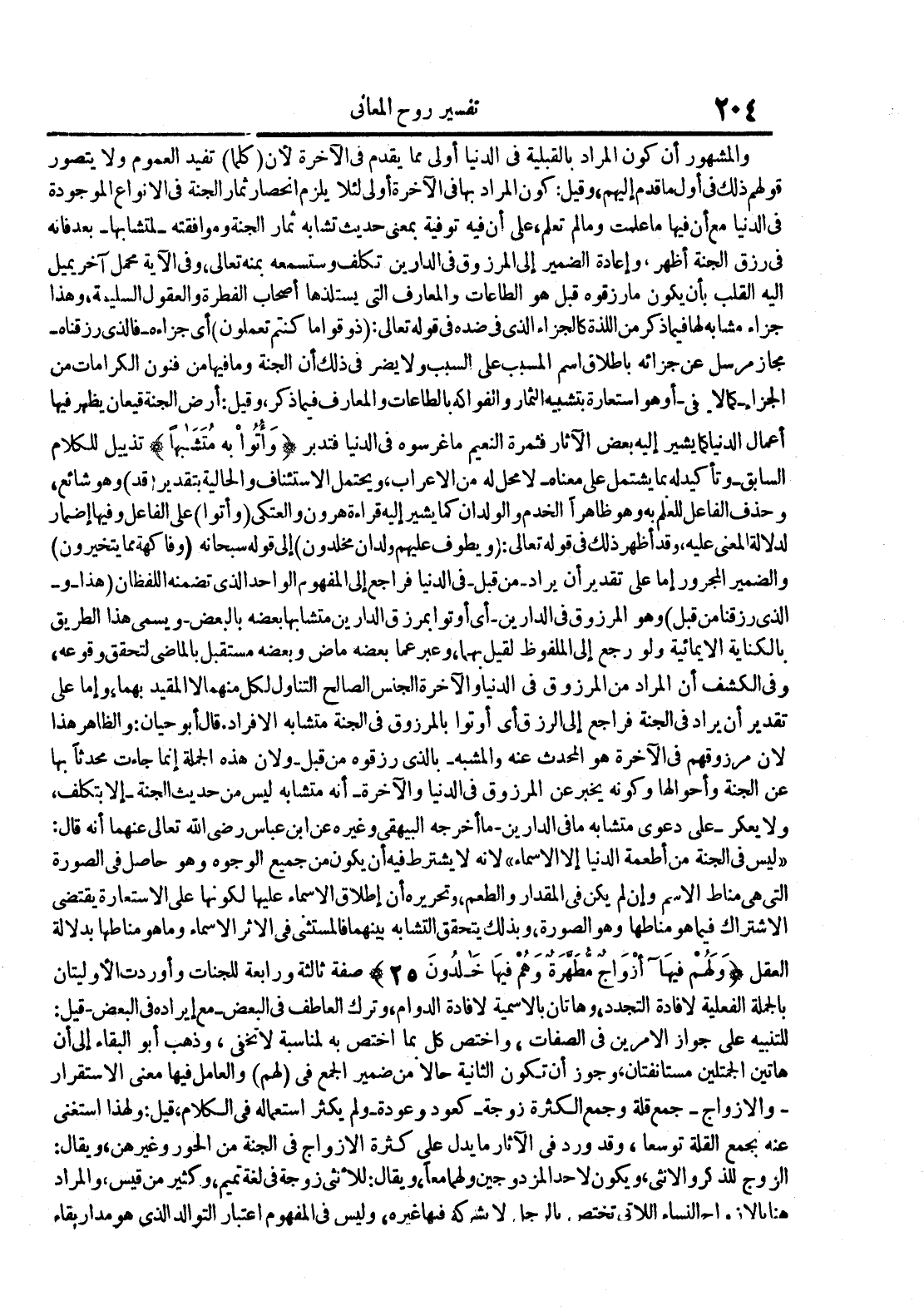 والمشهور أن كون المراد بالقبلية في الدنيا أولى مما يقدم في الآخرة لأن كلما تفيد العموم ولا يتصور قولهم ذلك في أول ما قدم إليهم وقيل : كون المراد بها في الآخرة أولى لئلا يلزم إنحصار ثمار الجنة في الأنواع الموجودة في الدنيا مع أن فيها ما علمت وما لم تعلم على أن فيه توفية بمعنى حديث تشابه ثمار الجنة وموافقته لمتشابها بعد فإنه في رزق الجنة أظهر وإعادة الضمير إلى المرزوق في الدارين تكلف وستسمعه بمنه تعالى وفي الآية محمل آخر يميل إليه القلب بأن يكون ما رزقوه قبل هو الطاعات والمعارف التي يستلذها أصحاب الفطرة والعقول السليمة وهذا جزاء مشابه لها فيما ذكر من اللذة كالجزاء الذي في ضده في قوله تعالى : ذو قواما كنتم تعملون أي جزاءه فالذي رزقناه مجاز مرسل عن جزائه بإطلاق أسم المسبب على السبب ولا يضر في ذلك أن الجنة وما فيها من فنون الكرامات من الجزاء كمالا في أو هو إستعارة بتشبيه الثمار والفواكه بالطاعات والمعارف فيما ذكر وقيل : أرض الجنة قيعان يظهر فيها أعمال الدنيا كما يشير إليه بعض الآثار فثمرة النعيم ما غرسوه في الدنيا فتدبر وأتوا به متشابها تذييل للكلام السابق وتأكيد له بما يشتمل على معناه لا محل له من الإعراب ويحتمل الإستئناف والحالية بتقدير قد وهو شائع وحذف الفاعل للعلم به وهو ظاهرا الخدم والولدان كما يشير إليه قراءة هرون والعتكي وأتوا على الفاعل وفيها إضمار لدلالة المعنى عليه وقد أظهر ذلك في قوله تعالى : ويطوف عليهم ولدان مخلدون إلى قوله سبحانه وفاكهة مما يتخيرون والضمير المجرور إما على تقدير أن يراد من قبل في الدنيا فراجع إلى المفهوم الواحد الذي تضمنه اللفظان هذا والذي رزقنا من قبل وهو المرزوق في الدارين أي أتوا بمرزوق الدارين متشابها بعضه بالبعض ويسمى هذا الطريق بالكناية الإيمائية ولو رجع إلى الملفوظ لقيل بهما وعبر عما بعضه ماض وبعضه مستقبل بالماضي لتحقق وقوعه وفي الكشف أن المراد من المرزوق في الدنيا والآخرة الجنس الصالح التناول لكل منهما لا المقيد بهما وإما على تقدير أن يراد في الجنة فراجع إلى الرزق أي أتوا بالمرزوق في الجنة متشابه الأفراد قال أبو حيان : والظاهر هذا لأن مرزوقهم في الآخرة هو المحدث عنه والمشبه بالذي رزقوه من قبل ولأن هذه الجملة إنما جاءت محدثا بها عن الجنة وأحوالها وكونه يخبر عن المرزوق في الدنيا والآخرة أنه متشابه ليس من حديث الجنة إلا بتكلف ولا يعكر على دعوى متشابه ما في الدارين ما أخرجه البيهقي وغيره عن إبن عباس رضي الله تعالى عنهما أنه قال : ليس في الجنة من أطعمة الدنيا إلا الأسماء لأنه لا يشترط فيه أن يكون من جميع الوجوه وهو حاصل في الصورة التي هي مناط الأسم وإن لم يكن في المقدار والطعم وتحريره أن إطلاق الأسماء عليها لكونها على الإستعارة يقتضي الإشتراك فينا هو ناطها وهو الصورة وبذلك يتحقق التشابه بينهما فالمستثنى في الأثر الأسماء وما هو مناطها بدلالة العقل ولهم فيها أزواج مطهرة وهم فيها خالدون 52 صفة ثالثة ورابعة للجنات وأوردت الأوليتان بالجملة الفعلية لإفادة التجدد وهاتان بالأسمية لإفادة الدوام وترك العاطف في البعضمع إيراده في البعض قيل : للتنبيه على جواز الأمرين في الصفات وأختص كل بما أختص به لمناسبة لا تخفى وذهب أبو البقاء إلى أن هاتين الجملتين مستأنفتان وجوز أن تكون الثانية حالا من ضمير الجمع في لهم والعامل فيها معنى الإستقرار والأزواج جمع قلة وجمع الكثرة زوجة كعود وعودة ولم يكثر إستعماله في الكلام قيل : ولهذا أستغنى عنه بجمع القلة توسعا وقد ورد في الآثار ما يدل على كثرة الأزواج في الجنة من الحور وغيرهن ويقال : الزوج للذكر والأنثى ويكون لا حد المزدوجين ولهما معا ويقال : للأنثى زوجة في لغة تميم وكثير من قيس والمراد هنا بالأزواج النساء اللاتي تختص بالرجل لا يشركه فيها غيره وليس في المفهوم إعتبار التوالد الذي هو مدار بقاء