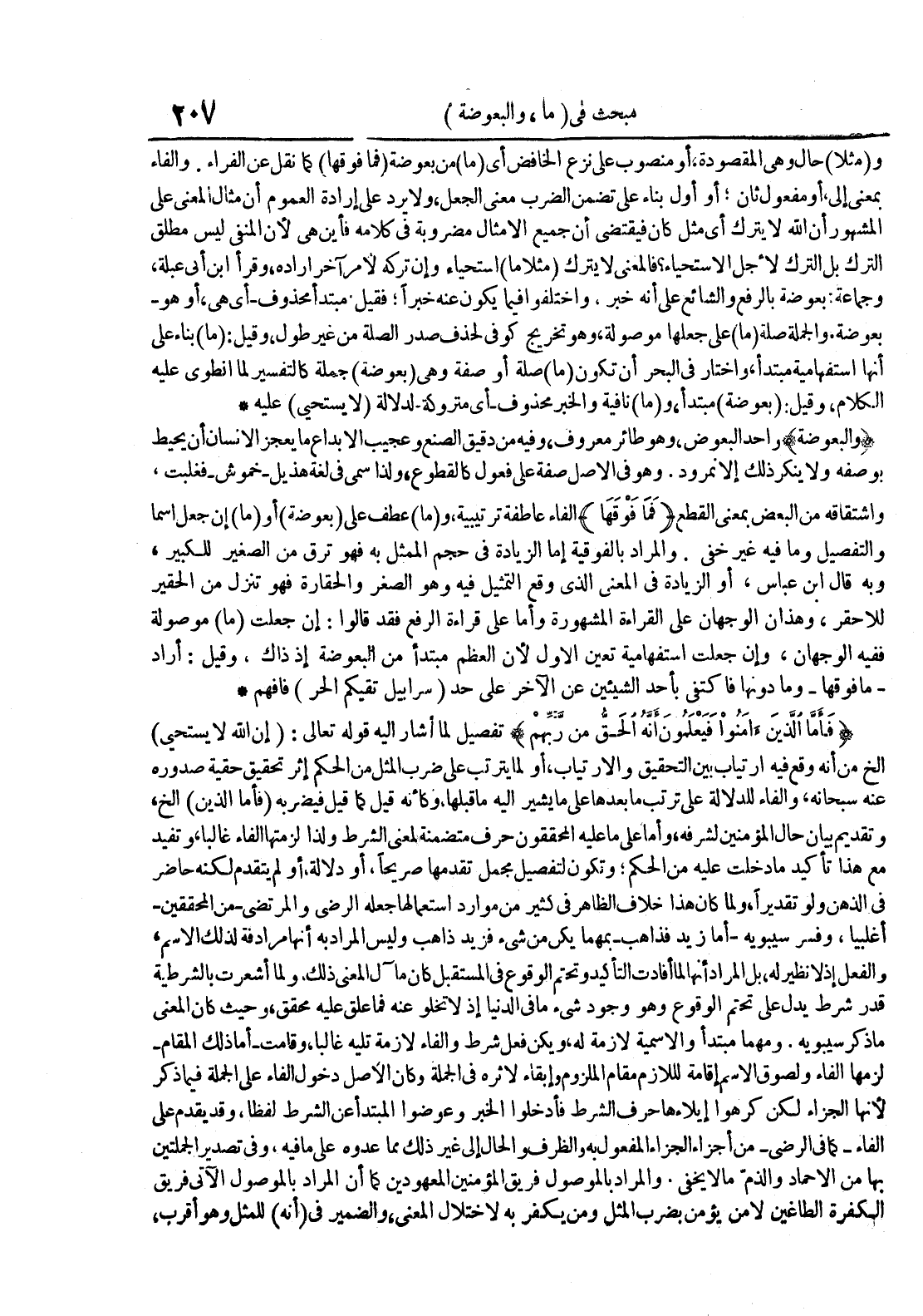 فأما الذين آمنوا فيعلمون أنه الحق من ربهم تفصيل لما أشار إليه قوله تعالى : إن الله لا يستحيي إلخ من أنه وقع فيه إرتياب بين التحقيق والأرتياب أو لما يترتب على ضرب المثل من الحكم إثر تحقيق حقية صدوره عنه سبحانه والفاء للدلالة على ترتب ما بعدها على ما يشير إليه ما قبلها وكأنه قيل كما قيل فيضربه فأما الذين إلخ وتقديم بيان حال المؤمنين لشرفه وأما على ما عليه المحققون حرف متضمنة لمعنى الشرط ولذا لزمتها الفاء غالبا وتفيد مع هذا تأكيد ما دخلت عليه من الحكم وتكون لتفصيل مجمل تقدمها صريحا أو دلالة أو لم يتقدم لكنه حاضر في الذهن ولو تقديرا ولما كان هذا خلاف الظاهر في كثير من موارد إستعمالها جعله الرضى والمرتضى من المحققين أغلبيا وفسر سيبويه أما زيد فذاهب مهما يكن من شيء فزيد ذاهب وليس المراد به أنها مرادفة لذلك الأسم والفعل إذ لا نظير له بل المراد أنها لما أفادت التأكيد وتحتم الوقوع في المستقبل كان مآل المعنى ذلك ولما أشعرت بالشرطية قدر شرط يدل على تحتم الوقوع وهو وجود شيء ما في الدنيا إذ لا تخلو عنه فما علق عليه محقق وحيث كان المعنى ما ذكر سيبويه ومهما مبتدأ والأسمية لازمة له ويكن فعل شرط والفاء لازمة تليه غالبا وقامت أما ذلك المقام لزمها الفاء ولصوق الأسم إقامة لللازم مقام الملزوم وإبقاء لأثره في الجملة وكان الأصل دخول الفاء على الجملة فيما ذكر لأنها الجزاء لكن كرهوا إيلاءها حرف الشرط فأدخلوا الخبر وعوضوا المبتدأ عن الشرط لفظا وقد يقدم على الفاء كما في الرضى من أجزاء الجزاء المفعول به والظرف والحال إلى غير ذلك مما عدوه على ما فيه وفي تصدير الجملتين بها من الأحماد والذم ما لا يخفى والمراد بالموصول فريق المؤمنين المعهودين كما أن المراد بالموصول الآتي فريق الكفرة الطاغين لا من يؤمن بضرب المثل ومن يكفر به لإختلال المعنى والضمير في أنه للمثل وهو أقرب