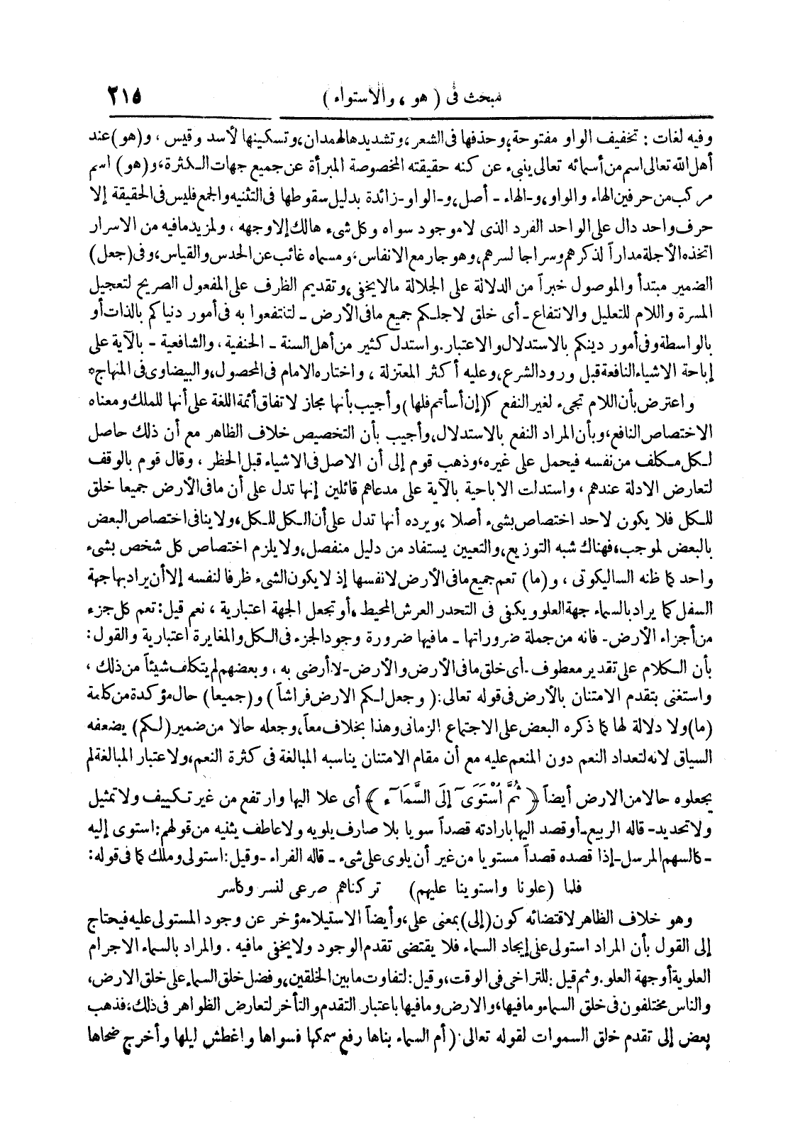 واعترض بأن اللام تجيء لغير النفع ك إن أسأتم فلها وأجيب بأنها مجاز لاتفاق أئمة اللغة على أنها للملك ومعناه الإختصاص النافع وبأن المراد النفع بالإستدلال وأجيب بأن التخصيص خلاف الظاهر مع أن ذلك حاصل لكل مكلف من نفسه فيحمل على غيره وذهب قوم إلى أن الأصل في الأشياء قبل الحظر وقال قوم بالوقف لتعارض الأدلة عندهم واستدلت الإباحية بالآية على مدعاهم قائلين إنها تدل على أن ما في الأرض جميعا خلق للكل فلا يكون لأحد اختصاص بشيء أصلا ويرده أنها تدل على أن الكل للكل ولا ينافي اختصاص البعض بالبعض لموجب فهناك شبه التوزيع والتعيين يستفاد من دليل منفصل ولا يلزم اختصاص كل شخص بشيء واحد كما ظنه الساليكوتي و ما تعم جميع ما في الأرض لأنفسها إذ لا يكون الشيء ظرفا لنفسه إلا أن يراد بها جهة السفل كما يراد بالسماء جهة العلو ويكفي في التحدر العرش المحيط أو تجعل الجهة اعتبارية نعم قيل تعم كل جزء من أجزاء الأرض فإنه من جملة ضروراتها ما فيها ضرورة وجود الجزء في الكل والمغايرة اعتبارية والقول بأن الكلام على تقدير معطوف أي خلق ما في الأرض والأرض لا أرضى به وبعضهم لم يتكلف شيئا من ذلك واستغنى بتقدم الإمتنان بالأرض في قوله تعالى وجعل لكم الأرض فراشا و جميعا حال مؤكدة من كلمة ما ولا دلالة لهما كما ذكره البعض على الإجتماع الزماني وهذا بخلاف معا وجعله حالا من ضمير لكم يضعفه السياق لأنه لتعداد النعم دون المنعم عليه مع أن مقام الإمتنان يناسبه المبالغة في كثرة النعم ولاعتبار المبالغة لم يجعلوه حالا من الأرض أيضا ثم استوى إلى السماء أي علا إليها وارتفع من غير تكييف ولا تمثيل ولا تحديد قاله الربيع أو قصد إليها بإرادته قصدا سويا بلا صارف يلويه ولا عاطف يثنيه من قولهم استوى إليه كالسهم المرسل إذا قصده قصدا مستويا من غير أن يلوى على شيء قاله الفراء وقيل استولى وملك كما في قوله ... فلما علونا واستوينا عليهم ... تركناهم صرعى لنسر وكاسر ...