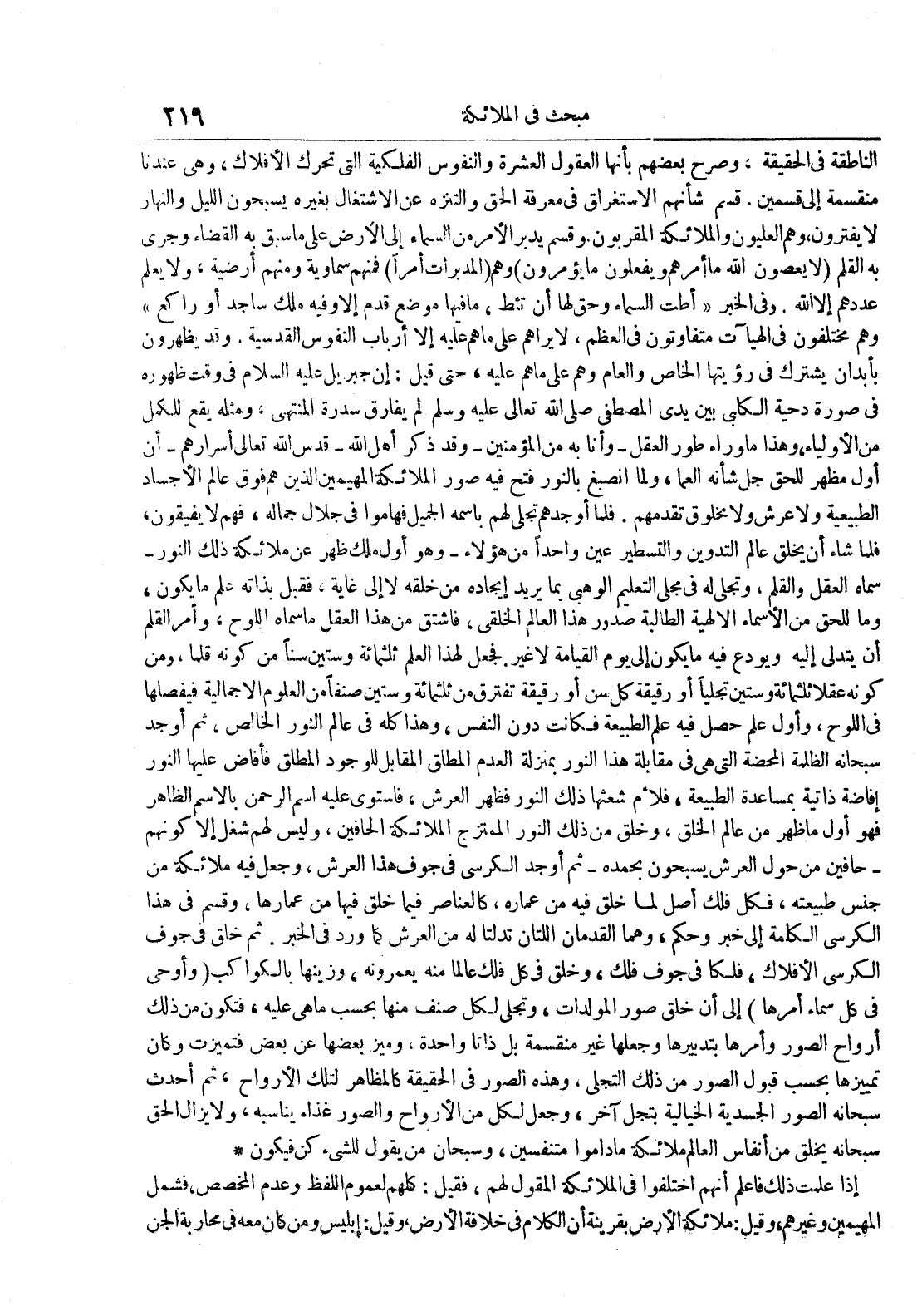 الناطقة في الحقيقة وصرح بعضهم بأنها العقول العشرة والنفوس الفلكية التي تحرك الأفلاك وهي عندنا منقسمة إلى قسمين قسم شأنهم الإستغراق في معرفة الحق والتنزه عن الإشتغال بغيره يسبحون الليل والنهار لا يفترون وهم العليون والملائكة المقربون وقسم يدبر الأمر من السماء إلى الأرض على ما سبق به القضاء وجرى به القلم لا يعصون الله ما أمرهم ويفعلون ما يؤمرون وهم المدبرات أمرا فمنهم سماوية ومنهم أرضية ولا يعلم عددهم إلا الله وفي الخبر آطت السماء وحق لها أن تئط ما فيها موضع قدم إلا وفيه ملك ساجد أو راكع وهم مختلفون في الهيآت متفاوتون في العظم لا يراهم على ما هم عليه إلا أرباب النفوس القدسية وقد يظهرون بأبدان يشترك في رؤيتها الخاص والعام وهم على ما هم عليه حتى قيل : إن جبريل عليه السلام في وقت ظهوره في صورة دحية الكلبي بين يدي المصطفى صلى الله تعالى عليه وسلم لم يفارق سدرة المنتهى ومثله يقع للكمل من الأولياء وهذا ما وراء طور العقل وأنا به من المؤمنين وقد ذكر أهل الله قدس الله تعالى أسرارهم أن أول مظهر للحق جل شأنه العما ولما أنصبغ بالنور فتح فيه صور الملائكة الميهمين الذين هم فوق عالم الأجساد الطبيعية ولا عرش ولا مخلوق تقدمهم فلما اؤجدهم تجلى لهم بأسمه الجميل فهاموا في جلال جماله فهم لا يفيقون فلما شاء أن يخلق عالم التدوين والتسطير عين واحدا من هؤلاء وهو أول ملك ظهر عن ملائكة ذلك النور سماه العقل والقلم وتجلى له في مجلى التعليم الوهبي بما يريد إيجاده من خلقه لاإلى غاية فقبل بذاته علم ما يكون وما للحق من الأسماء الألهية الطالبة صدور هذا العالم الخلقي فأشتق من هذا العقل ما سماه اللوح وأمر القلم أن يتدلى إليه ويودع فيه ما يكون إلى يوم القيامة لا غير فجعل لهذا العلم ثلثمائة وستين سنا من كونه قلما ومن كونه عقلا ثلثمائة وستين تجليا أو رقيقة كل سن أو رقيقة تفترق من ثلثمائة وستين صنفا من العلوم الإجمالية في فصلها في اللوح وأول علم حصل فيه علم الطبيعة فكانت دون النفس وهذا كله في عالم النور الخالص ثم أوجد سبحانه الظلمة المحضة التي هي في مقابلة هذا النور بمنزلة العدم المطلق المقابل للوجود المطلق فأفاض عليها النور إفاضة ذاتية بمساعدة الطبيعة فلآم شعثها ذلك النور فظهر العرش فأستوى عليه أسم الرحمن بالأسم الظاهر فهو أول ما ظهر من عالم الخلق وخلق من ذلك النور الممتزج الملائكة الحافين وليس لهم شغل إلا كونهم حافين من حول العرش يسبحون بحمدهثم أوجد الكرسي في جوف هذا العرش وجعل فيه ملائكة من جنس طبيعته فكل فلك أصل لما خلق فيه من عماره كالعناصر فيما خلق فيها من عمارها وقسم في هذا الكرسي الكلمة إلى خبر وحكم وهما القدمان اللتان تدلتا له من العرش كما ورد في الخبر ثم خلق في جوف الكرسي الأفلاك فلكا في جوف فلك وخلق في كل فلك عالما منه يعمرونه وزينها بالكواكب وأوحى في كل سماء أمرها إلى أن خلق صور المولدات وتجلى لكل صنف منها بحسب ما هي عليه فتكون من ذلك أرواح الصور وأمرها بتدبيرها وجعلها غير منقسمة بل ذاتا واحدة وميز بعضها عن بعض فتميزت وكان تمييزها بحسب قبول الصور من ذلك التجلي وهذه الصور في الحقيقة كالمظاهر لتلك الأرواح ثم أحدث سبحانه الصور الجسدية الخيالية بتجلي آخر وجعل لكل من الأرواح والصور غذاء يناسبه ولا يزال الحق سبحانه يخلق منأنفاس العالم ملائكة ماداموا متنفسين وسبحان من يقول للشيء كن فيكون