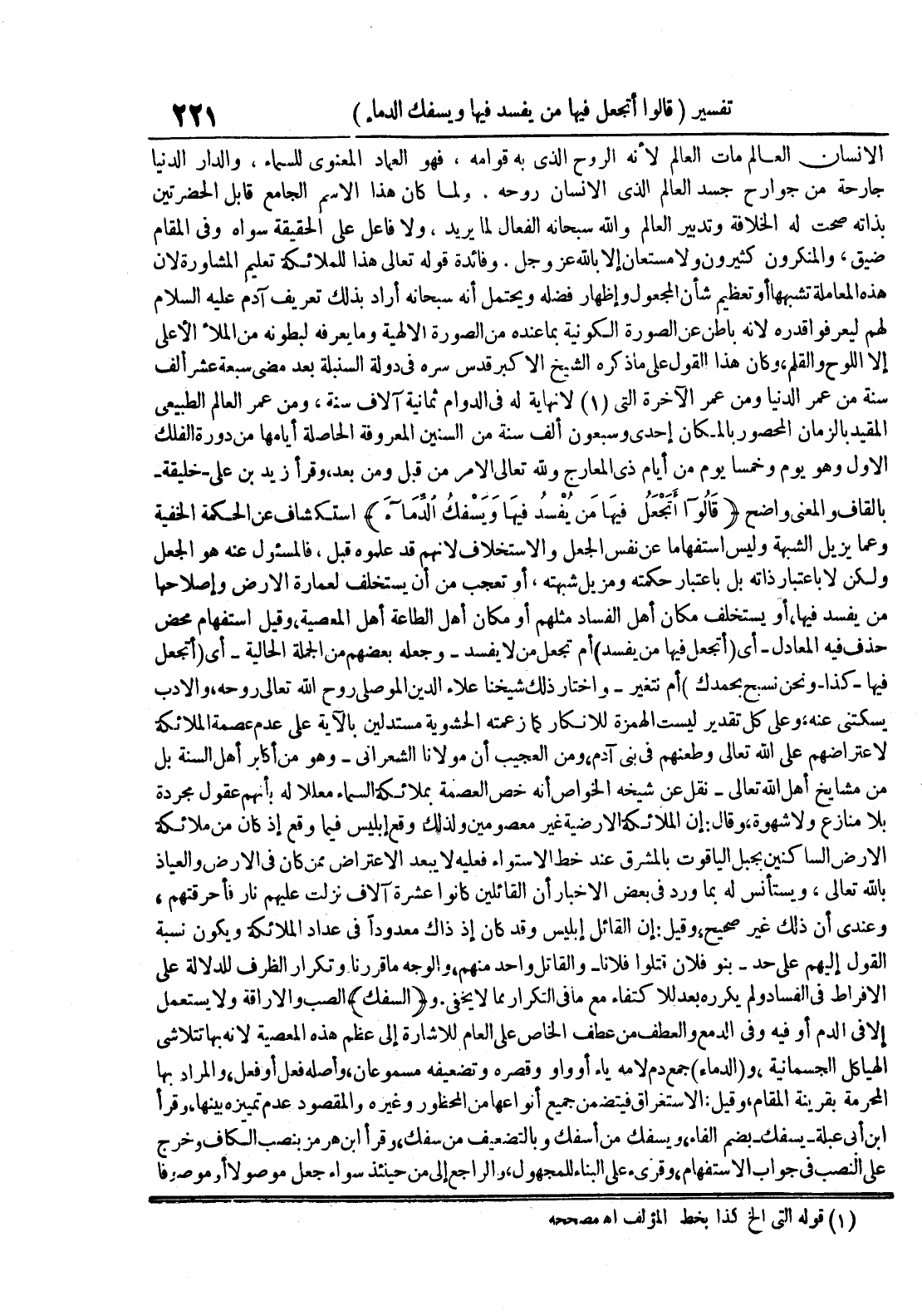 الإنسان العالم مات العالم لأنه الروح الذي به قوامه فهو العماد المعنوي للسماء والدار الدنيا جارحة من جوارح جسد العالم الذي الإنسان روحه ولما كان هذا الأسم الجامع قابل الحضرتين بذاته صحت له الخلافة وتدبير العالم والله سبحانه الفعال لما يريد ولا فاعل على الحقيقة سواه وفي القيام ضيق والمنكرون كثيرون ولا مستعان إلا بالله عز و جل وفائدة قوله تعالى هذا للملائكة تعليم المشاورة لأن هذه المعاملة تشبهها أو تعظيم شأن المجعول وإظهار فضله ويحتمل أنه سبحانه أراد بذلك تعريف آدم عليه السلام لهم ليعرفوا قدره لأنه باطن عن الصورة الكونية بما عنده من الصورة الألهية وما يعرفه لبطونه من الملأ الأعلى إلا اللوح والقلم وكان هذا القول على ماذكره الشيخ الأكبر قدس سره في دولة السنبلة بعد مضي سبعة عشر ألف سنة من عمر الدنيا ومن عمر الآخرة التي لا نهاية له في الدوام ثمانية آلاف سنة ومن عمر العالم الطبيعي المفيد بالزمان المحصور بالمكان إحدى وسبعون ألف سنة من السنين المعروفة الحاصلة أيامها من دورة الفلك الأول هو يوم وخمسا يوم من أيام ذي المعارج ولله تعالى الأمر من قبل ومن بعد وقرأ زيد بن علي خليقة بالقاف والمعنى واضح قالوا أتجعل فيها من يفسد فيها ويسفك الدماء إستكشاف عن الحكمة الخفية وعما يزيل الشبهة وليس إستفهاما عن نفس الجعل والإستخلاف لأنهم قد علموه قبل فالمسؤول عنه هو الجعل ولكن لا بإعتبار ذاته بل بإعتبار حكمته ومزيل شبهته أو تعجب من أن يستخلف لعمارة الأرض وإصلاحها من يفسد فيها أو يستخلف مكان أهل الفساد مثلهم أو مكان أهل الطاعة أهل المعصية وقيل : إستفهام محض حذف فيه المعاد لأي أتجعل فيها من يفسد أم تجعل من لا يفسد وجعله بعضهم منالجملة الحالية أي أتجعل فيها كذا ونحن نسبح بحمدك أم نتغير وأختار ذلك شيخنا علاء الدين الموصلي روح الله تعالى روحه والأدب يسكتنى عنه وعلى كل تقدير ليست الهمزة للإنكار كما زعمته الحشوية مستدلين بالآية على عدم عصمة الملائكة لإعتراضهم على الله تعالى وطعنهم في بني آدم ومن العجيب أن مولانا الشعراني وهو من أكابر أهل السنة بل من مشايخ أهل الله تعالى نقل عن شيخه الخواص أنه خص العصمة بملائكة السماء معلالا له بأنهم عقول مجردة بلا منازع ولا شهوة وقال : إن الملائكة الأرضية غير معصومين ولذلك وقع إبليس فيما وقع إذ كان من ملائكة الأرض الساكنين بجبل الياقوت بالمشرق عند خط الإستواء فعليه لا يبعد الإعتراض ممن كان في الأرض والعياذ بالله تعالى ويستأنس له بما ورد في بعض الأخبار أن القائلين كانوا عشرة آلاف نزلت عليهم نار فأحرقتهم وعندي أن ذلك غير صحيح وقيل : إن القائل إبليس وقد كان إذ ذاك معدودا في عداد الملائكة ويكون نسبة القول إليهم على حد بنو فلان قتلوا فلانا والقاتل واحد منهم والوجه ما قررنا وتكرار الظرف للدلالة على الأفراط في الفساد ولم يكرره بعد للإكتفاء مع ما في التكرار مما لا يخفى و السفك الصب والإراقة ولا يستعمل إلا في الدم أو فيه وفي الدمع والعطف من عطف الخاص على العام للإشارة إلى عظم هذه المعصية لأنه بها تتلاشى الهياكل الجسمانية و الدماء جمع دم لامه ياء أو واو وقصره وتضعيفه مسموعان وأصله فعل أو فعل والمراد بها المحرمة بقرينة المقام وقيل : الإستغراق فيتضمن جميع أنواعها من المحظور وغيره والمقصود عدم تمييزه بينها وقرأ إبن أبي عبلةيسفكبضم الفاء ويسفك من أسفك وبالتضعيف من سفك وقرأ إبن هرمز بنصب الكاف وخرج على النصب في جواب الإستفهام وقريء على البناء للمجهول والراجع إلى من حينئذ سواء جعل موصولا أو موصوفا