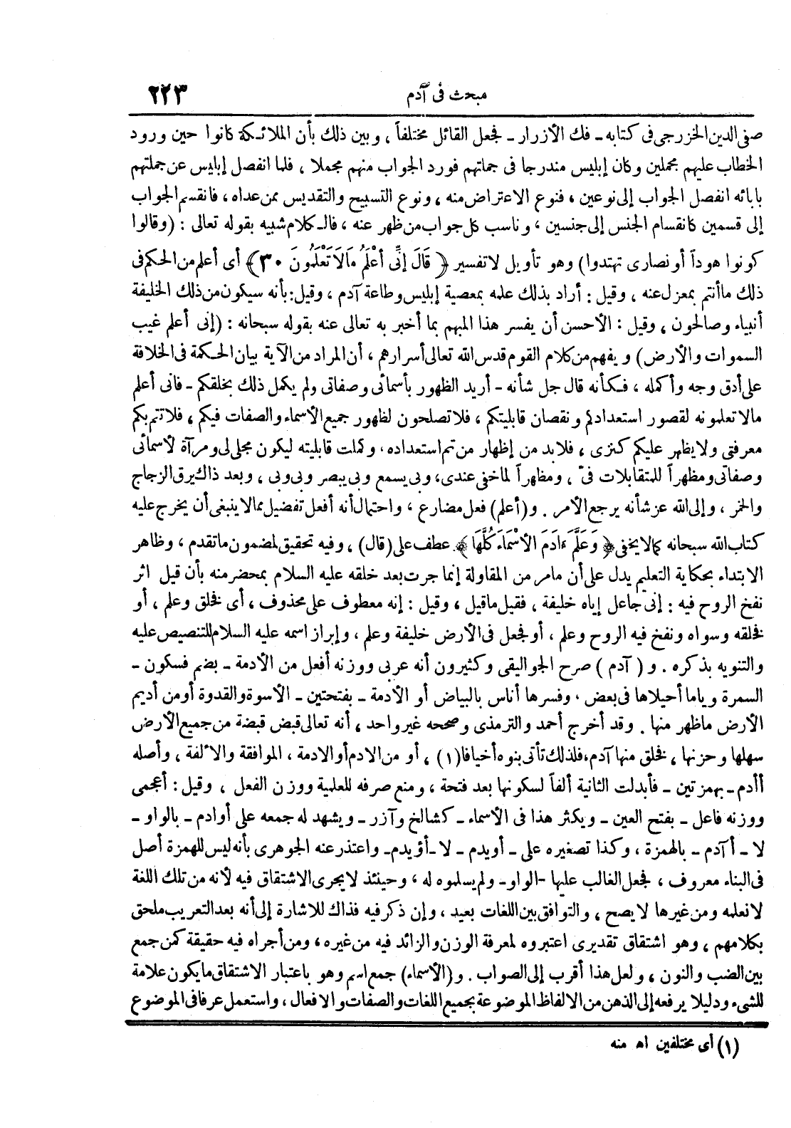 صفي الدين الخزرجي في كتابه فك الأزرار فجعل القائل مختلفا وبين ذلك بأن الملائكة كانوا حين ورود الخطاب عليهم مجملين وكان إبليس مندرجا في جملتهم فورد الجواب منهم مجملا فلما أنفصل إبليس عن جملتهم بابإئه أنفصل الجواب إلى نوعين فنوع الأعتراض منه ونوع التسبيح والتقديس ممن عداه فأنقسم الجواب إلى قسمين كإنقسام الجنس إلى جنسين وناسب كل جواب منظهر عنه فالكلام شبيه بقوله تعالى : وقالوا كونوا هودا أو نصارى تهتدوا وهو تأويل لا تفسير قال إني أعلم ما لا تعلمون 03 أي اعلم من الحكم في ذلك ما أنتم بمعزل عنه وقيل : أراد بذلك علمه بمعصية إبليس وطاعة آدم وقيل : بأنه سيكون من ذلك الخليفة أنبياء وصالحون وقيل : الأحسن أن يفسر هذا المبهم بما أخبر به تعالى عنه بقوله سبحانه : إني أعلم غيب السموات والأرض ويفهم من كلام القوم قدس الله تعالى أسرارهم أن المراد من الآية بيان الحكمة في الخلافة على دق وجه وأكمله فكأنه قال جل شأنه أريد الظهور بأسمائي وصفاتي ولم يكمل ذلك بخلقكم فإني أعلم ما لا تعلمونه لقصور إستعدادكم ونقصان قابليتكم فلا تصلحون لظهور جميع الأسماء والصفات فيكم فلا تتم بكم معرفتي ولا يظهر عليكم كنزي فلا بد من إظهار من تم إستعداده وكملت قابليته ليكون مجلى لي ومرآة لأسمائي وصفاتي ومظهرا للمتقابلات في ومظهرا لما خفي عندي وبي يسمع وبي يبصر وبي وبي وبعد ذاك يرق الزجاج والخمر وإلى الله عز شأنه يرجع الأمر و أعلم فعل مضارع وإحتمال أنه أفعل تفضيل مما لا ينبغي أن يخرج عليه كتاب الله سبحانه كما لا يخفى وعلم آدم الأسماء كلها عطف على قال وفيه تحقيق لمضمون ما تقدم وظاهر الإبتداء بحكاية التعليم يدل على أن ما مر من المقاولة إنما جرت بعد خلقه عليه السلام بمحضر منه بأن قيل أثر نفخ الروح فيه : إني جاعل إياه خليفة فقبل ما قيل وقيل : إنه معطوف على محذوف اي فخلق وعلم أو فخلقه وسواه ونفخ فيه الروح وعلم أو فجعل في الأرض خليفة وعلم وإبراز أسمه عليه السلام للتنصيص عليه والتنويه بذكره و آدم صرح الجواليقي وكثيرون أنه عربي ووزنه أفعل من الأدمة بضم فسكون السمرة وياما أحيلاها في بعض وفسرها أناس بالبياض أو الأدمة بفتحتين الأسوة والقدوة أو من أديم الأرض ما ظهر منها وقد أخرج أحمد والترمذي وصححه غير واحد أنه تعالى قبض قبضة من جميع الأرض سهلها وحزنها فخلق منها آدم فلذلك تأتي بنوه أخيافا أو من الأدم أو الأدمة الموافقة والألفة وأصله اادم بهمزتين فأبدلت الثانية ألفا لسكونها بعد فتحة ومنع صرفه للعلمية ووزن الفعل وقيل : أعجمي ووزنه فاعل بفتح العين ويكثر هذا في الأسماء كشالخ وآزر ويشهد له جمعه على أودام بالواو لا اآدم بالهمزة وكذا تصغيره على أويدم لاأؤيدم واعت عنه الجوهري بأنه ليس للهمزة أصل في البناء معروف فجعل الغالب عليها الواو ولم يسلموه له وحينئذ لا يجري الإشتقاق فيه لأنه من تلك اللغة لا نعلمه ومن غيرها لا يصحوالتوافق بين اللغات بعيد وإن ذكر فيه فذاك للإشارة إلى أنه بعد التعريب ملحق بكلامهم وهو إشتقاق تقديري أعتبروه لمعرفة الوزن والزائد فيه من غيره ومن أجراه فيه حقيقة كمن جمع بين الضب والنون ولعل هذا أقرب إلى الصواب و الأسماء جمع أسم وهو بإعتبار الإشتقاق ما يكون علامة للشيء ودليلا يرفعه إلى الذهن من الألفاظ الموضوعة بجميع اللغات والصفات والأفعال وأستعمل عرفا في الموضوع