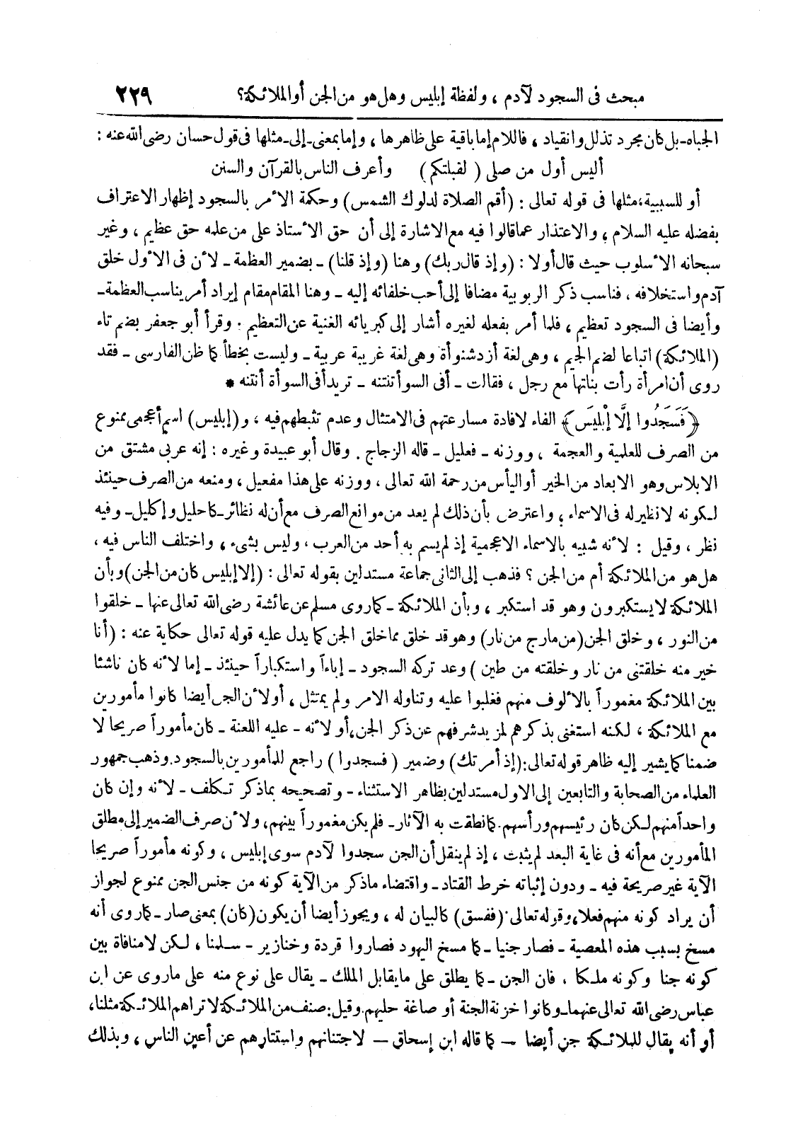 فسجدوا إلا إبليس الفاء لإفادة مسارعتهم في الإمتثال وعدم تثبطهم فيه و إبليس أسم أعجمي ممنوع من الصرف للعلمية والعجمة ووزنه فعليل قاله الزجاج وقال أبو عبيدة وغيره : إنه عربي مشتق من الإبلاس وهو الأبعاد من الخير أو اليأس من رحمة الله تعالى ووزنه على هذا مفعيل ومنعه من الصرف حينئذ لكونه لا نظير له في الاسماء وأعترض بأن ذلك لم يعد من موانع الصرف مع أن له نظائر كأحليل وإكليل وفيه نظر وقيل : لأنه شبيه بالأسماء الأعجمية إذ لم يسم به أحد من العرب وليس بشيء وأختلف الناس فيه هل هو من الملائكة أم من الجن فذهب إلى الثاني جماعة مستدلين بقوله تعالى : إلا إبليس كان من الجن وبأن الملائكة لا يستكبرون وهو قد أستكبر وبأن الملائكة كما روى مسلم عن عائشة رضي الله تعالى عنها خلقوا من النور وخلق الجن من مارج من نار وهو قد خلق مما خلق الجن كما يدل عليه قوله تعالى حكاية عنه : أنا خير منه خلقتني من نار وخلقته من طين وعد تركه السجود إباءا وإستكبارا حينئذ إما لأنه كان ناشئا بين الملائكة مغمورا بالألوف منهم فغلبوا عليه وتناوله الأمر ولم يمتثل أو لأن الجن أيضا كانوا مأمورين مع الملائكة لكنه أستغنى بذكرهم لمريد شرفهم عن ذكر الجن أو لأنه عليه اللعنة كان مأمورا صريحا لا ضمنا كما يشير إليه ظاهر قوله تعالى : إذ أمرتك وضمير فسجدوا راجع للمأمورين بالسجود وذهب جمهور العلماء من الصحابة والتابعين إلى الأول مستدلين بظاهر الإستثناء وتصحيحه بما ذكر تكلف لأنه وإن كان واحدا منهم لكن كان رئيسهم ورأسهمكما نطقت به الآثار فلم يكن مغمورا بينهم ولأن صرف الضمير إلى مطلق المامورين مع أنه في غاية البعد لم يثبت إذ لم ينقل أن الجن سجدوا لآدم سوى إبليس وكونه مأمورا صريحا الآية غير صريحة فيهودون إثباته خرط القتاد وإقتضاء ما ذكر من الآية كونه من جنس الجن ممنوع لجواز أن يراد كونه منهم فعلا وقوله تعالى ففسق كالبيان له ويجوز أيضا أن يكون كان بمعنى صار كما روى أنه مسخ بسبب هذه المعصية فصار جنيا كما مسخ اليهود فصاروا قردة وخنازير سلمنا لكن لا منافاة بين كونه جنا وكونه ملكا فإن الجنكما يطلق على ما يقابل الملك يقال على نوع منه على ما روى عن إبن عباس رضي الله تعالى عنهما وكانوا خزنة الجنة أو صاغة حليهم وقيل : صنف من الملائكة لا تراهم الملائكة مثلنا أو أنه يقال للملائكة جن أيضاكما قاله إبن إسحاق لإجتنابهم وأستتارهم عن أعين الناس ولذلك