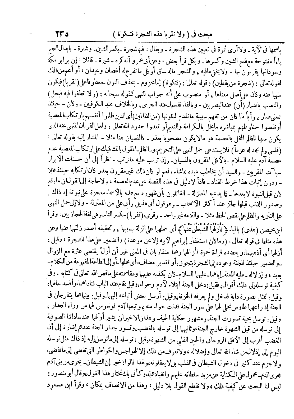 باسمها في الآية ولا أرى ثمرة في تعيين هذه الشجرة ويقال : فيها شجرة بكسر الشين وشيرة بإبدال الجيم ياء مفتوحة مع فتح الشين وكسرها وبكل قرأ بعض وعن أبي عمرو أنه كره شيرة قائلا : إن برابر مكة وسودانها يقرؤن بهاولا يخفى ما فيه والشجر ماله ساق أو كل ما تفرع له أغصان وعيدان أو أعم من ذلك لقوله تعالى : شجرة من يقطين وقوله تعالى : فتكونا إما مجزوم بحذف النون معطوفا على تقربا فيكون منهيا عنه وكان على أصل معناها أو منصوب على أنه جواب للنهي كقوله سبحانه : ولا تطغوا فيه فيحل والنصب بإضمار أن عند البصريين وبالفاء نفسها عند الجرمي وبالخلاف عند الكوفيين وكان حينئذ بمعنى صار وأيا ما كان من تفهم سببية ما تقدم لكونها من الظالمين أي الذين ظلموا أنفسهم بإرتكاب المعصية أو نقصوا حظوظهم بمباشرة ما يخل بالكرامة والنعيم أو تعدوا حدود الله تعالى ولعل القربان المنهي عنه الذي يكون سببا للظلم المخل بالعصمة هو ما لا يكون مصحوبا بعذر كالنسيان هنا مثلا المشار إليه بقوله تعالى : فنسى ولم نجد له عزما فلا يستدعي حمل النهي على التحريم والظلم المقول بالتشكيك على إرتكاب المعصية عدم عصمة آدم عليه السلام بالأكل المقرون بالنسيان وإن ترتب عليه ما ترتب نظرا إلى أن حسنات الأبرار سيآت المقربين وللسيد أن يخاطب عبده بما شاء نعم لو كان ذلك غير مقرون بعذر كان إرتكابه حينئذ مخلا ودون إثبات هذا خرط القتاد فإذا لا دليل في هذه القصة على عدم العصمة ولا حاجة إلى القول إن ما وقع كان قبل النبوة لا بعدها كما يدعيه المعتزلة القائل وبأن ظهوره مع علمه بالأسماء معجزة على نبوته إذ ذاك وصدور الذنب قبلها جائز عند أكثر الأصحاب وهو قول أبي هذيل وأبي علي من المعتزلة ولا إلى حمل النهي على التنزيه والظلم على نقص الحظ مثلا وألتزمه غير واحد وقريء تقربا بكسر التاء وهي لغة الحجازيين وقرأ إبن محيصن هذي بالياء فأزلهما الشيطان عنها أي حملهما على الزلة بسببها وتحقيقه أصدر زلتهما عنها وعن هذه مثلها في قوله تعالى : وما كان إستغفار إبراهيم لأبيه إلا عن موعدة والضمير على هذا للشجرة وقيل : أزلهما أي أذهبهما ويعضده قراءة حمزة فأزالهما وهما متقاربان في المعنى غير أن أزل يقتضي عثرة مع الزوال والضمير حينئذ للجنة وعوده إلى الشجرة بتجوز أو تقدير مضاف أي محلها أو إلى الطاعة المفهومة من الكلام بعيد وإزلاله عليه اللعنةإياهما عليهما السلام كان بكذبه عليهما ومقاسمته على ما قص الله تعالى في كتابه وفي كيفية توسله إلى ذلك أقوال فقيل : دخل الجنة إبتلاء لآدم وحواء وقيل : قام عند الباب فناداهما وأفسد حالهما وقيل : تمثل بصورة دابة فدخل ولم يعرفه الخزنة وقيل : أرسل بعض أتباعه إليهما وقيل : بينما هما يتفرجان في الجنة إذ راعهما طاوس تجلى لهما على سور الجنة فدنت حواء منه وتبعها آدم فوسوس لهما من وراء الجدار وقيل : توسل بحية تسورت الجنة ومشهور حكاية الحية وهذان الأخيران يشير أولهما عند ساداتنا الصوفية إلى توسله من قبل الشهوة خارج الجنة وثانيهما إلى توسله بالغضب وتسور جدار الجنة عندهم إشارة إلى أن الغضب أقرب إلى الأفق الروحاني والحيز القلبي من الشهوة وقيل : توسله إلى ما توسل إليه إذ ذاك مثل توسله اليوم إلى إذلال من شاء الله تعالى وإضلاله ولا نعرف من ذلك إلا الهواجس والخواطر التي تفضي إلى ما تفضي ولا جزم عند كتير في دخول الشيطان في القلب بل لا يعقلونه ولهذا قالوا : خبر إن الشيطان يجري من بني آدم مجرى الدم محمول على الكناية عن مزيد سلطانه عليهم وإنقيادهم له وكأني بك تختار هذا القول وقال أبو منصور : ليس لنا البحث عن كيفية ذلك ولا نقطع القول بلا دليل وهذا من الإنصاف بمكان وقرأ إبن مسعود