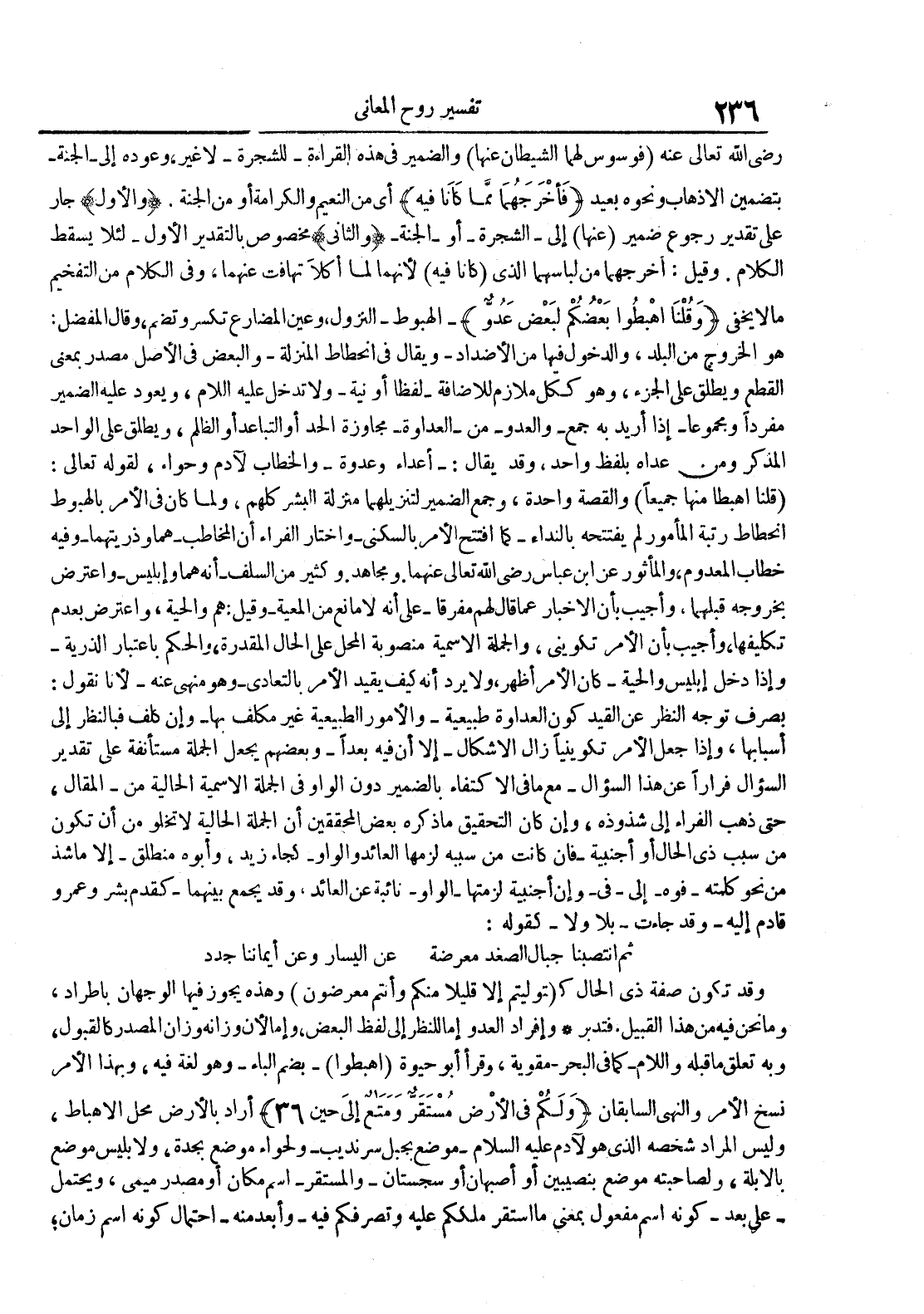 رضي الله تعالى عنه فوسوس لهما الشيطان عنها والضمير في هذه القراءة للشجرةلا غير وعوده إلى الجنة بتضمين الأذهاب ونحوه بعيد فأخرجهما مما كانا فيه أي من النعيم والكرامة أو من الجنة والأول جار على تقدير رجوع ضمير عنها إلىالشجرة أو الجنة والثاني مخصوص بالتقدير الأول لئلا يسقط الكلام وقيل : أخرجهما من لباسهما الذي كانا فيه لأنهما لما أكلا تهافت عنهما وفي الكلام من التفخيم ما لا يخفى وقلنا أهبطوا بعضكم لبعض عدو الهبوط وعين المضارع تكسر وتضم وقال المفضل : هو الخروج من البلد والدخول فيها من الأضداد ويقال في إنحطاط المنزلة والبعض في الأصل مصدر بمعنى القطع ويطلق على الجزء وهو ككل ملازم للإضافة لفظا أو نية ولا تدخل عليه اللام ويعود عليه الضمير مفردا ومجموعا إذا أريد به جمع والعد ومن العداوة مجا الحد أو التباعد أو الظلم ويطلق على الواحد المذكر ومن عداه بلفظ واحد وقد يقال : أعداء وعدوة والخطاب لآدم وحواء لقوله تعالى : قلنا أهبطا منها جميعا والقصة واحدة وجمع الضمير لتزيلهما منل البشر كلهم ولما كان في الأمر بالهبوط إنحطاط رتبة المأمور لم يفتتحه بالنداء كما أفتتح الأمر بالسكنى وأختار الفراء أن المخاطبهما وذريتهما وفيه خطاب المعدوم والمأثور عن إبن عباس رضي الله تعالى عنهما ومجاهد وكثير من السلف أنه هما وإبليس وأعترض بخروجه قبلهما وأجيب بأن الأخبار عما قال لهم مفرقا على أنه لا مانع من المعية وقيل : هم والحية وأعترض بعدم تكليفها وأجيب بأن الأمر تكويني والجملة الأسمية منصوبة المحل على الحال المقدرة والحكم بإعتبار الذرية وإذا دخل إبليس والحية كان الأمر أظهر ولا يرد أنه كيف يقيد الأمر بالتعادي وهو منهي عنه لأنا نقول بصرف توجه النظر عن القيد كون العداوة طبيعية والأمور الطبيعية غير مكلف بها وإن كلف فبالنظر إلى أسبابها وإذا جعل الأمر تكوينيا زال الأشكال إلا أن فيه بعدا وبعضهم يجعل الجملة مستأنفة على تقدير السؤال فرارا عن هذا السؤال مع ما في الإكتفاء بالضمير دون الواو في الجملة الأسمية الحالية من المقال حتى ذهب الفراء إلى شذوذه وإن كان التحقيق ما ذكره بعض المحققين أن الجملة الحالية لا تخلو من أن تكون من سبب ذي الحال أو أجنبية فإن كانت من سببه لزمها العائد والواو كجاء زيد وأبوه منطلق إلا ما شذ من نحو كلمته فوه إلى في وإن أجنبية لزمتها الواو نائبة عن العائد وقد يجمع بينهما كقدم بشر وعمرو قادم إليه وقد جاءت بلا ولا كقوله : ثم إنتصبنا جبال الصغد معرضة عن اليسار وعن أيماننا جدد وقد تكون صفة ذي الحال ك توليتم إلا قليلا منكم وأنتم معرضون وهذه يجوز فيها الوجهان بإطراد وما نحن فيه من هذا القبيل فتدبر