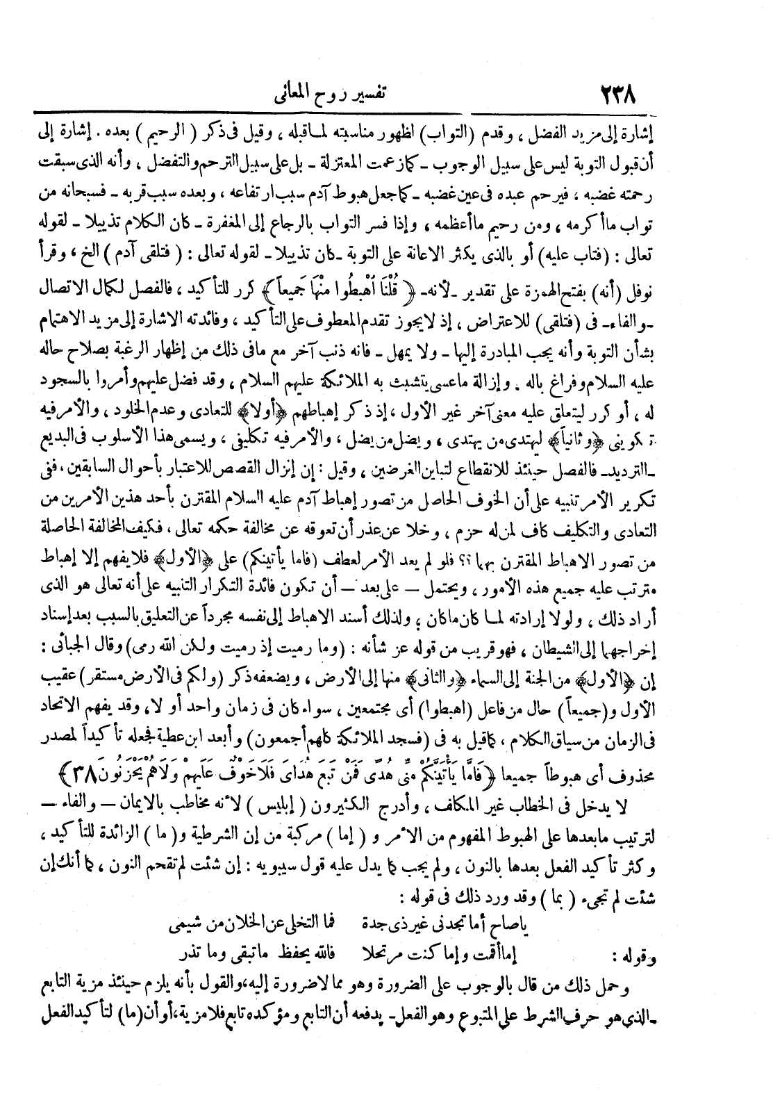 إشارة إلى مزيد الفضل وقدم التواب لظهور مناسبته لما قبله وقيل في ذكر الرحيم بعده إشارة إلى أن قبول التوبة ليس على سبيل الوجوب كما زعمت المعتزلة بل على سبيل الترحم والتفضل وأنه الذي سبقت رحمته غضبه فيرحم عبده في عين غضبهكما جعل هبوط آدم سبب إرتفاعه وبعده سبب قربه فسبحانه من تواب ما أكرمه ومن رحيم ماأعظمه وإذا فسر التواب بالرجاع إلى المغفرةكان الكلام تذييل القوله تعالى : فتاب عليه أو بالذي يكثر الإعانة على التوبة كان تذييل القوله تعالى : فتلقى آدم إلخ وقرأ نوفل أنه بفتح الهمزة على تقديرلأنه قلنا أهبطوا منها جميعا كرر للتأكيد فالفصل لكمال الإتصال والفاء في فتلقى للإعتراض إذ لا يجوز تقدم المعطوف على التأكيد وفائدته الإشارة إلى مزيد الإهتمام بشأن التوبة وأنه يجب المبادرة إليها ولا يمهل فإنه ذنب آخر مع ما في ذلك من إظهار الرغبة بصلاح حاله عليه السلام وفراغ باله وإزالة ما عسى يتشبث به الملائكة عليهم السلام وقد فضل عليهم وأمروا بالسجود له أو كرر ليتعلق عليه معنى آخر غير الأول إذ ذكر إهباطهم أولا للتعادي وعدم الخلود والأمر فيه تكويني وثانيا ليهتدي من يهتدي ويضل من يضل والأمر فيه تكليفي ويسمى هذا الأسلوب في البديع الترديد فالفصل حينئذ للإنقطاع لتباين الغرضين وقيل : إن إنزال القصص للإعتبار بأحوال السابقين ففي تكرير الأمر تنبيه على أن الخوف الحاصل من تصور إهباط آدم عليه السلام المقترن بأحد هذين الأمرين من التعادي والتكليف كاف لمن له حزم وخلا عن عذر أن تعوقه عن مخالفة حكمه تعالى فيكف المخالفة الحاصلة من تصور الإهباط المقترن بهما فلو لم يعد الأمر لعطف فأما يأتينكم على الأول فلا يفهم إلا إهباط مترتب عليه جميع هذه الأمور ويحتمل على بعد أن تكون فائدة التكرار التنبيه على أنه تعالى هو الذي أراد ذلك ولولا إرادته لما ما كان ولذلك أسند الإهباط إلى نفسه مجردا عن التعليق بالسبب بعد إسناد إخراجهما إلى الشيطان فهو قريب من قوله عز شأنه : وما رميت إذ رميت ولكن الله رمى وقال الجبائي : إن الأول من الجنة إلى السماء والثاني منها إلى الأرض ويضعفه ذكر ولكم في الأرض مستقر عقيب الأول و جميعا حال من فاعل أهبطوا أي مجتمعين سواء كان في زمان واحد أو لا وقد يفهم الإتحاد في الزمان من سياق الكلام كما قيل به في فسجد الملائكة كلهم أجمعون وأبعد إبن عطية فجعله تأكيدا لمصدر محذوف أي هبوطا جميعا فأما يأتينكم مني هدى فمن تبع هداي فلا خوف عليهم ولا هم يحزنون 83 لا يدخل في الخطاب غير المكلف وأدرج الكثيرون إبليس لأنه مخاطب بالإيمان والفاء لترتيب ما بعدها على الهبوط المفهوم من الامر و إما مركبة من إن الشرطية و ما الزائدة للتأكيد وكثر تأكيد الفعل بعدها بالنون ولم يجب كما يدل عليه قول سيبويه : إن شئت لم تقحم النون كما أنك إن شئت لم تجيء بما وقد ورد ذلك في قوله : يا صاح أما تجدني غير ذي جدة فما التخلي عن الخلان من شيمي وقوله : إما أقمت وإما كنت مرتحلا فالله يحفظ ما تبقى وما تذر وحمل ذلك من قال بالوجوب على الضرورة وهو مما لا ضرورة إليه والقول بأنه يلزم حينئذ مزية التابع الذي هو حرف الشرط على المتبوع وهو الفعل يدفعه أن التابع ومؤكده تابع فلا مزية أو أن ما لتأكيد الفعل