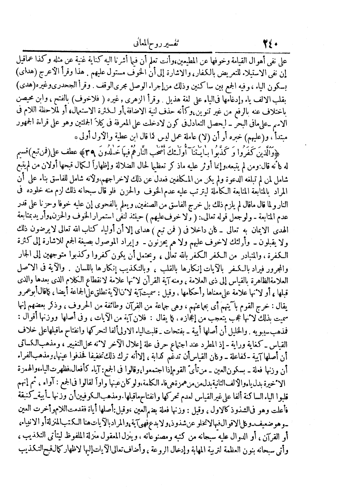 والذين كفروا وكذبوا بآياتنا أولئك أصحاب النار هم فيها خالدون 93 عطف على فمن تبع قسيم له كأنه قال : ومن لم يتبعه وإنما أوثر عليه ما ذكر تعظيما لحال الضلالة وإظهارا لكمال قبحها أو لأن من لم يتبع شامل لمن لم تبلغه الدعوة ولم يكن من المكلفين فعدل عن ذلك لإخراجهم ولأنه شامل للفاسق بناء على أن المراد بالمتابعة المتابعة الكاملة ليترتب عليه عدم الخوف والحزن فلو قال سبحانه ذلك لزم منه خلوده في النار ولما قال ما قال لم يلزم ذلك بل خرج الفاسق من الصنفين ويعلم بالفحوى إن عليه خوفا وحزنا على قدر عدم المتابعة ولو جعل قوله تعالى : ولا خوف عليهم حينئذ لنفى إستمرار الخوف والحزن وأريد بمتابعة الهدى الإيمان به تعالى كان داخلا في فمن تبع هداي إلا أن أولياء كتاب الله تعالى لا يرضون ذلك ولا يقبلون وأولئك لا خوف عليهم ولا هم يحزنون ويراد الموصول بصيغة الجمع للإشارة إلى كثرة الكفرة والمتبادر من الكفر الكفر بالله تعالى ويحتمل أن يكون كفروا وكذبوا متوجهين إلى الجار والمجرور فيراد بالكفر بالآيات إنكارها بالقلب وبالتكذيب إنكارها باللسان والآية في الأصل العلامة الظاهرة بالقياس إلى ذي العلامة ومنه آية القرآن لأنها علامة لإنقطاع الكلام الذي بعدها والذي قبلها أو لأنها علامة على معناها وأحكامها وقيل : سميت آية لأن الآية تطلق على الجماعة أيضا كما قال أبو عمرو يقال : خرج القوم بآيتهم أي بجماعتهم وهي جماعة من القرآن وطائفة من الحروف وذكر بعضهم إنها سميت بذلك لأنها عجب يتعجب من إعجازه كما يقال : فلان آية من الآيات وفي أصلها ووزنها أقوال : فمذهب سيبويه والخليل أن اصلها آيبة بفتحات قلبت الياء ألفا لتحركها وإنفتاح ما قبلها على خلاف القياس كغاية وراية إذ المطرد عند إجتماع حرفي علة إعلال الآخر لأنه محل التغيير ومذهب الكسائي أن أصلها آيية كفاعلة وكان القياس أن تدغم كدابة إلا أنه ترك ذلك تخفيفا فحذفوا عينها ومذهب الفراء أن وزنها فعلة بسكون العينمن تأى القوم إذا أجتمعوا وقالوا في الجمع : آياء كأفعال فظهرت الياء والهمزة الأخيرة بدل ياء والألف الثانية بدل من من همزة هي فاء الكلمة ولو كان عينها واوا لقالوا في الجمع : آواء ثم إنهم قلبوا الياء الساكنة ألفا على غير القياس لعدم تحركها وإنفتاح ما قبلها ومذهب الكوفيين أن وزنها آيية كنبقة فأعلت وهو في الشذوذ كالأول وقيل : وزنها فعلة بضم العين وقيل : أصلها أياة فقدمت اللام وأخرت العين وهو ضعيف وكل الأقوال فيها لا تخلو عن شذوذ ولا بدع في آية والمراد بالآيات هنا الكتب المنزلة أو الأنبياء أو القرآن أو الدوال عليه سبحانه من كتبه ومصنوعاته وينزل المعقول منزلة الملفوظ ليتأتى التكذيب وأتى سبحانه بنون العظمة لتربية المهابة وإدخال الروعة وأضاف تعالى الآيات إليها لإظهار كمال قبح التكذيب