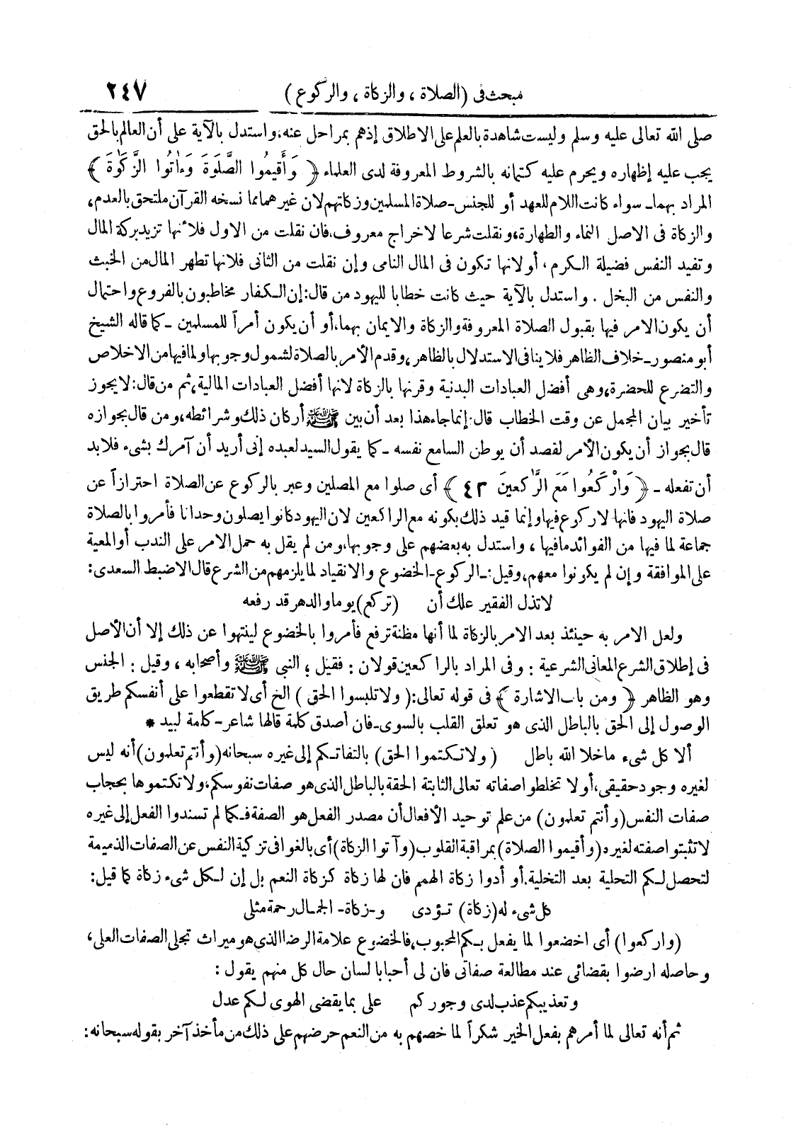 صلى الله تعالى عليه وسلم وليست شاهدة بالعلم على الأطلاق إذ هم بمراحل عنه وأستدل بالآية على أن العالم بالحق يجب عليه إظهاره ويحرم عليه كتمانه بالشروط المعروفة لدى العلماء وأقيموا الصلاة وأتوا الزكاة المراد بهما سواء كانت اللام للعهد أو للجنس صلاة المسلمين وزكاتهم لأن غيرهما مما نسخه القرآن ملتحق بالعدم والزكاة في الأصل النماء والطهارة ونقلت شرعا لإخراج معروف فإن نقلت من الأول فلأنها تزيد بركة المال وتفيد النفس فضيلة الكرم أو لأنها تكون في المال النامي وإن نقلت من الثاني فلأنها تطهر المال من الخبث والنفس من البخل وأستدل بالآية حيث كانت خطابا لليهود من قال : إن الكفار مخاطبون بالفروع وإحتمال أن يكون الأمر فيها بقبول الصلاة المعروفة والزكاة والإيمان بهما أو أن يكون أمرا للمسلمين كما قاله الشيخ أبو منصور خلاف الظاهر فلا ينافي الإستدلال بالظاهر وقدم الأمر بالصلاة لشمول وجوبها ولما فيها من الإخلاص والتضرع للحضرة وهي أفضل العبادات البدنية وقرنها بالزكاة لأنها أفضل العبادات المالية ثم من قال : لا يجوز تأخير بيان المجمل عن وقت الخطاب قال : إنما جاء هذا بعد أن بين أركان ذلك وشرائطه ومن قال بجوازه قال بجواز أن يكون الأمر لقصد أن يوطن السامع نفسه كما يقول السيد لعبده إني أريد أن آمرك بشيء فلا بد أن تفعله وأركعوا مع الركعين 34 أي صلوا مع المصلين وعبر بالركوع عن الصلاة إحترازا عن صلاة اليهود فإنها لا ركوع فيها وإنما قيد ذلك بكونه مع الراكعين لأن اليهود كانوا يصلون وحدانا فأمروا بالصلاة جماعة لما فيها من الفوائد ما فيها وأستدل به بعضهم على وجوبها ومن لم يقل به حمل الأمر على الندب أو المعية على الموافقة وإن لم يكونوا معهم وقيل : الركوع الخضوع والإنقياد لما يلزمهم من الشرع قال الأضبط السعدي : لا تذل الفقير علك أن تركع يوما والدهر قد رفعه ولعل الأمر به حينئذ بعد الأمر بالزكاة لما أنها مظنة ترفع فأمروا بالخضوع لينتهوا عن ذلك إلا أن الأصل في إطلاق الشرع المعاني الشرعية : وفي المراد بالراكعين قولان : فقيل النبي وأصحابه وقيل : الجنس وهو الظاهر ومن باب الإشارة في قوله تعالى : ولا تلبسوا الحق إلخ أي لا تقطعوا على أنفسكم طريق الوصول إلى الحق بالباطل الذي هو تعلق القلب بالسوي فإن أصدق كلمة قالها شاعر كلمة لبيد