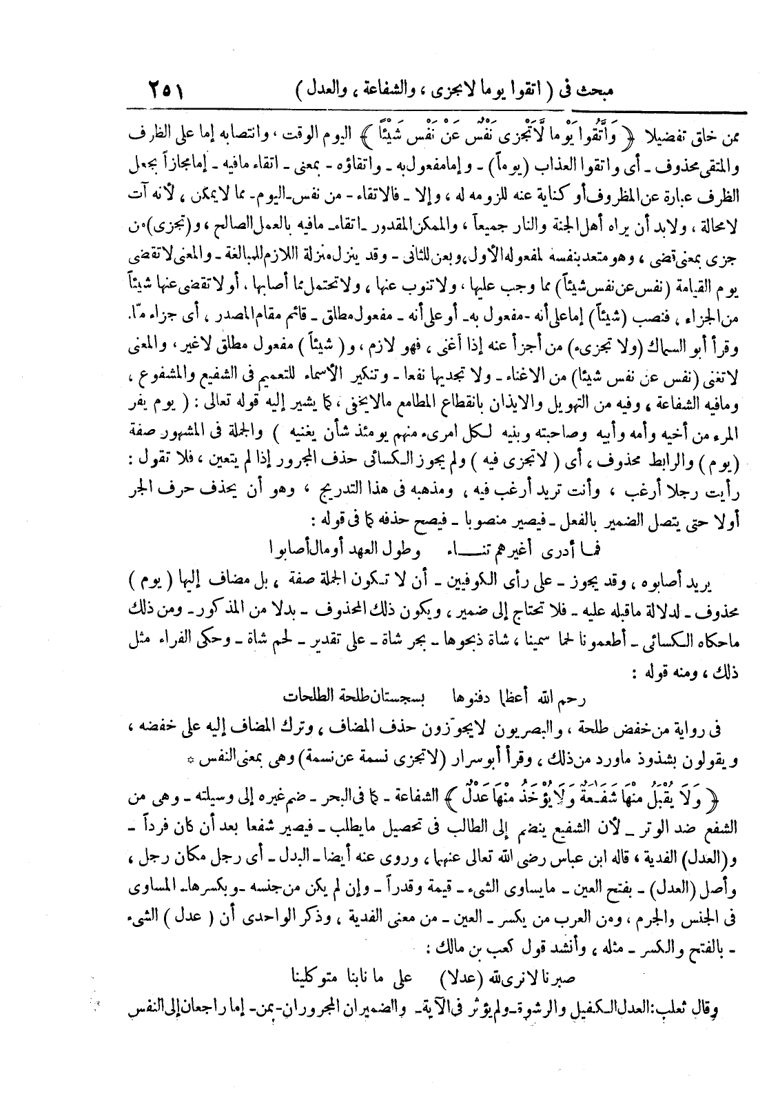 ممن خلق تفضيلا وأتقوا يوما لا تجزي نفس عن نفس شيئا اليوم الوقت وإنتصابه إما على الظرف والمتقي محذوف أي وأتقوا العذاب يوما وإما مفعول به وإتقاؤه بمعنى إتقاء ما فيه إما مجازا بجعل الظرف عبارة عن المظروف أو كناية عنه للزومه له فالإتقاء من نفسا ليوم مما لا يمكن لأنه آت لا محالة ولا بد أن يراه أهل الجنة والنار جميعا والممكن المقدور إتقاءما فيه بالعمل الصالح و تجزي من جزى بمعنى قضى وهو متعد بنفسه لمفعوله الأول وبعن للثاني وقد ينزل منزلة اللازم للمبالغة والمعنى لا تقضي يوم القيامة نفس عن نفس شيئا مما وجب عليها ولا تنوب عنها ولا تحتمل مما أصابها أو لا تقضي عنها شيئا من الجزاء فنصب شيئا إما على أنه مفعول بهأو على أنه مفعول مطلق قائم مقام المصدر أي جزاء ما وقرأ أبو السماك ولا تجزيء من أجزاء عنه إذا أغنى فهو لازم و شيئا مفعول مطلق لا غير والمعنى لا تغني نفس عن نفس شيئا من الإغناء ولا تجديها نفعا وتنكير الأسماء للتعميم في الشفيع والمشفوع وما فيه الشفاعة وفيه من التهويل والإيذان بإنقطاع المطامع ما لا يخفى كما يشير إليه قوله تعالى : يوم يفر المرء منأخيه وأمه وأبيه وصاحبته وبنيه لكل أمريء منهم يومئذ شأن يغنيه والجملة في المشهور صفة يوم والرابط محذوف أي لا تجزي فيه ولم يجوز الكسائي حذف المجرور إذا لم يتعين فلا تقول : رأيت رجلا أرغب وأنت تريد أرغب فيه ومذهبه في هذا التدريج وهو أن يحذف حرف الجر أولا حتى يتصل الضمير بالفعل فيصير منصوبا فيصح حذفه كما في قوله : فما أدري أغيرهم تناء وطول العهد أو مال أصابوا يريد أصابوه وقد يجوز على رأي الكوفيين أن لا تكون الجملة صفة بل مضاف إليها يوم محذوف لدلالة ما قبله عليه فلا تحتاج إلى ضمير ويكون ذلك المحذوف بدلا من المذكورو من ذلك ما حكاه الكسائي أطعمونا لحما سمينا شاة ذبحوها بجر شاة على تقدير لحم شاة وحكى الفراء مثل ذلك ومنه قوله : رحم الله أعظما دفنوها بسجستان طلحة الطلحات في رواية من خفض طلحة والبصريون لا يجوزون حذف المضاف وترك المضاف إليه على خفضه ويقولون بشذوذ ما ورد من ذلك وقرأ أبو سرار لا تجزي نسمة عن نسمة وهي بمعنى النفس