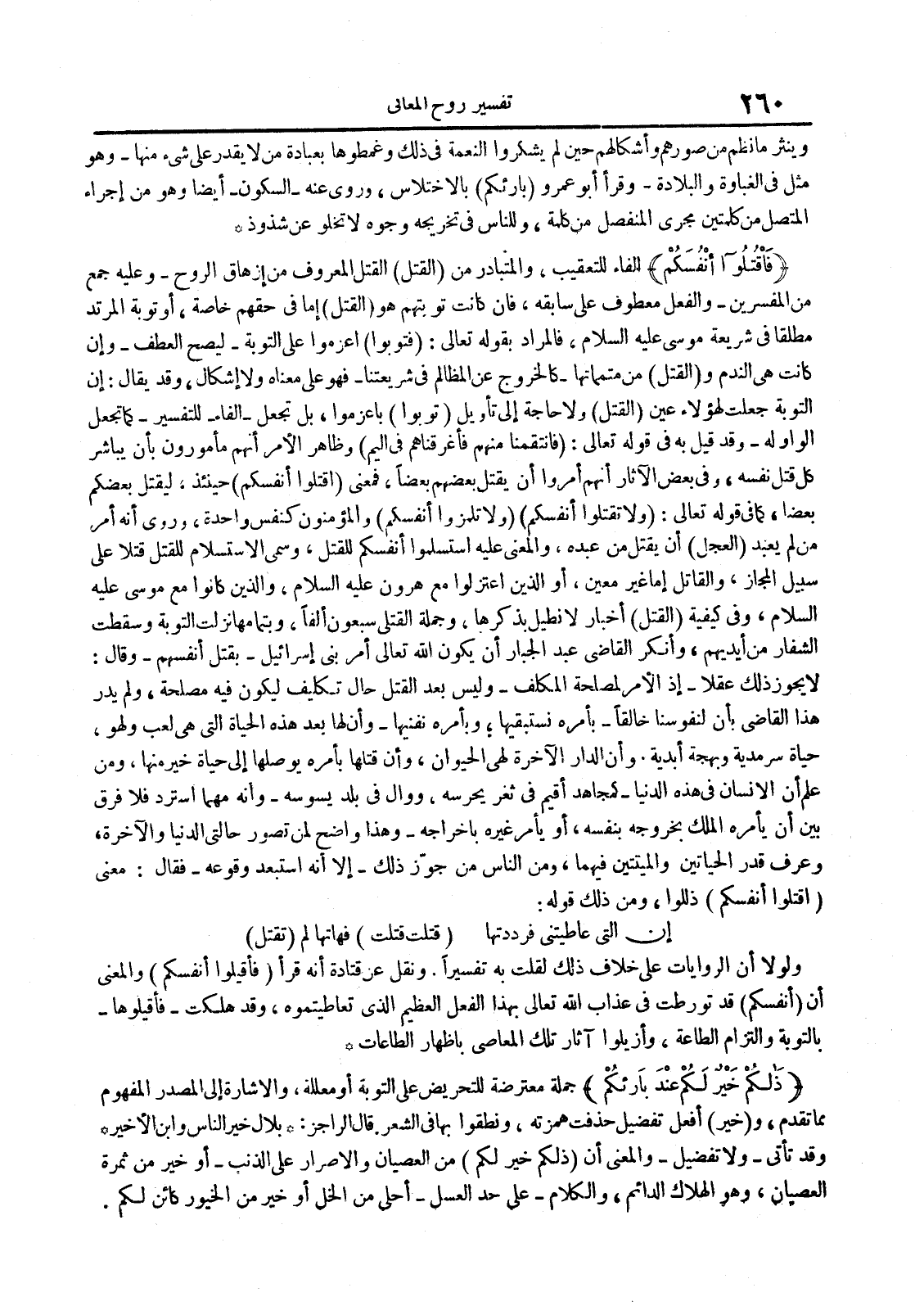 فأقتلوا أنفسكم الفاء للتعقيب والمتبادر من القتل القتل المعروف من إزهاق الروحوعليه جمع من المفسرينوالفعل معطوف على سابقه فإن كانت توبتهم هو القتل إما في حقهم خاصة أو توبة المرتد مطلقا في شريعة موسى عليه السلام فالمراد بقوله تعالى : فتوبوا أعزموا على التوبة ليصح العطف وإن كانت هي الندم و القتل من متمماتها كالخروج عن المظالم في شريعتنا فهو على معناه ولا إشكال وقد يقال : إن التوبة جعلت لهؤلاء عين القتل ولا حاجة إلى تأويل توبوا بأعزموا بل تجعل الفاء للتفس تجعل الواو له وقد قيل به في قوله تعالى : فأنتقمنا منهم فأغرقناهم في اليم وظاهر الأمر أنهم مأمورون بأن يباشر كل قتل نفسه وفي بعض الآثار أنهم أمروا أن يقتل بعضهم بعضا فمعنى أقتلوا أنفسكم حينئذ ليقتل بعضكم بعضا كما في قوله تعالى : ولا تقتلوا أنفسكم ولا تلمزوا أنفسكم والمؤمنون كنفس واحدة وروى أنه أمر من لم يعبد العجل أن يقتل من عبده والمعنى عليه أستسلموا أنفسكم للقتل وسمى الإستسلام للقتل قتلا على سبيل المجاز والقاتل إما غير معين أو الذين أعتزلوا لواسع هرون عليه السلام والذين كانوا مع موسى عليه السلام وفي كيفية القتل أخبار لا نطيل بذكرها وجملة القتلى سبعون ألفا وبتمامها نزلت التوبة وسقطت الشفار من أيديهم وأنكر القاضي عبدالجبار أن يكون الله تعالى أمر بني إسرائيل بقتل أنفسهم وقال : لا يجوز ذلك عقلا إذ الأمر لمصلحة المكلف وليس بعد القتل حال تكليف ليكون فيه مصلحة ولم يدر هذا القاضي بأن لنفوسنا خالقا بأمره نستبقيها وبأمره نفنيها وأن لها بعد هذه الحياة التي هي لعب ولهو حياة سرمدية وبهجة أبدية وأن الدار الآخرة لهي الحيوان وأن قتلها بأمره يوصلها إلى حياة خير منها ومن علم أن الإنسان في هذه الدنيا كمجاهد أقيم في ثغر يحرسه ووال في بلد يسوسه وأنه مهما أسترد فلا فرق بين أن يأمره الملك بخروجه بنفسه أو يأمر غيره بإخراجه وهذا واضح لمن تصور حالتي الدنيا والآخرة وعرف قدر الحياتين والميتتين فيهما ومن الناس من جوز ذلك إلا أنه إستبعد وقوعه فقال : معنى أقتلوا أنفسكم ذللوا ومن ذلك قوله : إن التي عاطيتني فرددتها قتلت قتلت فهاتها لم تقتل ولولا أن الروايات على خلاف ذلك لقلت به تفسيرا ونقل عن قتادة أنه قرأ فأقيلوا أنفسكم والمعنى أن أنفسكم قد تورطت في عذاب الله تعالى بهذا الفعل العظيم الذي تعاطيتموه وقد هلكت فأقيلوها بالتوبة وإلتزام الطاعة وأزيلوا آثار تلك المعاصي بإظهار الطاعات