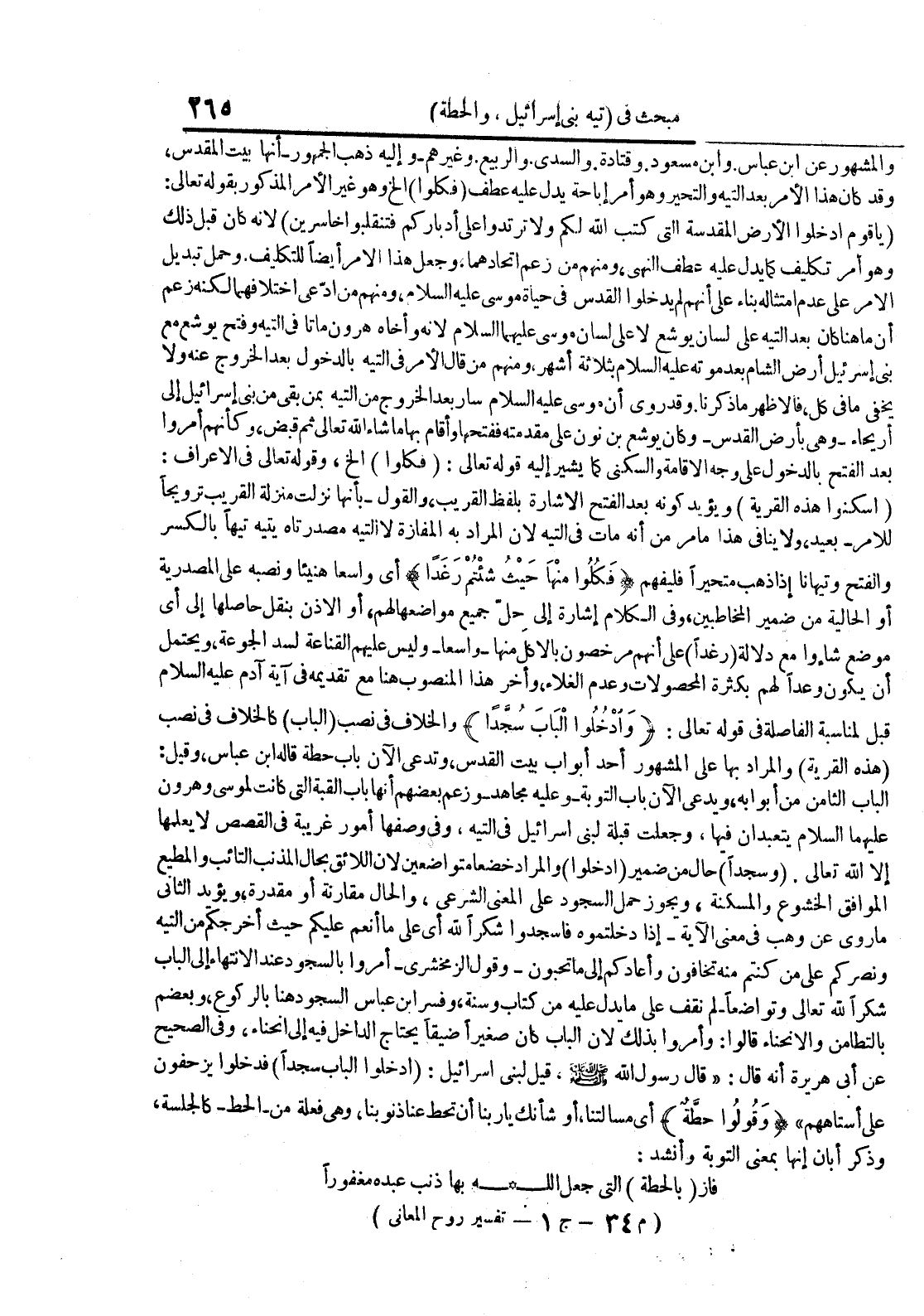والمشهور عن إبن عباس وإبن مسعود وقتادة والسدي والربيع وغيرهم وإليه ذهب الجمهور أنها بيت المقدس وقد كان هذا الأمر بعد التيه والتحير وهو أمر إباحة يدل عليه عطف فكلوا إلخ وهو غير الأمر المذكور بقوله تعالى : يا قوم أدخلوا تلأرض المقدسة التي كتب الله لكم ولا ترتدوا على أدباركم فتنقلبوا خاسرين لأنه كان قبل ذلك وهو أمر تكليف كما يدل عليه عطف النهي ومنهم من زعم إتحادهما وجعل هذا الأمر أيضا للتكليف وحمل تبديل الأمر على عدم إمتثاله بناء على أنهم لم يدخلوا القدس في حياة موسى عليه السلام ومنهم من أدعى إختلافهما لكنه زعم أن ما هنا كان بعد التيه على لسان يوشع لا على لسان موسى عليهما السلام لأنه وأخاه هرون ماتا في التيه وفتح يوشع مع بني إسرائيل أرض الشام بعد موته عليه السلام بثلاثة أشهر ومنهم من قال الأمر في التيه بالدخول بعد الخروج عنه ولا يخفى ما في كل فالأظهر ما ذكرنا وقد روى أن موسى عليه السلام سار بعد الخروج من التيه بمن بقى من بني إسرائيل إلى أريحاء وهي بأرض القدس وكان يوشع بن نون على مقدمته ففتحها وأقام بها ما شاء الله تعالى ثم قبض وكأنهم أمروا بعد الفتح بالدخول على وجه الإقامة والسكنى كما يشير إليه قوله تعالى : فكلوا إلخ وقوله تعالى في الأعراف : أسكنوا هذه القرية ويؤيد كونه بعد الفتح الشارة بلفظ القريب والقول بأنها نزلت منزلة القريب ترويجا للأمر بعيد ولا ينافي هذا ما مر من أنه مات في التيه لأن المراد به المفازة لا التيه مصدرتاه يتيه تيها بالكسر والفتح وتيهانا إذا ذهب متحيرا فليفهم فكلوا منها حيث شئتم رغدا أي واسعا هنيئا ونصبه على المصدرية أو الحالية من ضمير المخاطبين وفي الكلام آشارة إلى حل جميع مواضعها لهم أو الأذن بنقل حاصلها إلى أي موضع شاؤا مع دلالة رغدا على أنهم مرخصون بالأكل منها واسعا وليس عليهم القناعة لسد الجوعة ويحتمل أن يكون وعدا لهم بكثرة المحصولات وعدم الغلاء وأخر هذا المنصوب هنا مع تقديمه في آية آدم عليه السلام قبل لمناسبة الفاصلة في قوله تعالى : وأدخلوا الباب سجدا والخلاف في نصب الباب كالخلاف في نصب هذه القرية والمراد بها على المشهور أحد أبواب بيت القدس وتدعى الآن باب حطة قاله إبن عباس وقيل : الباب الثامن من أبوابه ويدعى الآن باب التوبة وعليه مجاهد وزعم بعضهم أنها باب القبة التي كانت لموسى وهرون عليهما السلام يتعبدان فيها وجعلت قبلة لبني إسرائيل في التيهؤ في وصفها أمور غريبة في القصص لا يعلمها إلا الله تعالى وسجدا حال من ضمير أدخلوا والمراد خضعا متواضعين لأن اللائق بحال المذنب التائب والمطيع الموافق الخشوع والمسكنة ويجوز حمل السجود على المعنى الشرعي والحال مقارنة أو مقدرة ويؤيد الثاني ما روى عن وهب في معنى الآية إذا دخلتموه فأسجدوا شكرا لله أي على ما أنعم عليكم حيث أخرجكم من التيه ونصركم على من كنتم منه تخافون وأعادكم إلى ما تحبون وقول الزمخشري أمروا بالسجود عند الإنتهاء إلى الباب شكرا لله تعالى وتواضعالم نقف على ما يدل عليه من كتاب وسنة وفسر إبن عباس السجود هنا بالركوع وبعضهم بالتطامن والإنحناء قالوا : وأمروا بذلك لأن الباب كان صغيرا ضيقا يحتاج الداخل فيه إلى إنحناء وفي الصحيح عن أبي هريرة أنه قال : قال رسول الله قيل لبني إسرائيل : أدخلوا الباب سجدا فدخلوا يزحفون على أستاههم وقولوا حطة أي مسألتنا أو شأنك يا ربنا أن تحط عنا ذنوبنا وهي فعلة منا لحط كالجلسة وذكر أبان إنها بمعنى التوبة وأنشد : فاز بالحطة التي جعل الله بها ذنب عبده مغفورا