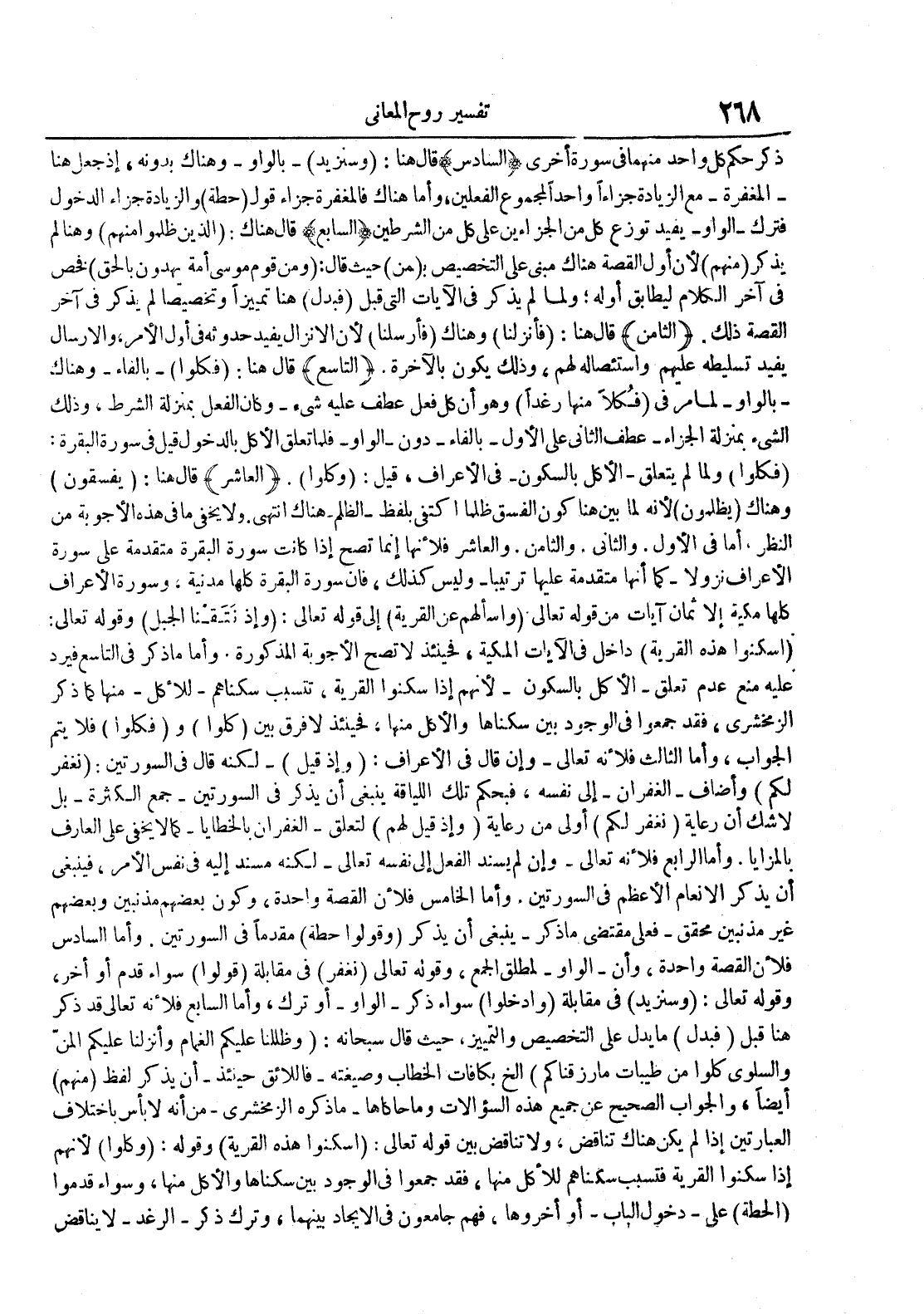 ذكر حكم كل واحد منهما في سورة أخرى السادس قال هنا : وسنزيد بالواو وهناك بدونه إذ جعل هنا المغفرة مع الزيادة جزاءا واحدا لمجموع الفعلين وأما هناك فالمغفرة جزاء قول حطة والزيادة جزاء الدخول فترك الواو يفيد توزع كل من الجزاءين على كل من الشرطين السابع قال هناك : الذين ظلموا منهم وهنا لم يذكر منهم لأن أول القصة هناك مبني على انخصيص ب من حيث قال : ومن قوم موسى أمة يهدون بالحق فخص في آخر الكلام ليطابق أوله ولما لم يذكر في الآيات التي قبل فبدل هنا تمييزا وتخصيصا لم يذكر في آخر القصة ذلك الثامن قال هنا : فأنزلنا وهناك فأرسلنا لأن الإنزال يفيد حدوثه في أول الأمر والإرسال يفيد تسليطه عليهم وإستئصاله لهم وذلك يكون بالآخرة التاسع قال هنا : فكلوا بالفاء وهنا كبال مر في فكلا منها رغدا وهو أن كل فعل عطف عليه شيء وكان الفعل بمنزلة الشرط وذلك الشيء بمنزلة الجزاء عطف الثاني على الأول بالفاء دونا لواو فل تعلق الأكل بالدخول قيل في سورة البقرة : فكلوا ولما لم يتعلق الأكل بالسكون في الأعراف قيل : وكلوا العاشر قال هنا : يفسقون وهناك يظلمون لأنه لما بين هنا كون الفسق ظلما إكتفى بلفظ الظلم هناك إنتهى ولا يخفى ما في هذه الأجوبة من النظر أما في الأول والثاني والثامن والعاشر فلأنها إنما تصح إذا كانت سورة البقرة متقدمة على سورة الأعراف نزولا كما أنها متقدمة عليها ترتيبا وليس كذلك فإن سورة البقرة كلها مدنية وسورة الأعراف كلها مكية إلا ثمان آيات من قوله تعالى وأسألهم عن القرية إلى قوله تعالى : وإذ نتقنا الجبل وقوله تعالى : أسكنوا هذه القرية داخل في الآيات المكية فحينئذ لا تصح الأجوبة المذكورة وأما ما ذكر في التاسع فيرد عليه منع عدم تعلق الأكل بالسكون لأنهم إذا سكنوا القرية تتسبب سكناهم للأكلمنها كما ذكر الزمخشري فقد جمعوا في الوجود بين سكناها والأكل منها فحينئذ لا فرق بين كلوا و فكلوا فلا يتم الجواب وأما الثالث فلأنه تعالى وإن قال في الأعراف : وإذ قيل لكنه قال في السورتين : نغفر لكم وأضاف الغفران إلى نفسه فبحكم تلك اللياقة ينبغي أن يذكر في السورتين جمع الكثرة بل لا شك أن رعاية نغفر لكم أولى من رعاية وإذ قيل لهم لتعلق الغفران بالخطايا كما لا يخفى على العارف بالمزايا وأما الرابع فلأنه تعالى وإن لم يسند الفعل إلى نفسه تعالى لكنه مسند إليه في نفس الأمر فينبغي أن يذكر الأنعام الأعظم في السورتين وأما الخامس فلأن القص واحدة وكون بعضهم مذنبين وبعضهم غير مذنبين محقق فعلى مقتضى ما ذكر ينبغي أن يذكر وقولوا حطة مقدما في السورتين وأما السادس فلأن القصة واحدة وأنالوا ولمطلق الجمع وقوله تعالى نغفر في مقابلة قولوا سواء قدم أو أخر وقوله تعالى : وسنزيد في مقابلة وأدخلوا سواء ذكر الواو أو ترك وأما السابع فلأنه تعالى قد ذكر هنا قبل فبدل ما يدل على التخصيص والتمييز حيث قال سبحانه : وظللنا عليكم الغمام وأنزلنا عليكم المن والسلوى كلوا من طيبات ما رزقناكم إلخ بكافات الخطاب وصيغته فاللائق حينئذ أن يذكر لفظ منهم أيضا والجواب الصحيح عن جميع هذه السؤالات وما حاكاها ما ذكره الزمخشري من أنه لا بأس بإختلاف العبارتين إذا لم يكن هناك تناقض ولا تناقض بين قوله تعالى : أسكنوا هذه القرية وقوله : وكلوا لأنهم إذا سكنوا القرية فتسبب سكناهم للأكل منها فقد جمعوا في الوجود بين سكناها والأكل منها وسواء قدموا الحطة على دخول الباب أو أخروها فهم جامعون في الإيجاد بينهما وترك ذكر الرغد لا يناقض