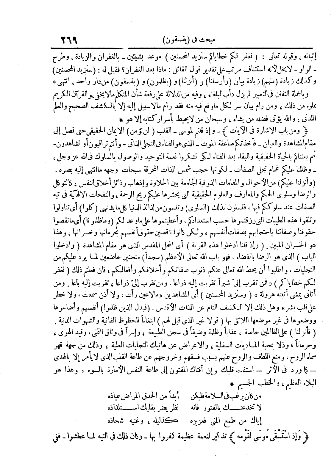 من كان يرغب في السلامة فليكن أبدا من الحدق المراض عياذه لا تخدعنك بالفتور فإنه نظر يضر بقلبك إستلذاذه إياك من طمع المنى فعزيزه كذليله وغنيه شحاذه وإذ استسقى موسى لقومه تذكير لنعمة عظيمة كفروا بها وكان ذلك في التيه لما عطشوا ففي
