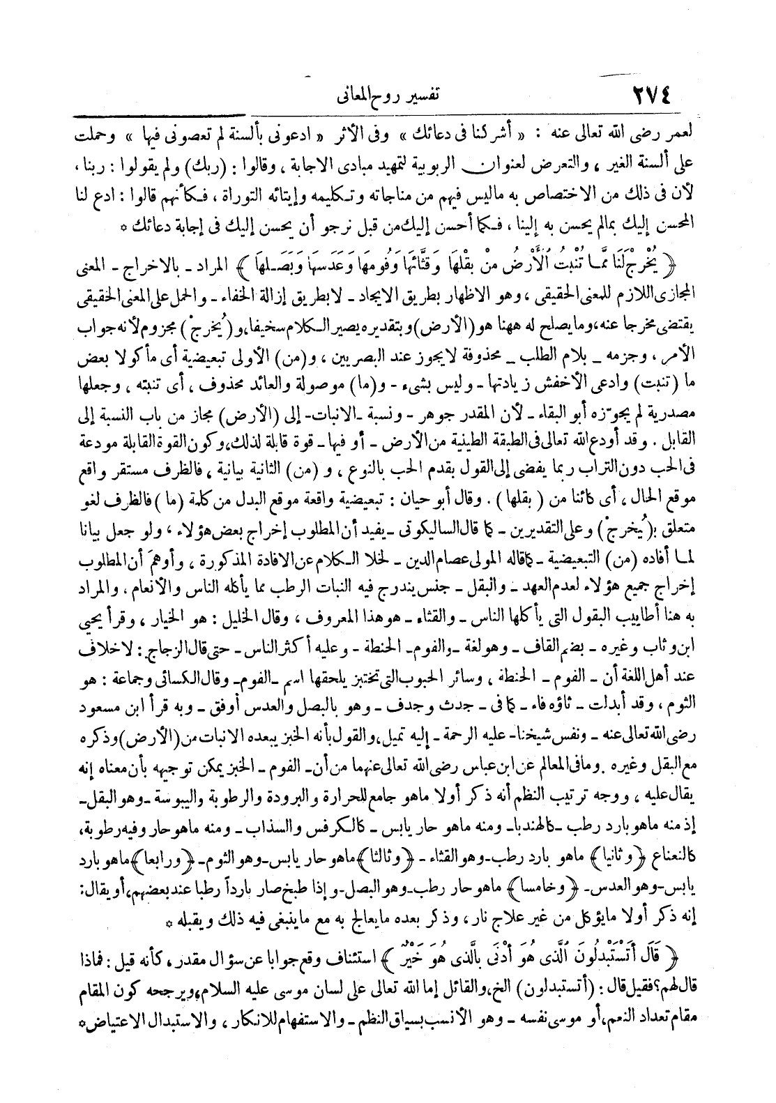يخرج لنا مما تنبت الأرض من بقلها وقثائها وفومها وعدسها وبصلها المراد بالإخراج المعنى المجازي اللازم للمعنى الحقيقي وهو الإظهار بطريق الإيجادلا بطريق إزالة الخفاء والحمل على المعنى الحقيقي يقتضي مخرجا عنه وما يصلح له ههنا هو الأرض وبتقديره يصير الكلام سخيفا و يخرج مجزوم لأنه جواب الأمر وجزمه بلام الطلب محذوفة لا يجوز عند البصريين و من الأولى تبعيضية أي مأكولا بعض ما تنبت وأدعى الأخفش زيادتها وليس بشيء و ما موصولة والعائد محذوف أي تنبته وجعلها مصدرية لم يجوزه أبو البقاء لأن المقدر جوهر ونسبةالإنبات إلى الأرض مجاز من باب النسبة إلى القاب وقد أودع الله تعالى في الطبقة الطينية من الأرض أو فيها قوة قابلة لذلك وكون القوة القابلة مودعة في الحب دون التراب ربما يفضي إلى القول بقدم الحب بالنوع و من الثانية بيانية فالظرف مستقر واقع موقع الحال اي كائنا من بقلها وقال أبو حيان : تبعيضية واقعة موقع البدل من كلمة ما فالظرف لغو متعلق ب يخرج وعلى التقديرين كما قال الساليكوتي يفيد أن المطلوب إخراج بعض هؤلاء ولو جعل بيانا لما أفاده من التبعيضية كما قاله المولى عصام الدينل خلا الكلام عن الإفادة المذكورة وأوهم أن المطلوب إخراج جميع هؤلاء لعدم العهد والبقل جنس يندرج فيه النبات الرطب مما يأكله الناس والأنعام والمراد به هنا أطابيب البقول التي يأكلها الناس والقثاء هو هذا المعروف وقال الخليل : هو الخيار وقرأ يحيى إبن وثاب وغيرهبضم القاف وهو لغة والفو ما لحن أكثر الناس حتى قال الزجاج : لا خلاف عند أهل اللغة أنا لقوما لحنطة وسائر الحبوب التي تختبز يلحقها أسم الفوم وقال الكسائي وجماعة : هو الثوم وقد أدل تثاؤه فاءكما فيجدث وجد ف وهو بالبصل والعدس أو فقو به قرأ إبن مسعود رضي الله تعالى عنه ونفس شيخنا عليه الرحمة إليه تميل والقول بأنه الخبز يبعده الإنبات من الأرض وذكره مع البقل وغيره وما في المعالم عن إبن عباس رضي الله تعالى عنهما منا لقوما لخبز يمكن توجيهه بأن معناه إنه يقال عليه ووجه ترتيب النظم أنه ذكر أولا ما هو جامع للحرارة والبرودة والرطوبة واليبوسة وهو البقل إذ منه ما هو بارد رطب كالهندبا ومنه ما هو حار يابس كالكرفس والسذاب ومنه ما هو حار وفيه رطوبة كالنعناع وثانيا ما هو بارد رطبوه والقثاء وثالثا ما هو حار يابس وهو الثوم ورابعا ما هو بارد يابس وهو العدس وخامسا ما هو حار رطبوه والبصل وإذا طبخ صار باردا رطبا عند بعضهم أو يقال : إنه ذكر أولا ما يؤكل من غير علاج نار وذكر بعده ما يعالج به مع ما ينبغي فيه ذلك ويقبله