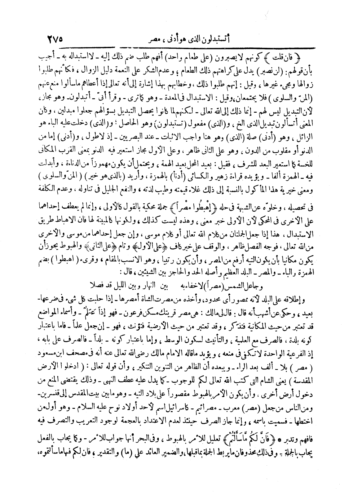 فإن قلت كونهم لا يصبرون على طعام واحد أفهم طلب ضم ذلك إليه لا إستبداله به أجيب بأن قولهم : لن نصبر يدل على كراهتم ذلك الطعام وعدم الشكر على النعمة دليل الزوال فكأنهم طلبوا زوالها ومجيء غيرها وقيل : إنهم طلبوا ذلك وخطابهم بهذا إشارة إلى أنه تعالى إذا أعطاهم ما سألوا منع عنهم المن والسلوى فلا يجتمعان وقيل : الإستبدال في المعدة وهو كما ترى وقرأ أبي أتبدلون وهو مجاز لأن التبديل ليس لهم إنما ذلك إلى الله تعالى لكنهم لما كانوا يحصل التبديل بسؤالهم جعلوا مبدلين وكان المعنى أتسألون تبديل الذي إلخ و الذي مفعول تستبدلون وهو الحاصل و الذي دخلت عليه الباء هو الزائل وهو أدنى صلة الذي وهو هنا واجب الإثبات عند البصريين إذ لا طول و أدنى إما من الدنو أو مقلوب من الدون وهو على الثاني ظاهر وعلى الأول مجاز أستعير فيه الدنو بمعنى القرب المكاني للخسة كما أستعير البعد للشرف فقيل : بعيد المحل بعيد الهمة ويحتمل أن يكون مهموزا من الدناءة وأبدلت فيه الهمزة ألفا ويؤيده قراءة زهير والكسائي أدنا بالهمزة وأريد بالذي هو خير المن والسلوى ومعنى خيرية هذا المأكول بالنسبة إلى ذلك غلاء قيمته وطيب لذته والنفع الجليل في تناوله وعدم الكلفة في تحصيله وخلوه عن الشبهة في حله أهبطوا مصرا جملة محكية بالقول كالأولى وإنما لم يعطف إحداهما على الأخرى في المحكى لأن الأولى خبر معنى وهذه ليست كذلك ولكونها كالمبينة لها فإن الإهباط طريق الإستبدال هذا إذا جعل الجملتان من كلام الله تعالى أو كلام موسى وإن جعل إحداهما من موسى والأخرى من الله تعالى فوجه الفصل ظاهر والوقف على خبر كاف على الأول وتام على الثاني والهبوط يجوزان يكون مكانيا بأن يكون التيه أرفع من المصر وأن يكون رتبيا وهو الأنسب بالمقام وقريء أهبطوا بضم الهمزة والباء والمصرالبلد العظيم وأصله الحد والحاجز بين الشيئين قال : وجاعل الشمس مصرا لإخفاء به بين النهار وبين الليل قد فصلا وإطلاقه على البلد لأنه ممصور أي محدود وأخذه من مصرت الشاة أمصرها إذا حلبت كل شيء في ضرعها بعيد وحكى عن أشهب أنه قال : قال لي مالك : هي مصر قريتك مسكن فرعون فهو إذا علم وأسماء المواضع قد تعتبر من حيث المكانية فتذكر وقد تعتبر من حيث الأرضية فتؤنث فهو إن جعل علما فأما بإعتبار كونه بلدة فالصرف مع العلمية والتأنيث لسكون الوسط وإما بإعتبار كونه بلدا فالصرف على بابه إذ الفرعية الواحدة لا تكفي في منعه ويؤيد ما قاله الإمام مالك رضي الله تعالى عنه أنه في مصحف إبن مسعود مصر بلا ألف بعد الراء ويبعده أن الظاهر من التنوين التنكير وأن قوله تعالى : أدخلوا الأرض المقدسة يعني الشام التي كتب الله تعالى لكم للوجوب كما يدل عليه عطف النهي وذلك يقتضي المنع من دخول أرض أخرى وأن يكون الأمر بالهبوط مقصورا على بلاد التيه وهو ما بين بيت المقدس إلى قنسرين ومن اناس من جعل مصر معرب مصرائيم كإسرائيل أسم لأحد أولاد نوح عليه السلام وهو أول من أختطها فسميت بأسمه وإنما جاز الصرف حينئذ لعدم الإعتداد بالعجمة لوجود التعريب والتصرف فيه فأفهم وتدبر