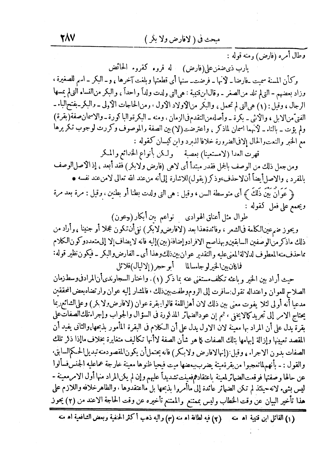 وطال أمره فارض ومنه قوله : يارب ذي ضغن على فارض له قروء كقروء الحائض وكأن المسنة سميت فارضا لأنها فرضت سنه أي قطعتها وبلغت آخرها والبكرأسم للصغيرة وزاد بعضهم التي لم تلد من الصغر وقال إبن قتيبة : هي التي ولدت ولدا واحدا والبكر من النساء التي لم يمسها الرجال وقيل : هي التي لم تحمل والبكر من الأولاد الأول ومن الحاجات الأولى والبكر بفتح الباء الفتى من الإبل والأنثى بكرة وأصله من التقدم في الزمان ومنها لبكرة والباكورة والأسمان صفة بقرة ولم يؤت بالتاءلأنهما أسمان لما ذكر وأعترضت لا بين الصفة والموصوف وكررت لوجوب تكريرها مع الخبر والنعت والحال إلا في الضرورة خلافا للمبرد وإبن كيسان كقوله : قهرت العدا لا مستعينا بعصبة ولكن بأنواع الخدايع والمكر ومن جعل ذلك من الوصف بالجمل فقدر مبتدأ أي لاهي فارض ولا بكر فقد أبعد إذ الأصل الوصف بالمفرد والأصل أيضا أن لا حذف وذكر يقول للإشارة إلى أنه من عند الله تعالى لا من عند نفسه