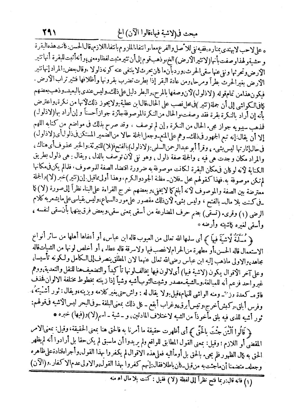 مسلمة لاشية فيها أي سلمها الله تعالى من العيوب قاله إبن عباس أو أعفاها أهلها من سائر أنواع الإستعمال قاله الحسن أو مطهرة من الحرام لا غصب فيها ولا سرقة قاله عطاء أو أخلص لونها من الشيات قاله مجاهد والأولى ما ذهب إليه إبن عباس رضي الله تعالى عنهما لأن المطلق ينصرف إلى الكامل ولكونه تأسيسا وعلى آخر الأقوال يكون لاشية فيهأ 9 أي لا لون فيها يخالف لونها تأكيدا والتضعيف هنا للنقل والتعدية ووهم غير واحد فزعم أنه للمبالغة والشية مصدر وشيت الثوب أشيه وشيا إذا زينته بخطوط مختلفة الألوان فحذف فاؤهكعدة وزر ومنه الواشي للنمام قيل : ولا يقال له : واش حتى يغير كلامه ويزينه ويقال : ثور أشيه وفرس أبلق وكبش أخرج وتيس أبرق وغراب أبقع كل ذلك بمعنى البلقة وفي البحر ليس الأشيه في قولهم : ثور أشيه للذي فيه بلق مأخوذا من الشيه لإختلاف المادتين وشيةأسم لا و فيها خبره